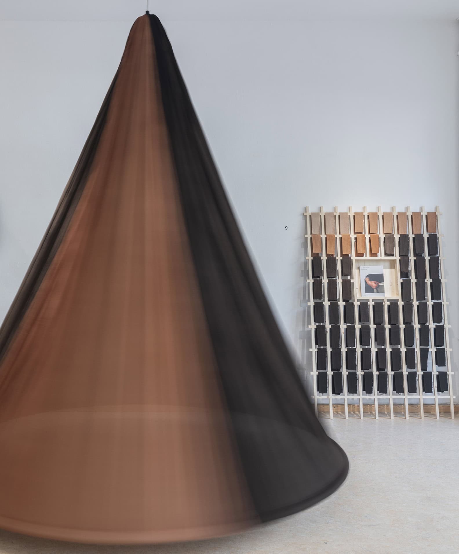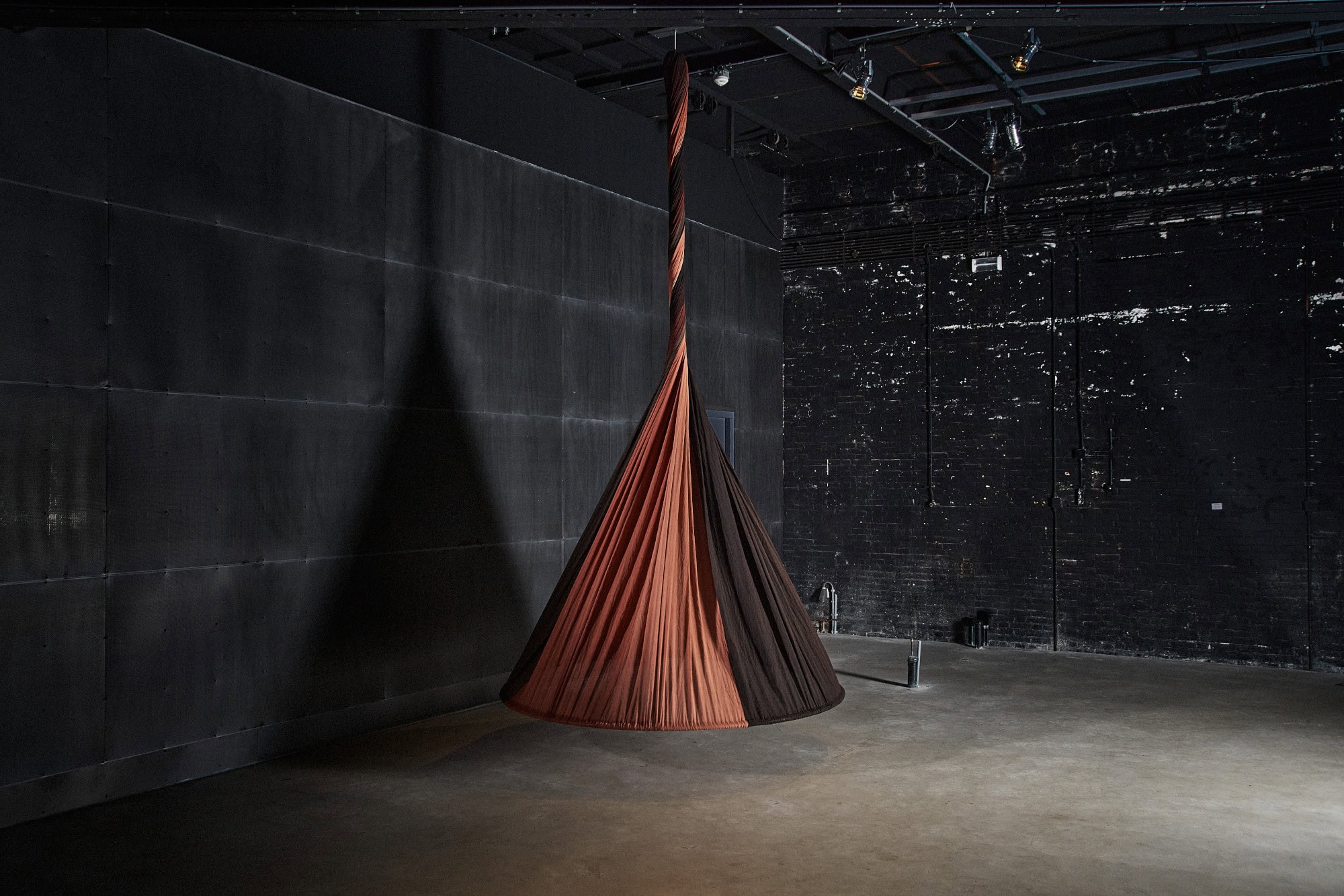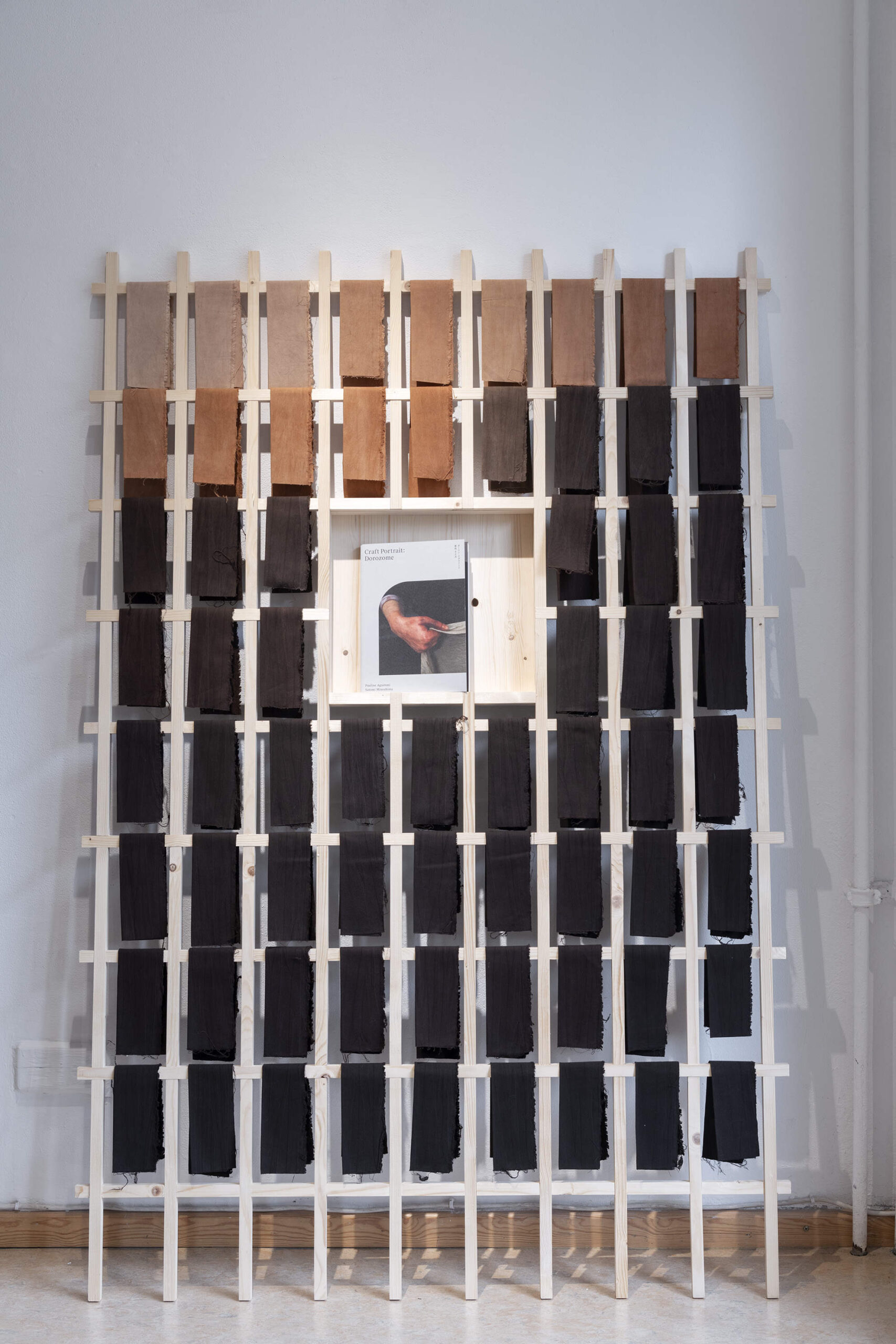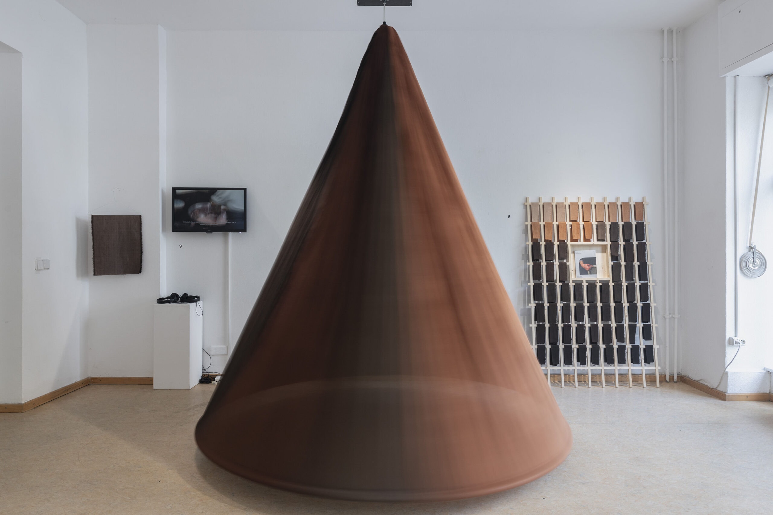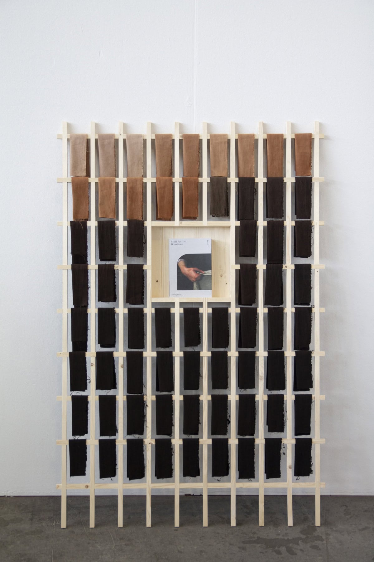 Das Kunst- und Designprojekt Craft Portrait: Dorozome von Pauline Agustoni und Satomi Minoshima untersucht das Färben von Stoffen durch Kunsthandwerker:innen auf der südjapanischen Insel Amami Oshima. Traditionell werden die Seidenfäden für die Kimonoherstellung, die mit Baumwollfäden verwoben sind, zunächst in einem flüssigen Bad aus Baumrinde gefärbt. Anschließend werden sie wiederholt in Schlamm getaucht, bevor die Baumwollfäden entfernt werden, um die ungefärbten Teile des Stoffes freizulegen. Dabei kommt es zu chemischen Reaktionen der Komplexbildung und Oxidation, die zu satten dunkelbraunen und schwarzen Seiden führen. In Zusammenarbeit mit den Kunsthandwerker:innen in Japan haben Agustoni und Minoshima eine Textilskulptur aus rosa-braunen und schwarzen Fäden hergestellt, die sich drehen und winden und so den Akt des Auswringens nachahmen, der ein wesentlicher Bestandteil des Färbeprozesses ist.