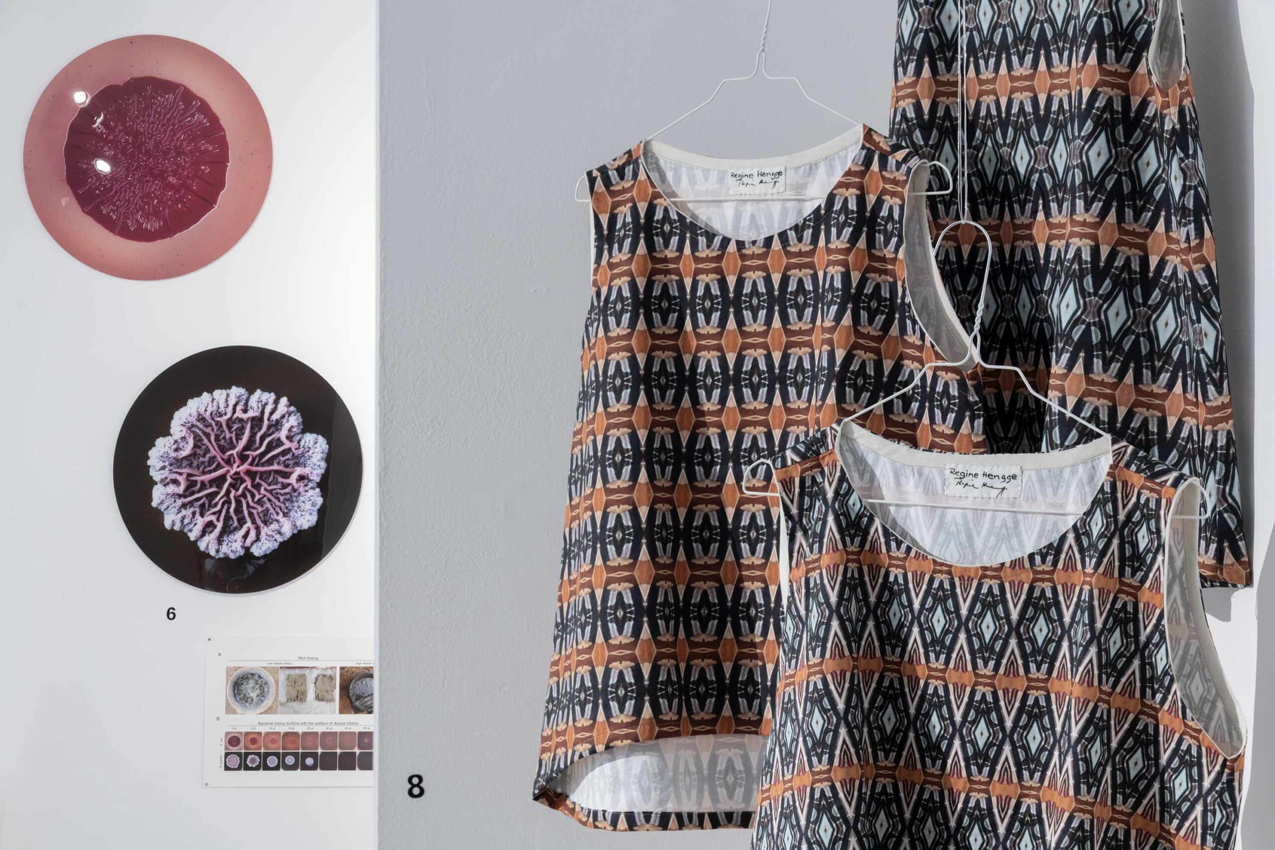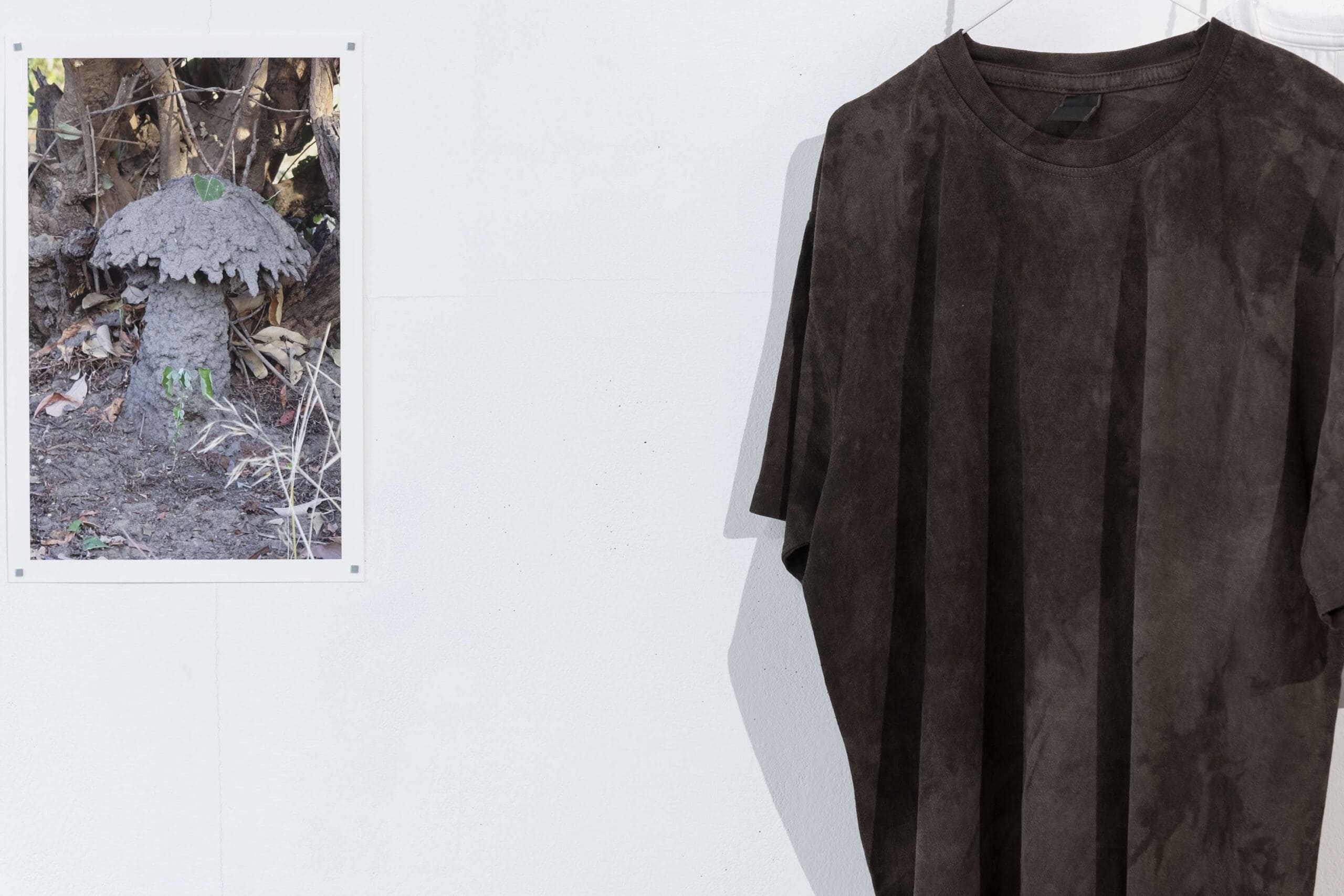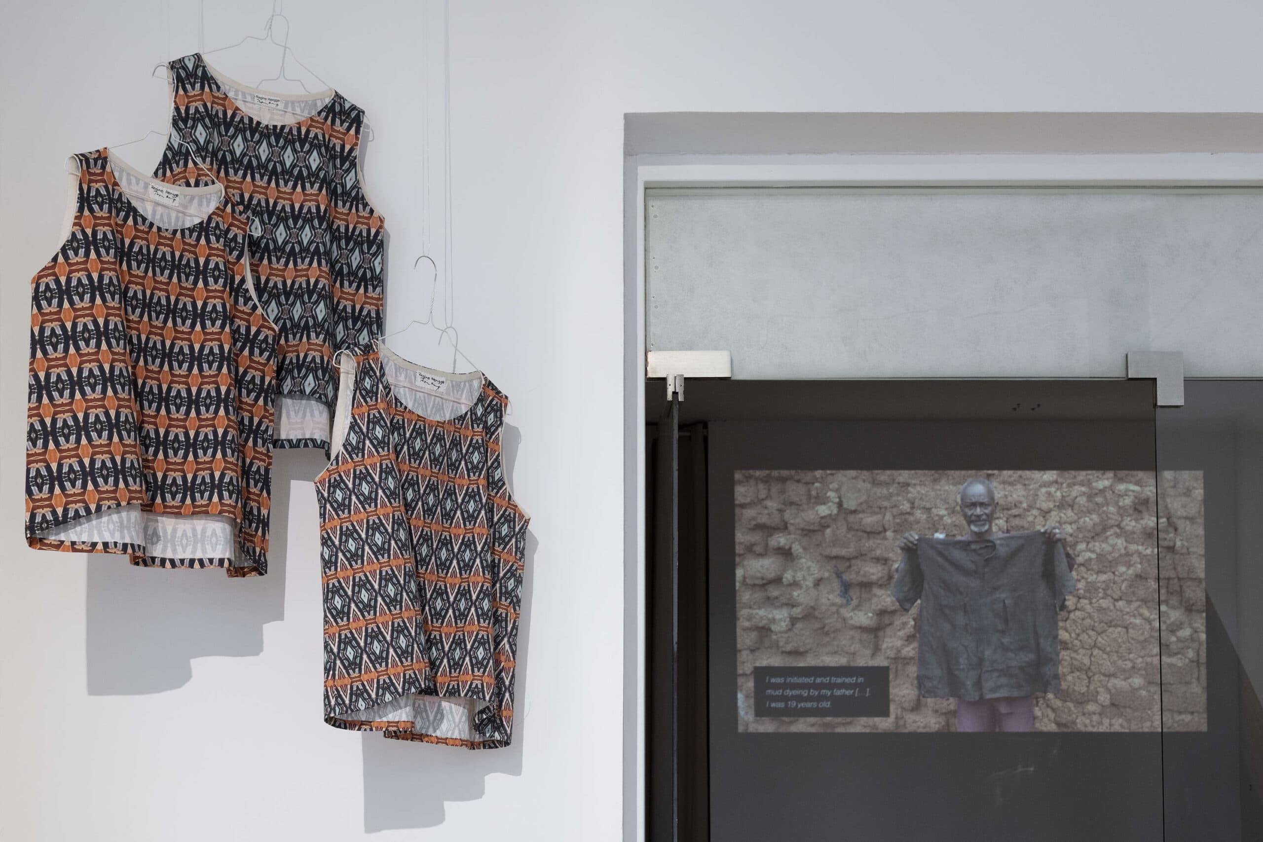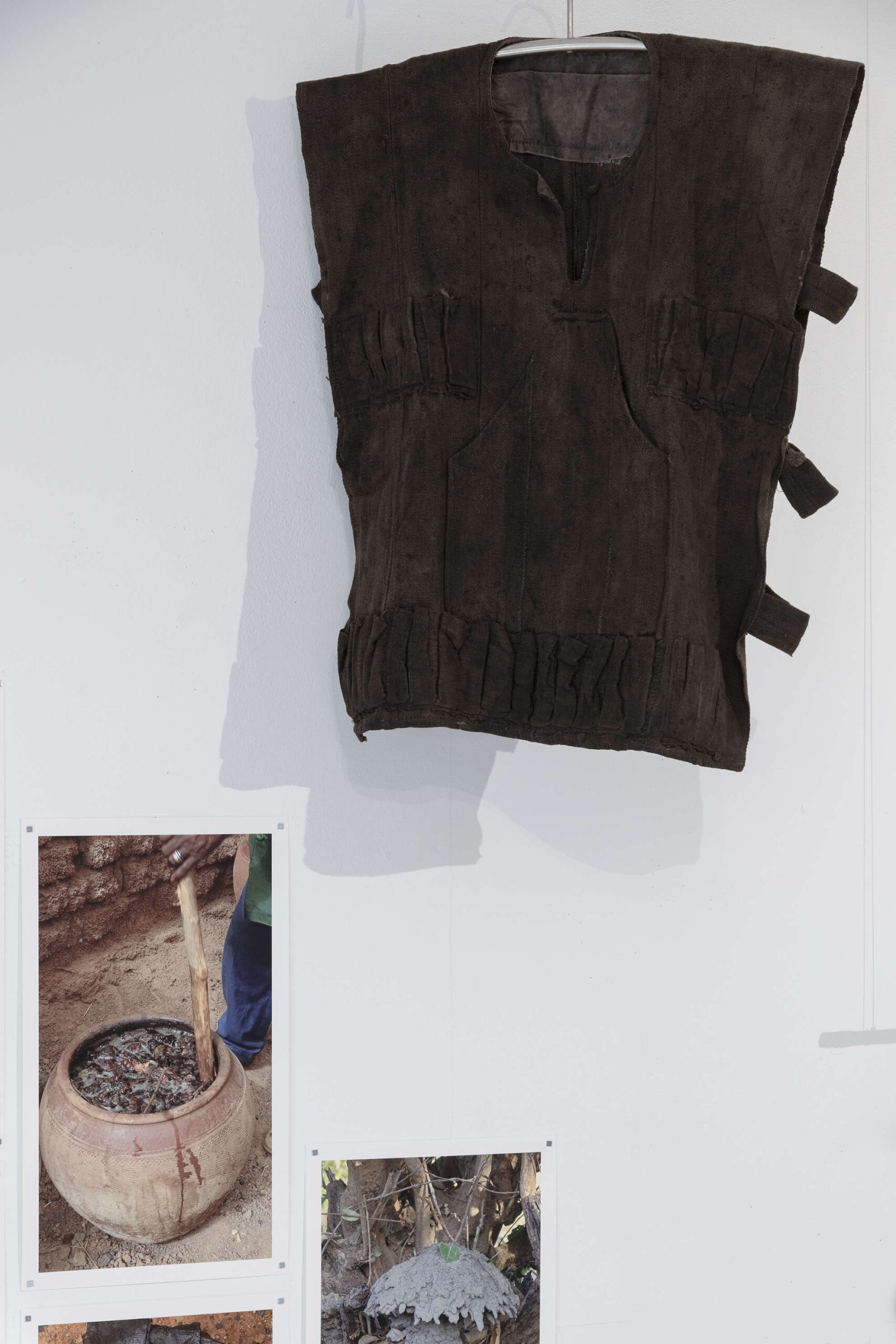 Auch kulturübergreifende Forschungsmethoden spielen bei Fermenting Textiles eine wichtige Rolle. Die Anthropologin Laurence Douny hat mit Kolleg:innen und Färber:innen in Burkina Faso zusammengearbeitet, um den langwierigen Prozess der Vouwo-Schlammfärbung akribisch zu dokumentieren, bei dem Erde unterschiedlicher Herkunft, Eisenerz und verschiedene Pflanzenmaterialien verwendet werden. Die Mikrobiologin Regine Hengge und ihr Doktorand José I. Hernández Lobato haben die komplexen Interaktionen von Bodenbakterien mit Pflanzen und Stoffen im Färbeprozess untersucht und stellen diese in der Ausstellung visuell nach. Darüber hinaus schafft Hengge fächerübergreifend fotografische Muster, die Bilder von bakteriellen Biofilmen aus dieser wissenschaftlichen Forschung mit den von Douny untersuchten westafrikanischen Textilien kombinieren. Diese wurden auf Stoffe für die Herstellung neuer Hemden gedruckt und vervollständigen so eine transdisziplinäre Reise von „shirt to shirt“.