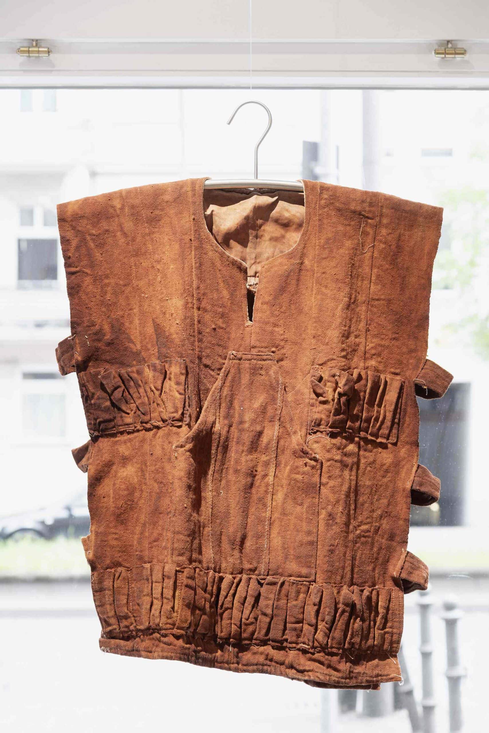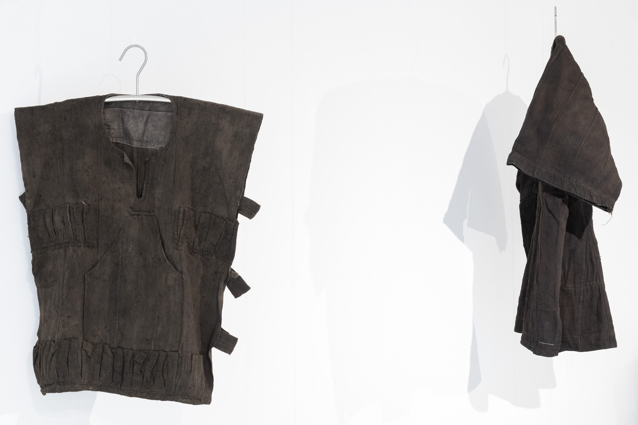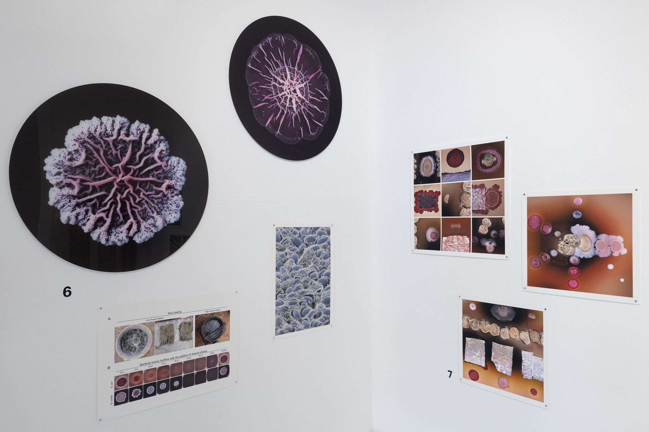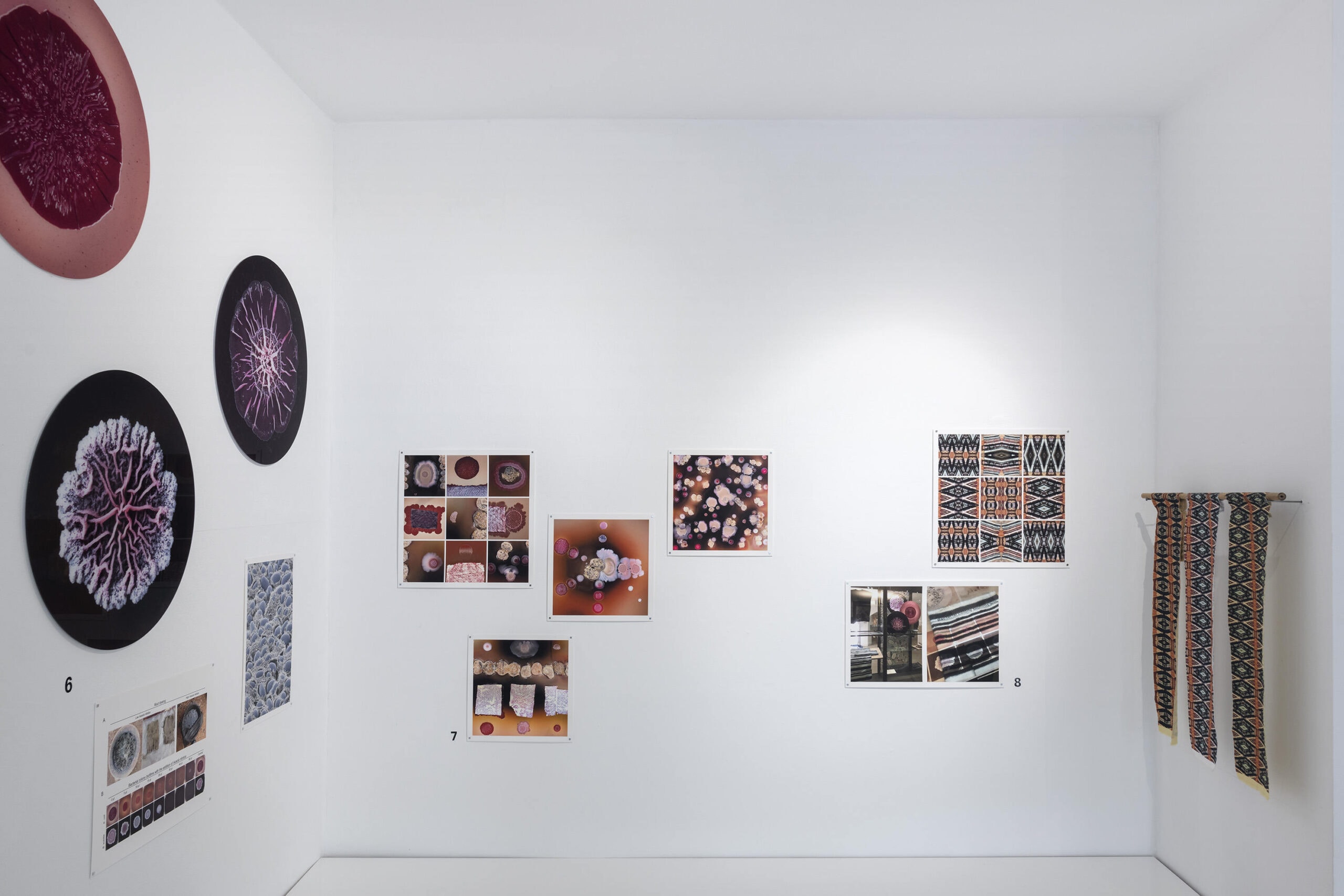 Auch kulturübergreifende Forschungsmethoden spielen bei Fermenting Textiles eine wichtige Rolle. Die Anthropologin Laurence Douny hat mit Kolleg:innen und Färber:innen in Burkina Faso zusammengearbeitet, um den langwierigen Prozess der Vouwo-Schlammfärbung akribisch zu dokumentieren, bei dem Erde unterschiedlicher Herkunft, Eisenerz und verschiedene Pflanzenmaterialien verwendet werden. Die Mikrobiologin Regine Hengge und ihr Doktorand José I. Hernández Lobato haben die komplexen Interaktionen von Bodenbakterien mit Pflanzen und Stoffen im Färbeprozess untersucht und stellen diese in der Ausstellung visuell nach. Darüber hinaus schafft Hengge fächerübergreifend fotografische Muster, die Bilder von bakteriellen Biofilmen aus dieser wissenschaftlichen Forschung mit den von Douny untersuchten westafrikanischen Textilien kombinieren. Diese wurden auf Stoffe für die Herstellung neuer Hemden gedruckt und vervollständigen so eine transdisziplinäre Reise von „shirt to shirt“.
