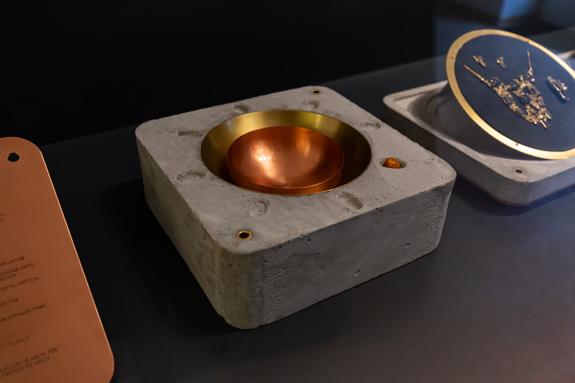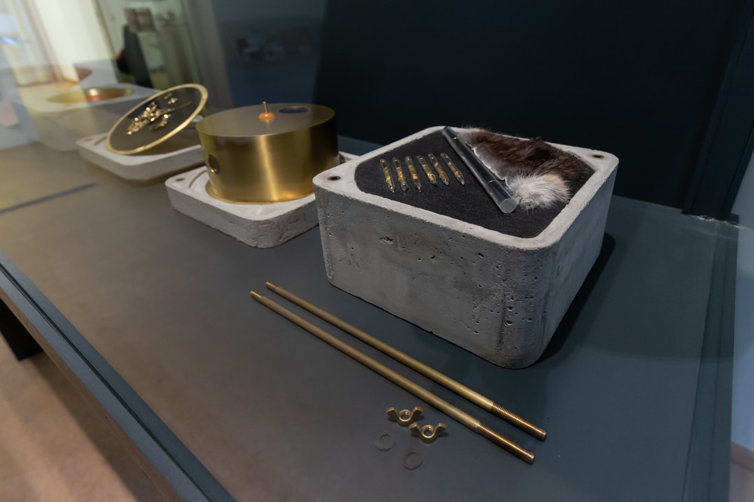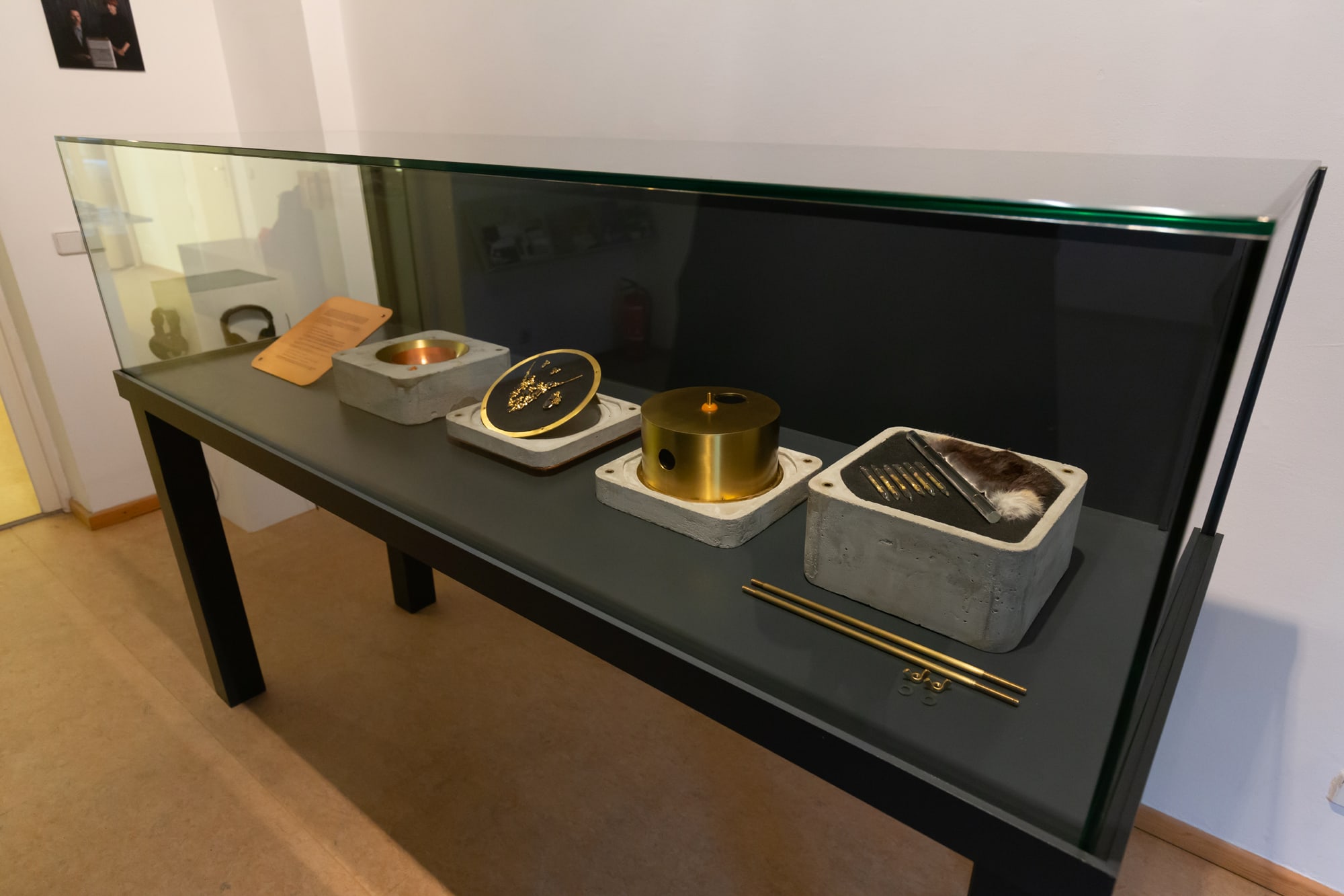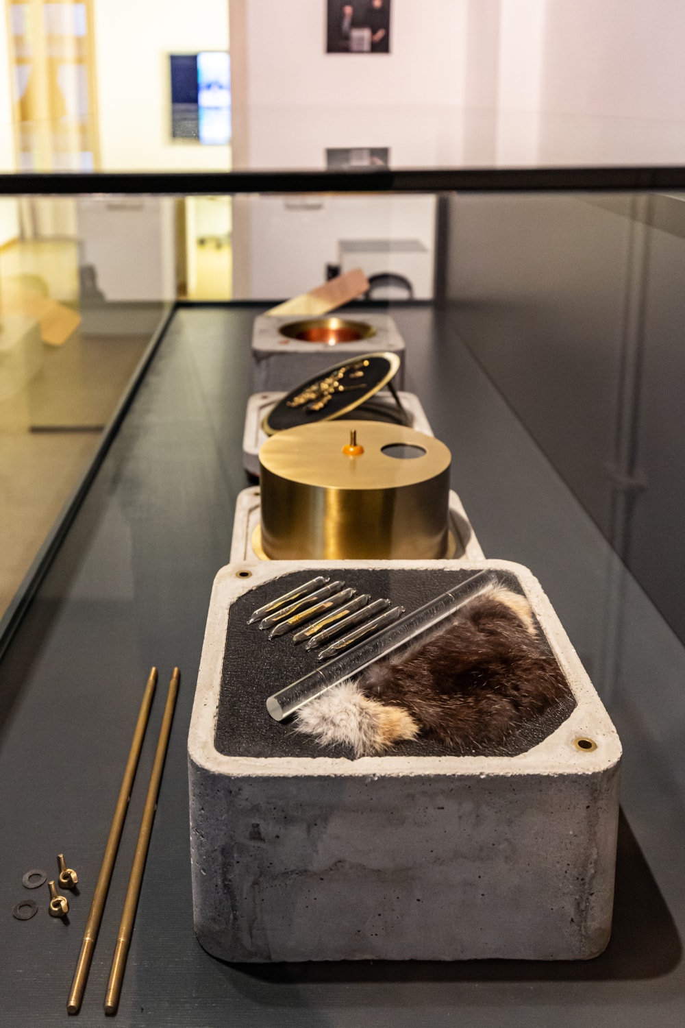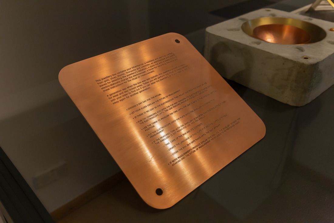 Die Arbeiten von Erich Berger und Mari Keto beschäftigen sich mit aktuellen Fragen des radioaktiven Abfalls. Die Installation Inheritance im vorderen Raum schlägt eine Zukunft vor, in der ein wertvolles Schmuckstück zu einem kostbaren, aber möglicherweise tödlichen Erbstück geworden ist. Die Steine bestehen teilweise aus radioaktivem Thorianit (ThO2), Thorit (Th, U) und Uraninit (UO2), das schließlich zu einem nichtradioaktiven Bleiisotop verfallen wird. In der Vitrine sind unterschiedliche Gegenständen angeordnet: Anweisungen in Kupfer eingraviert; zwei Schalen, die eine Wasseruhr darstellen; der Schmuck; ein Elektroskop; und schließlich ein Acrylstab mit einem Pelzstück, um mithilfe des Blattgoldes eine elektrostatische Aufladung auszulösen. Inheritance versteht sich als Ritual, bei dem die Erben den Schmuck aus dem Betonbehälter nehmen und mit einem Elektroskop prüfen, ob die Stücke bereits tragbar sind oder weiterhin für die nächste Generation aufbewahrt werden müssen. Das konzeptuelle Narrativ verweist auf die geologische Zeit („deep time“), die die Kürze der menschlichen Präsenz auf dem Planeten widerspiegelt und unser „atomares Erbe“ in Frage stellt. Was uns Berger und Keto hier präsentieren, ist der Moment vor dem Ritual, in dem das Erbstück bereit ist, getestet zu werden. Das Foto neben der Vitrine ist eine Autoradiografie, entstanden durch den Kontakt von Schmuck und Filmpapier. Die Radioaktivität der Edelsteintöne wirkt wie Licht und erzeugt ein negatives Bild.