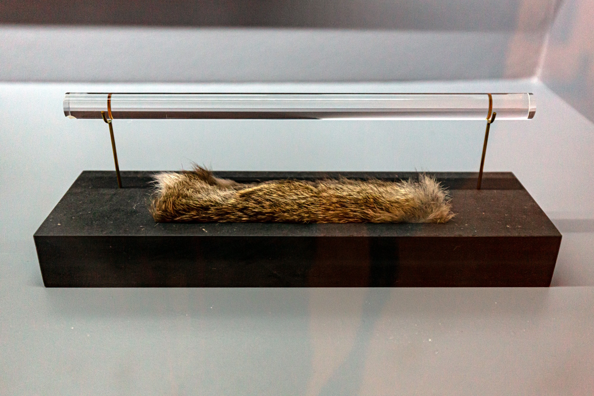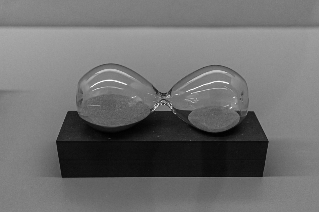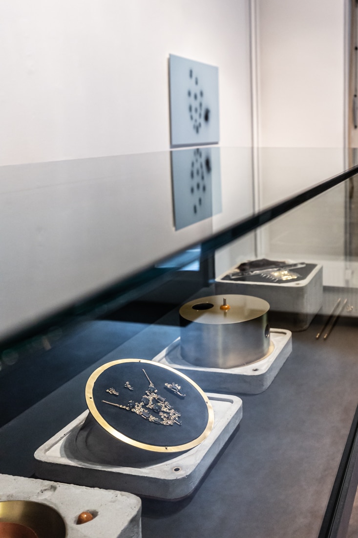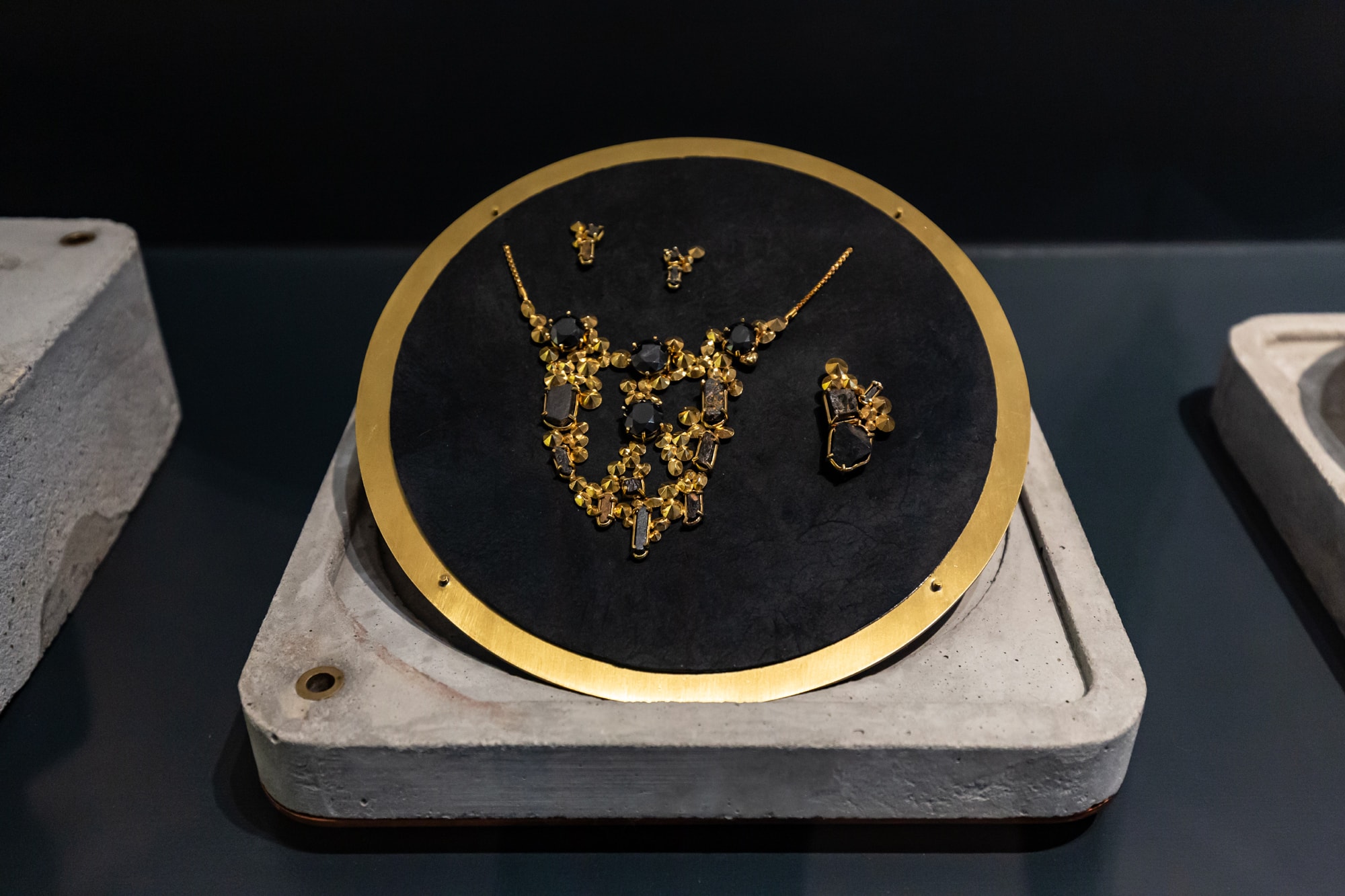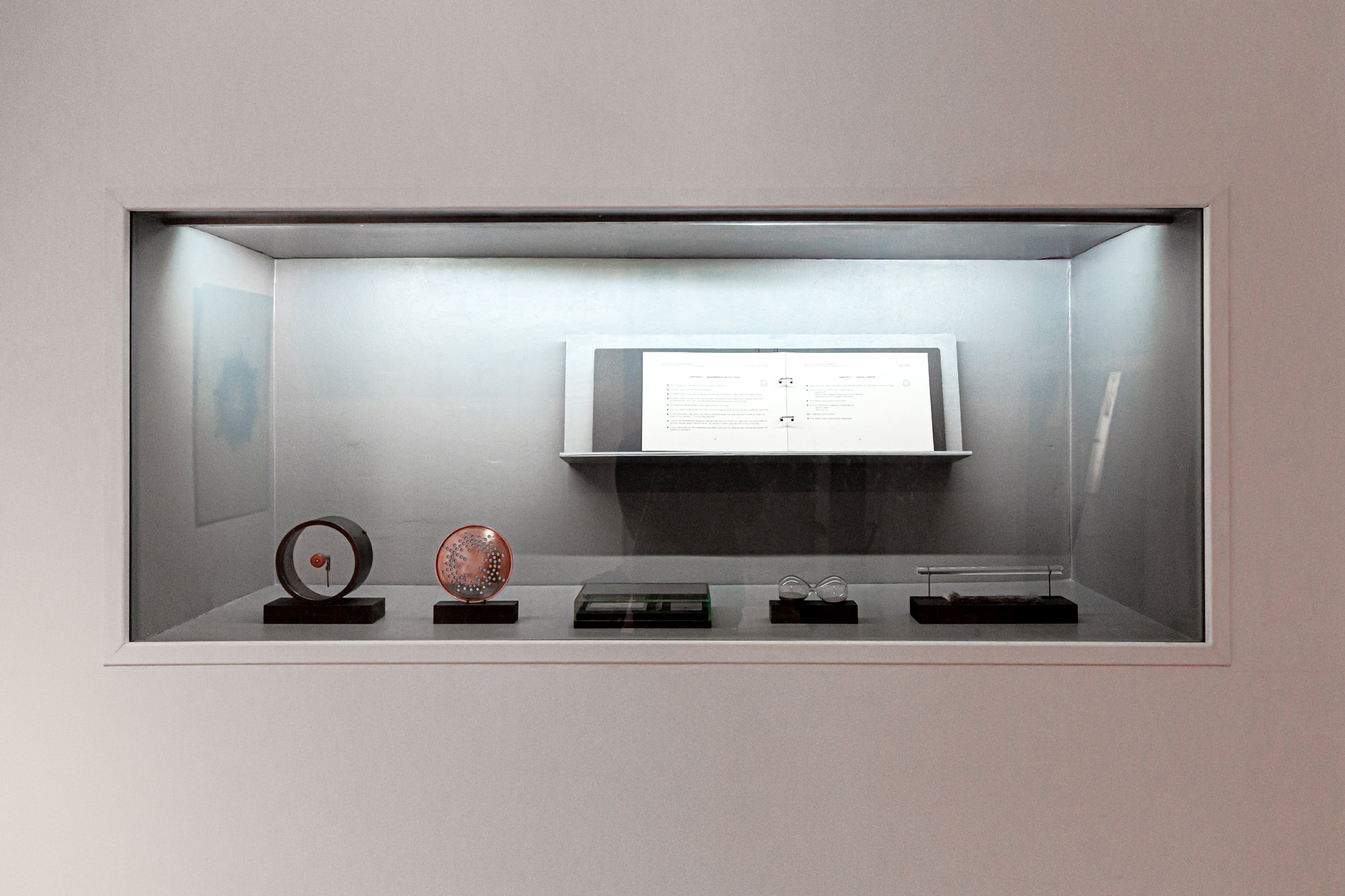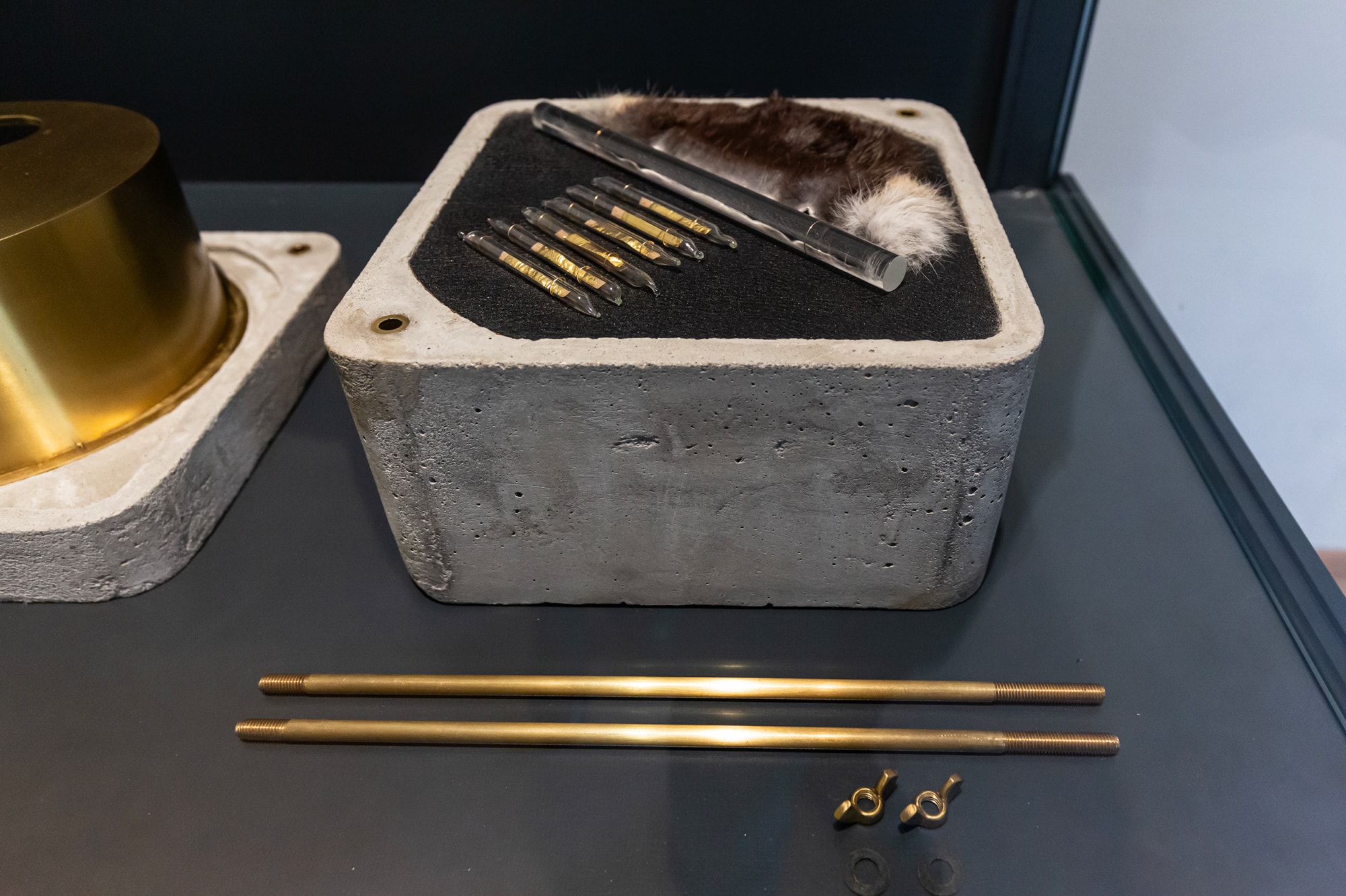 Die Arbeiten von Erich Berger und Mari Keto beschäftigen sich mit aktuellen Fragen des radioaktiven Abfalls. Die Installation Inheritance im vorderen Raum schlägt eine Zukunft vor, in der ein wertvolles Schmuckstück zu einem kostbaren, aber möglicherweise tödlichen Erbstück geworden ist. Die Steine bestehen teilweise aus radioaktivem Thorianit (ThO2), Thorit (Th, U) und Uraninit (UO2), das schließlich zu einem nichtradioaktiven Bleiisotop verfallen wird. In der Vitrine sind unterschiedliche Gegenständen angeordnet: Anweisungen in Kupfer eingraviert; zwei Schalen, die eine Wasseruhr darstellen; der Schmuck; ein Elektroskop; und schließlich ein Acrylstab mit einem Pelzstück, um mithilfe des Blattgoldes eine elektrostatische Aufladung auszulösen. Inheritance versteht sich als Ritual, bei dem die Erben den Schmuck aus dem Betonbehälter nehmen und mit einem Elektroskop prüfen, ob die Stücke bereits tragbar sind oder weiterhin für die nächste Generation aufbewahrt werden müssen. Das konzeptuelle Narrativ verweist auf die geologische Zeit („deep time“), die die Kürze der menschlichen Präsenz auf dem Planeten widerspiegelt und unser „atomares Erbe“ in Frage stellt. Was uns Berger und Keto hier präsentieren, ist der Moment vor dem Ritual, in dem das Erbstück bereit ist, getestet zu werden. Das Foto neben der Vitrine ist eine Autoradiografie, entstanden durch den Kontakt von Schmuck und Filmpapier. Die Radioaktivität der Edelsteintöne wirkt wie Licht und erzeugt ein negatives Bild.