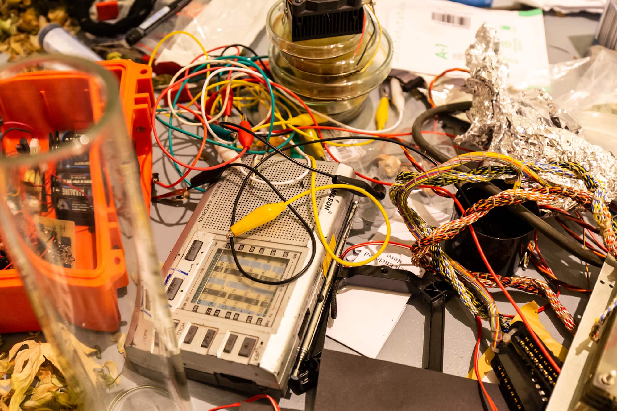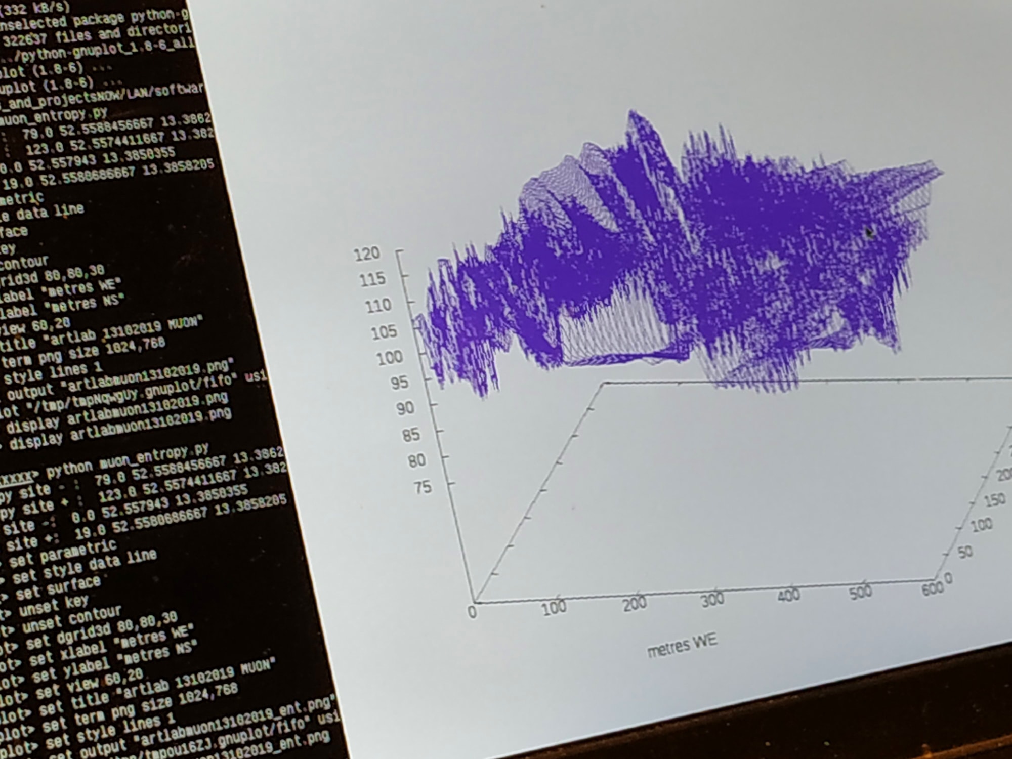 Der orangefarbene Kasten auf dem Tisch misst die Entropie (als Maß für Zufälligkeit und Un/Ordnung) und den Einfall von Myonen, die durch die Kollision kosmischer Strahlen in der Atmosphäre entstehen. Während des Workshops wurde dieses Gerät durch das Gebiet um die ALB-Ausstellungsräume getragen. Entropie und Myonen wurden mithilfe von GPS abgebildet. Die Ergebnisse sind auf zwei großen Drucken an der Wand zu sehen. Auf einem Druck ist die Entropie bei 100 angesiedelt, während 200 Münzwurfe simuliert werden; der Median entspricht 100 (Kopf oder Zahl). Der andere große Druck zeigt die Anzahl der Myonen, die innerhalb von 4 Sekunden gemessen wurden. Ein Pappkarton mit Maschine, die auch während des Workshops durch die Nachbarschaft getragen wurde, misst die Intensität der Hochfrequenzenergie (100 MHz bis 4 GHz), die dann auf den Ort abgebildet wurde. Dadurch wird ersichtlich, in welchen Bereichen stärkere elektromagnetische Felder und Wellen auftreten.