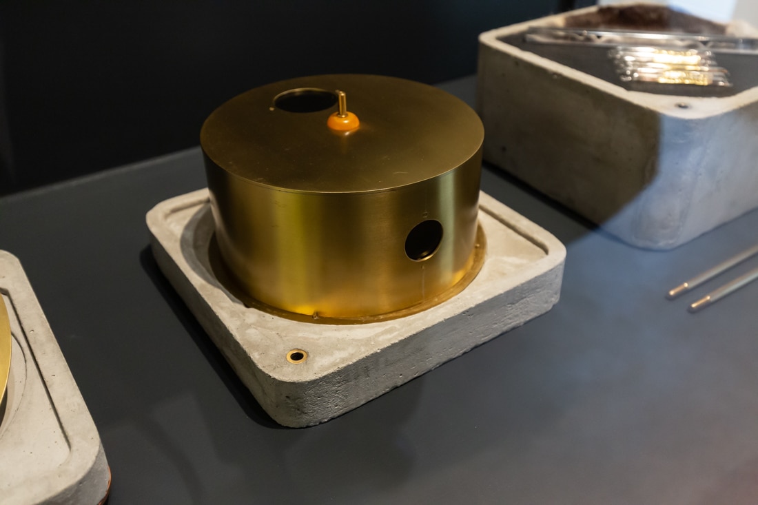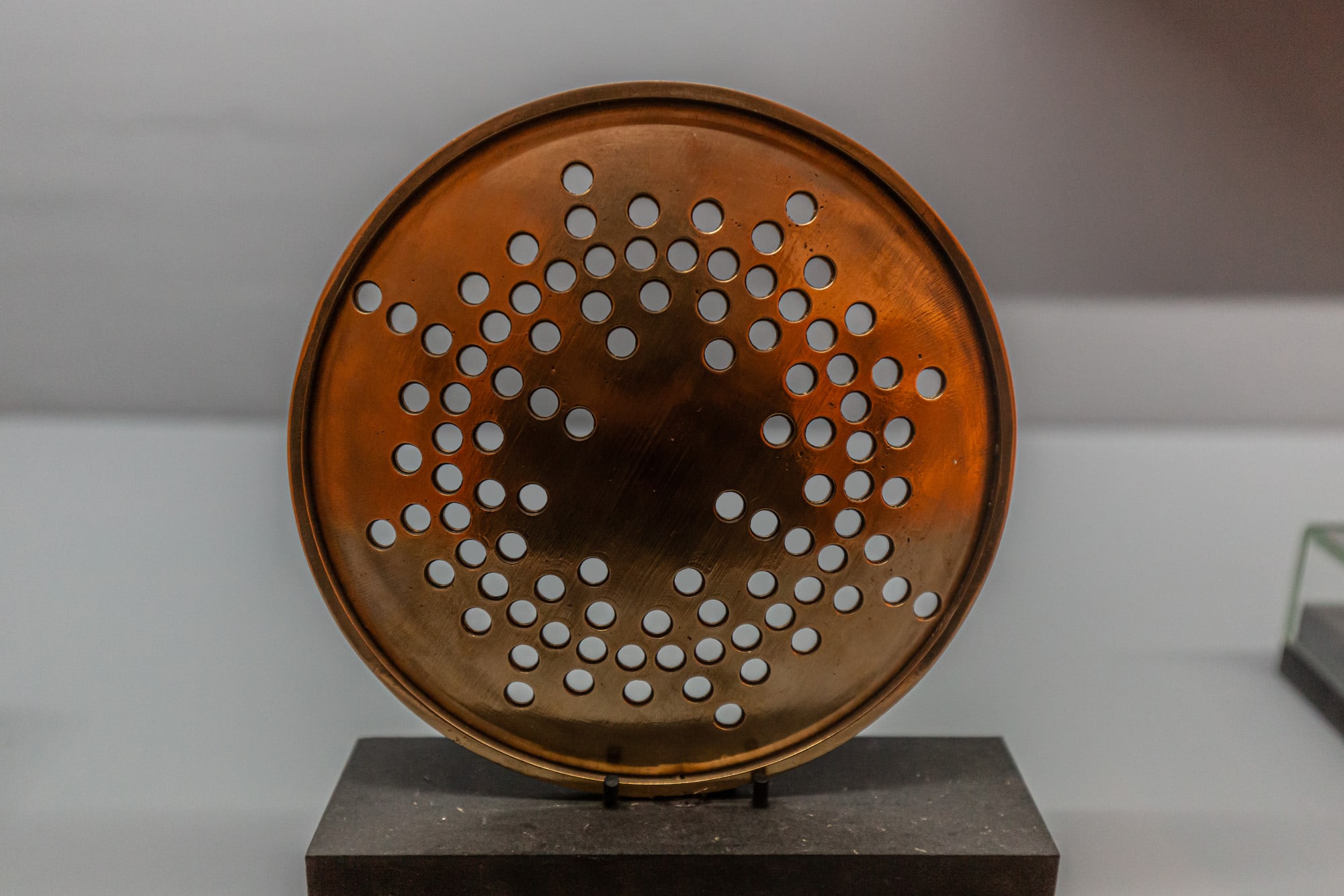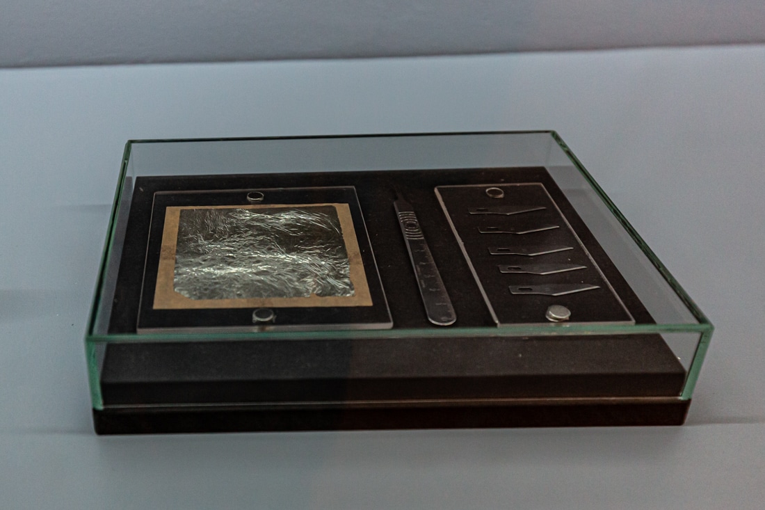 Ihre andere Arbeit in der Ausstellung Open Care im vorderen Raum links zeigt ein spekulatives Szenario und eine Zukunft, in der einzelne Familien die Verantwortung für radioaktive Abfälle übernehmen. Der Schrein bietet ein Elektroskop zur Messung der Radioaktivität, ein elektrostatisches Ladegerät und eine Speicherscheibe für eine kleine Menge Atommüll an, von Generation an Generation weiterzugeben. Die Abfälle, die durch unsere wissenschaftlichen und technologischen Fortschritte entstehen, werden zu einer generationenübergreifenden Last der kollektiven Fürsorge und Verantwortung. Neben dem Schrein lässt sich erneut eine Autoradiographie studieren – hier mit 92 Pellets des anthropogenen Isotops 241Am.