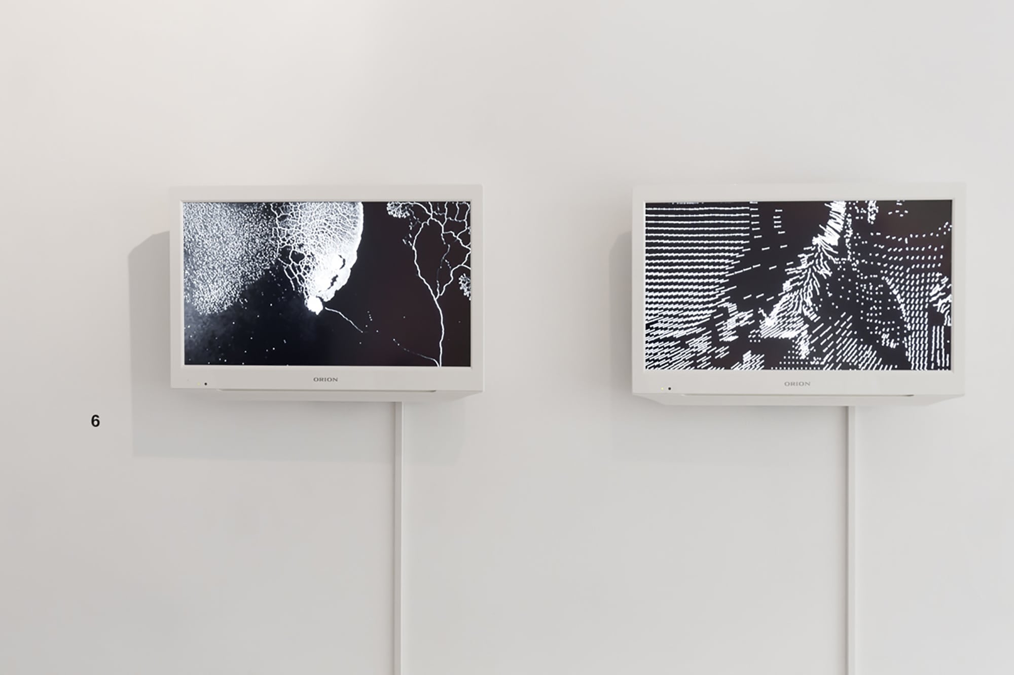 Im Diptychon Motion Fields ist auf dem Monitor links ein Schleimpilz in Zeitraffer zu sehen, wie er Netzwerke bildet, auf äußere Bedrohung reagiert und Nahrung sucht; und das Experiment Being Slime Mould, ein menschliches Modellbildungs-Experiment, in dem eine Gruppe von Menschen eingeladen ist, die Verhaltensregeln des einzelligen Organismus zu übernehmen, um ihre kollektiven Kapazitäten für Kommunikation und Kooperation zu testen. Der rechte Monitor zeigt die rechnerische Visualisierung des Bewegungsfeldes, wobei die nichtmenschlichen und menschlichen Agenten als dynamische Kraft- und Wachstumskräfte hervorgehoben werden.