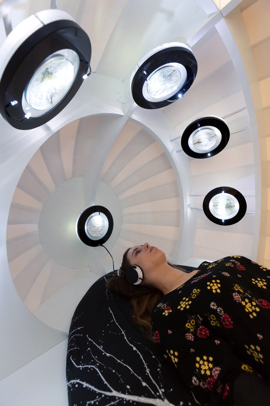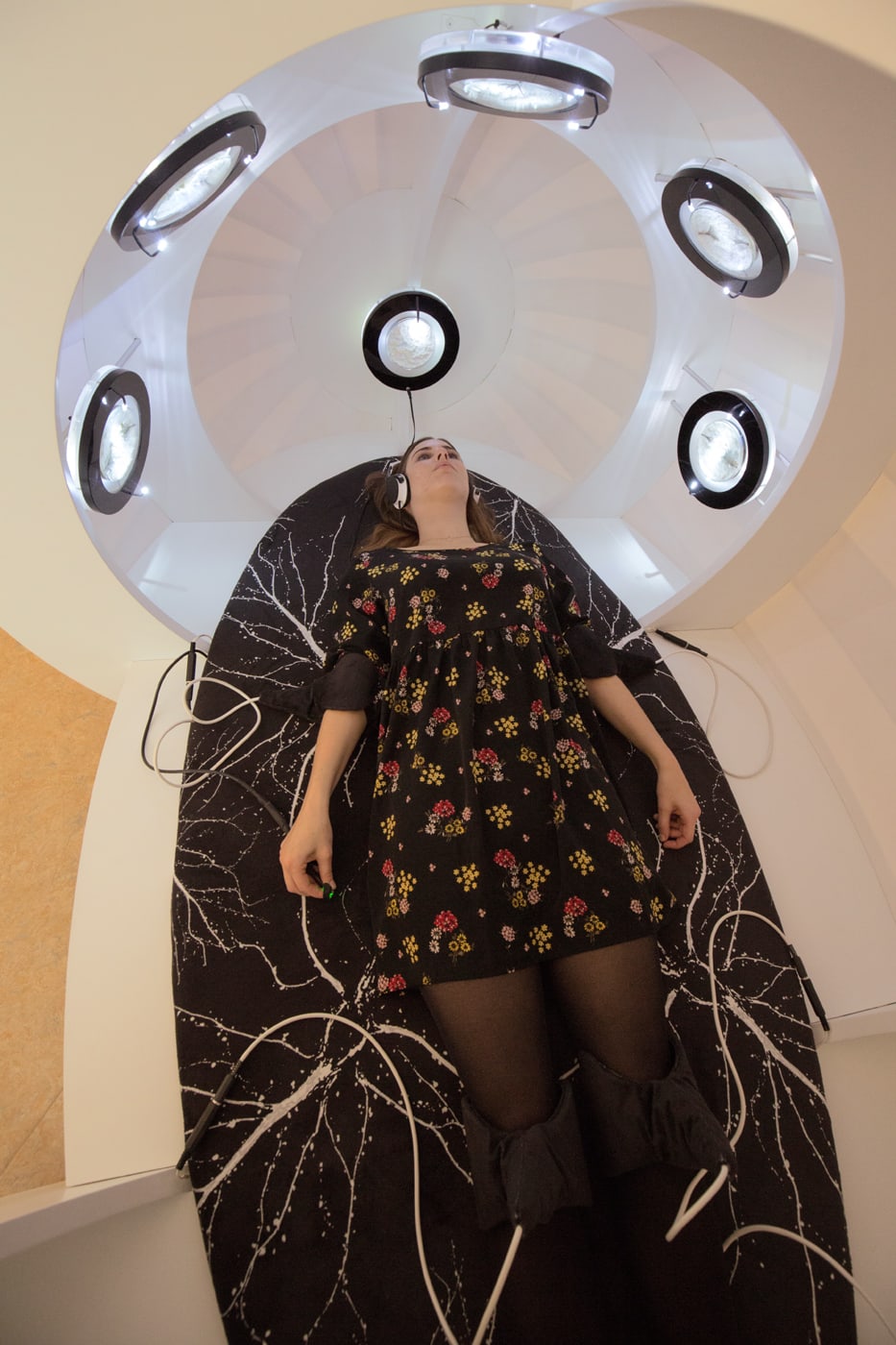 Das Kollektiv mit Saša Spačal, Mirjan Švagelj und Anil Podgornik verbindet Kunst, Biologie und Kybernetik, um eine Plattform für eine Kommunikation zwischen Arten zu schaffen. In Myconnect wird das Nervensystem einer Person mit einem Pilz-Myzel in einer Biofeedback-Schleife verbunden. Nach dem Betreten der Kapsel wird eine Person mit einem Herzschlagsensor, Kopfhörer und Vibrationsmotoren ausgestattet, die auf verschiedenen Körperteilen platziert sind. Der menschliche Herzschlag setzt das System in Bewegung. Das Signal fährt durch das Myzel, wo es in Echtzeit moduliert wird. Das modulierte Signal wird über Klang, Licht und taktile Sinnesimpulse wieder in den menschlichen Körper zurück übertragen. Die überwältigenden Reize, die das Nervensystem beeinflussen, verursachen eine Veränderung des Herzschlags. Eine neue Schleife beginnt, und der Kreis ist geschlossen. Eine Symbiose von Signalen beginnt.