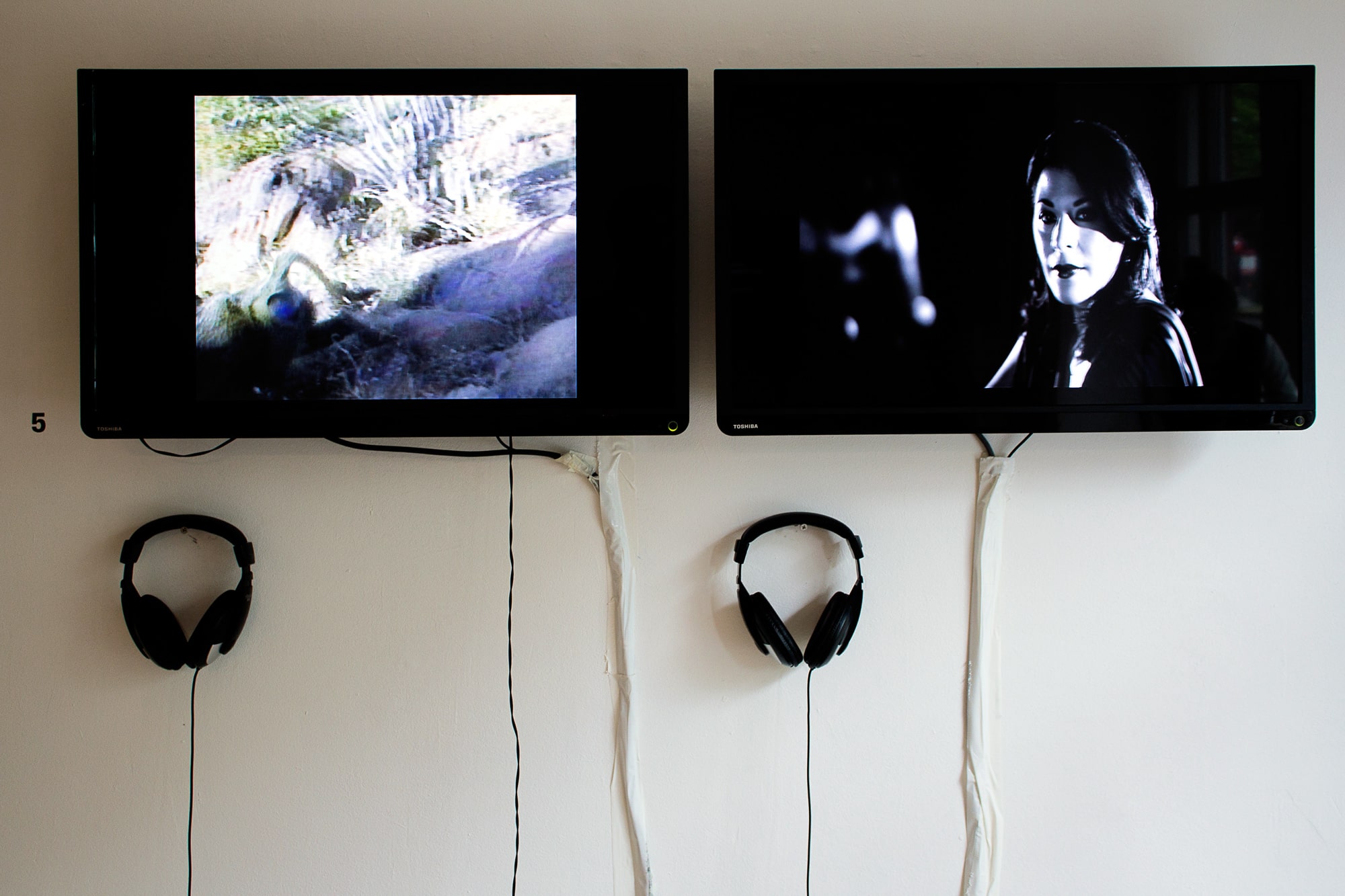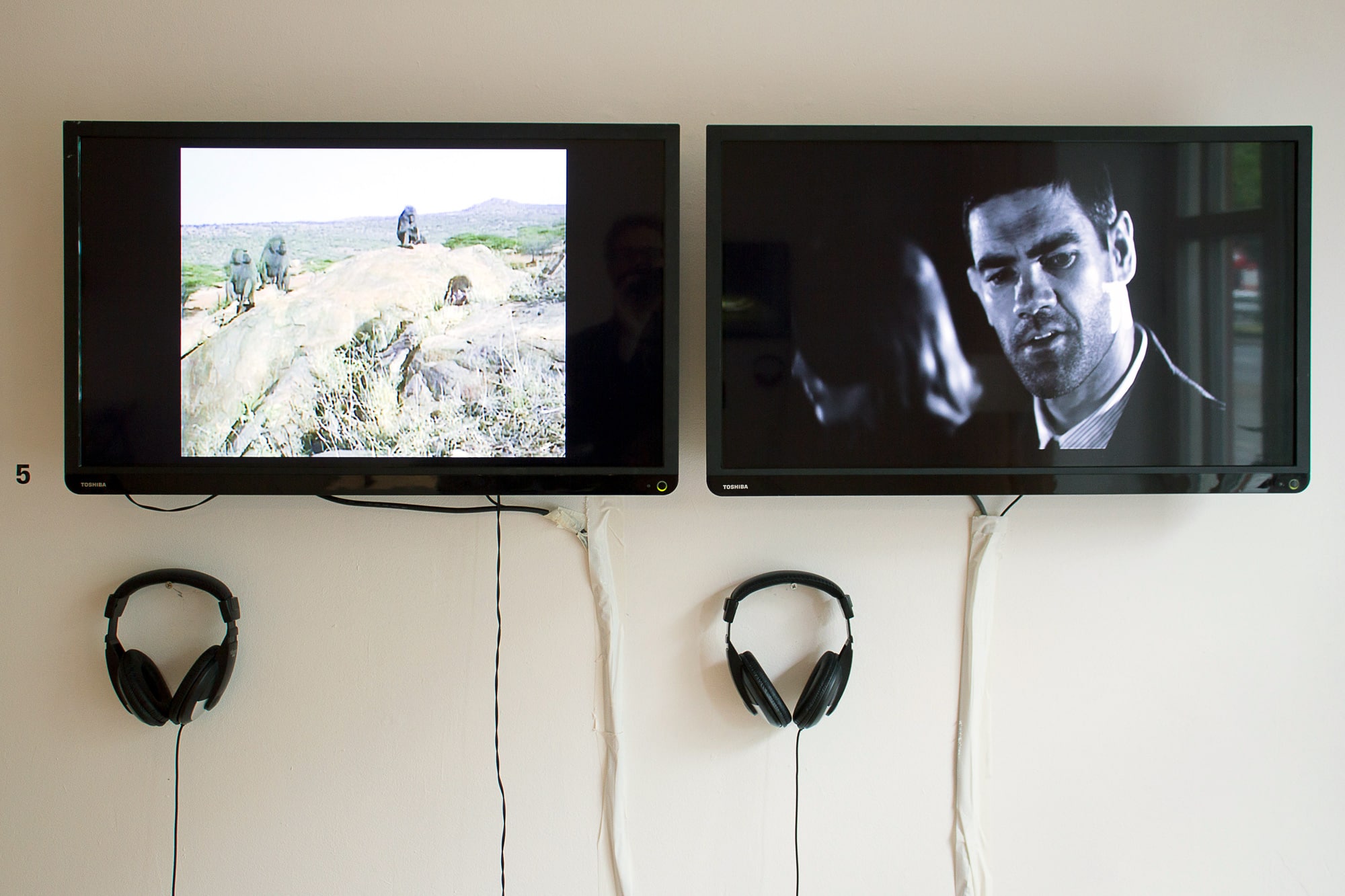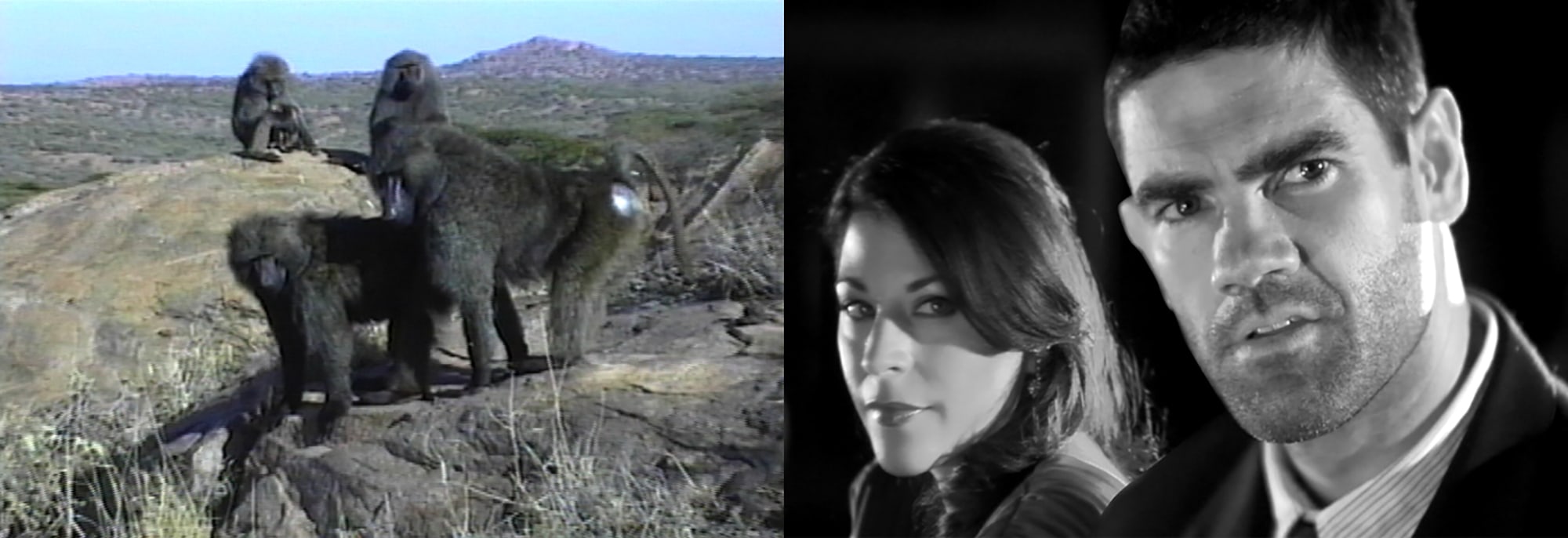 Mayeris Film Baboons as Friends (2007) stellt Filmmaterial mit Pavianen einem Film-Noir-Reenactment mit menschlichen Schauspielern gegenüber und zeigt die Geschichte von Lust, Eifersucht und Betrug von Tieren und Menschen. Auf dem linken Monitor können wir Filmmaterial einer Feldforschung von Deborah Forster über Paviane in Kenia sehen, welche die Geschichte von Verlangen und Verrat erzählt. Auf dem rechten Monitor hingegen hat Mayeri eine menschliche Situation mit professionellen Schauspielern inszeniert.