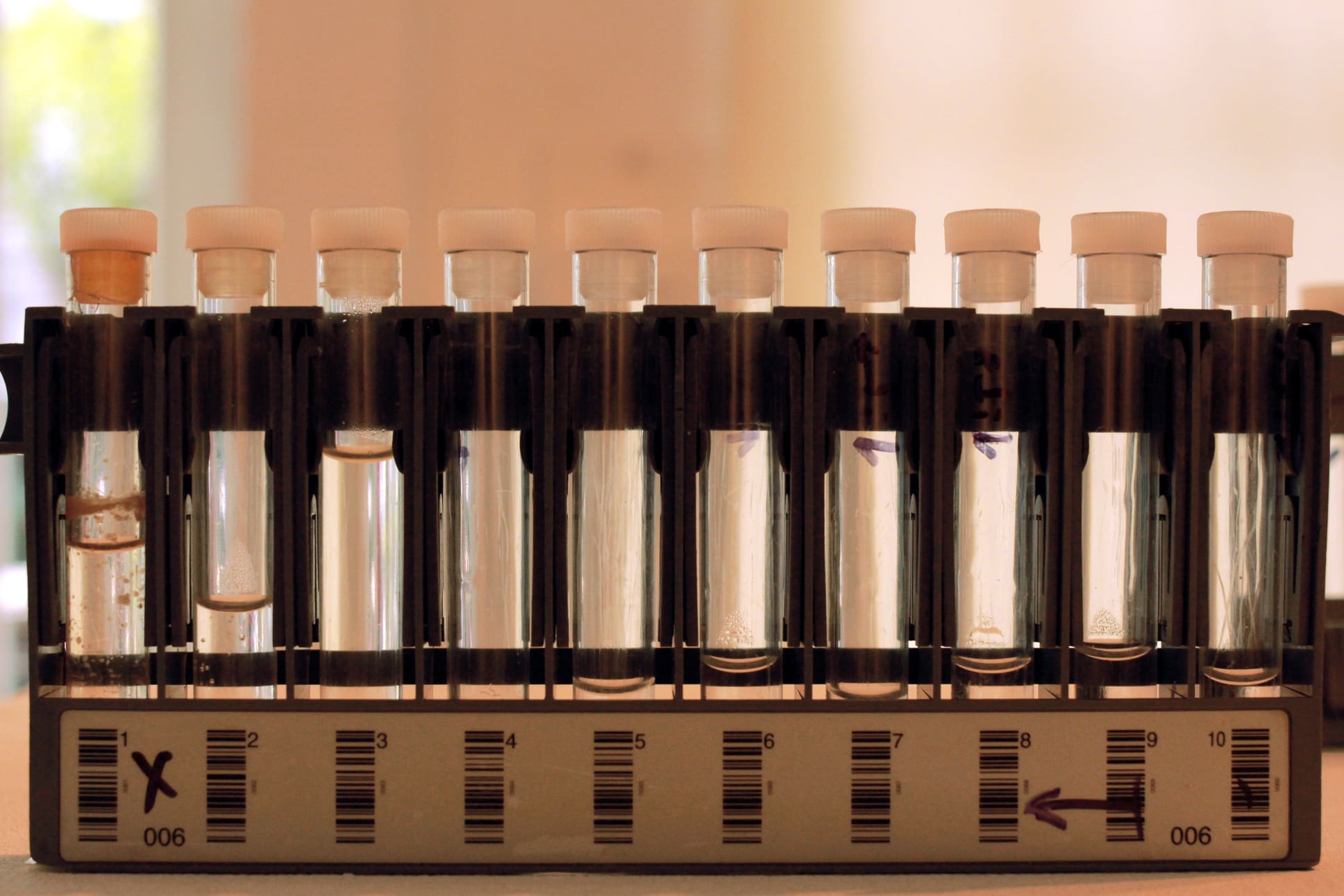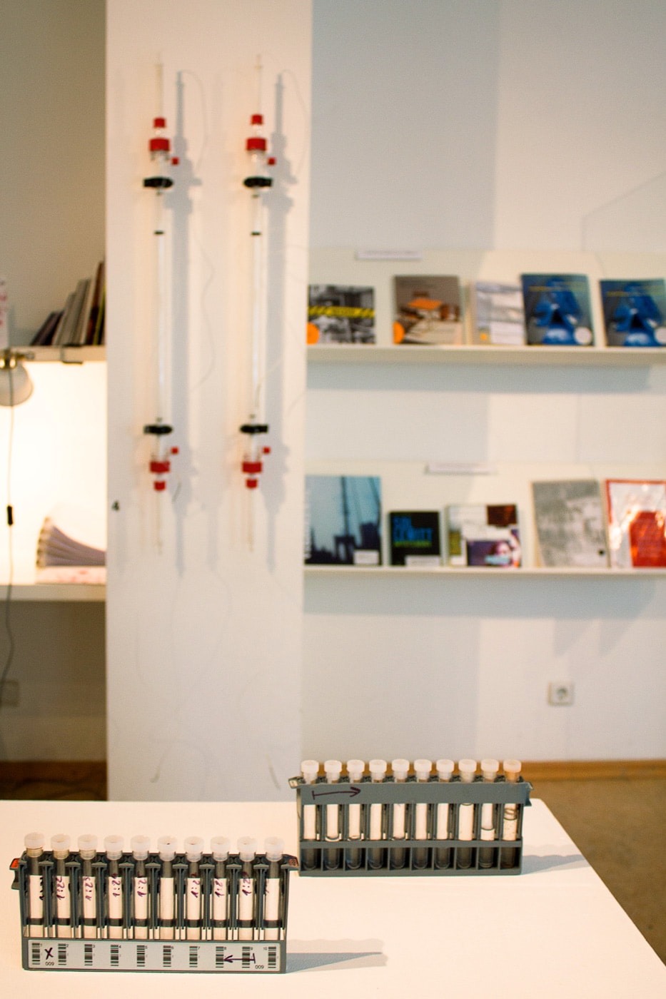 Die beiden Objekte an der Ausstellungswand nutzt man in der Biochemie üblicherweise als Proteinsäulen, doch in Smrekars Installation dienen sie als Serotoninfilter: die mit „K9“ und „M7“ beschrifteten Rohre wurden für das individuelle Filtern des Serotonin der Thrombozyten von Smrekar und diejenigen ihres Hunds genutzt. Auf dem Podest stehen verschiedene Geruchsderivate des Metabolismus von Mensch und Hund. Die organische chemische Substanz Indol, in der Parfumindustrie häufig verwendet, stellt (wie das Tryptophan) das letzte Derivat bei der Serotonin-Gewinnung dar (und findet man nicht nur im Gehirn, sondern auch bei Blumen). Hier ist es die Mischung von Smrekar’s und Byrons Serotonin, synthetisiert mit Indol.