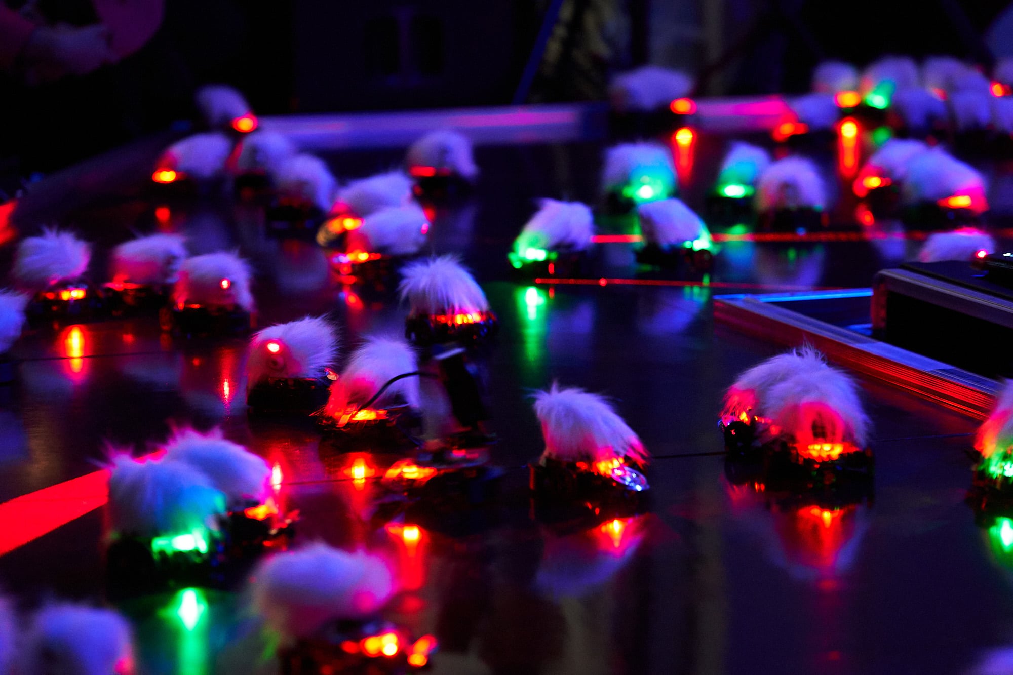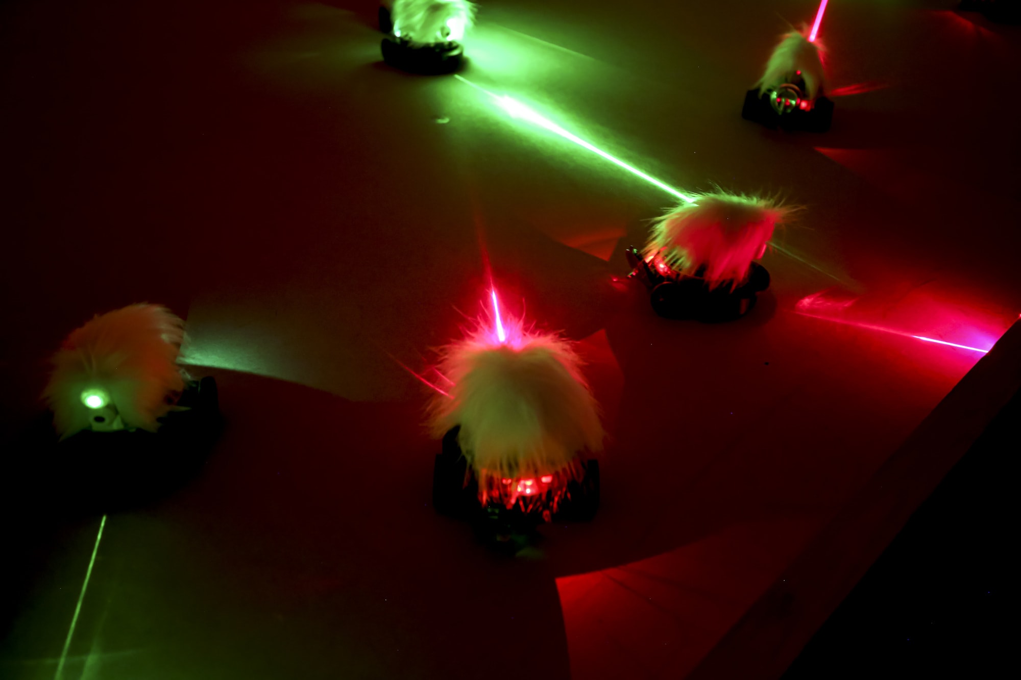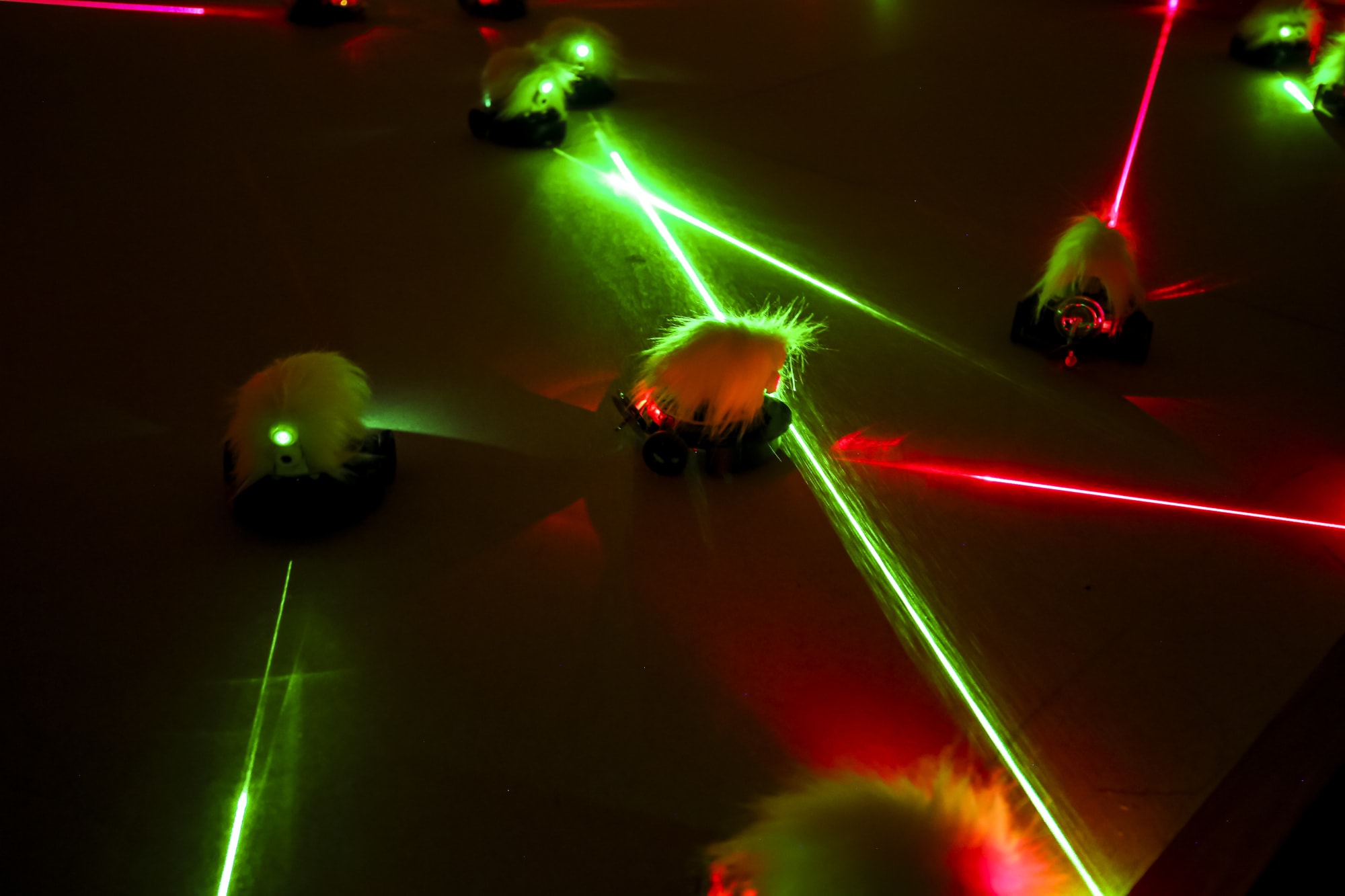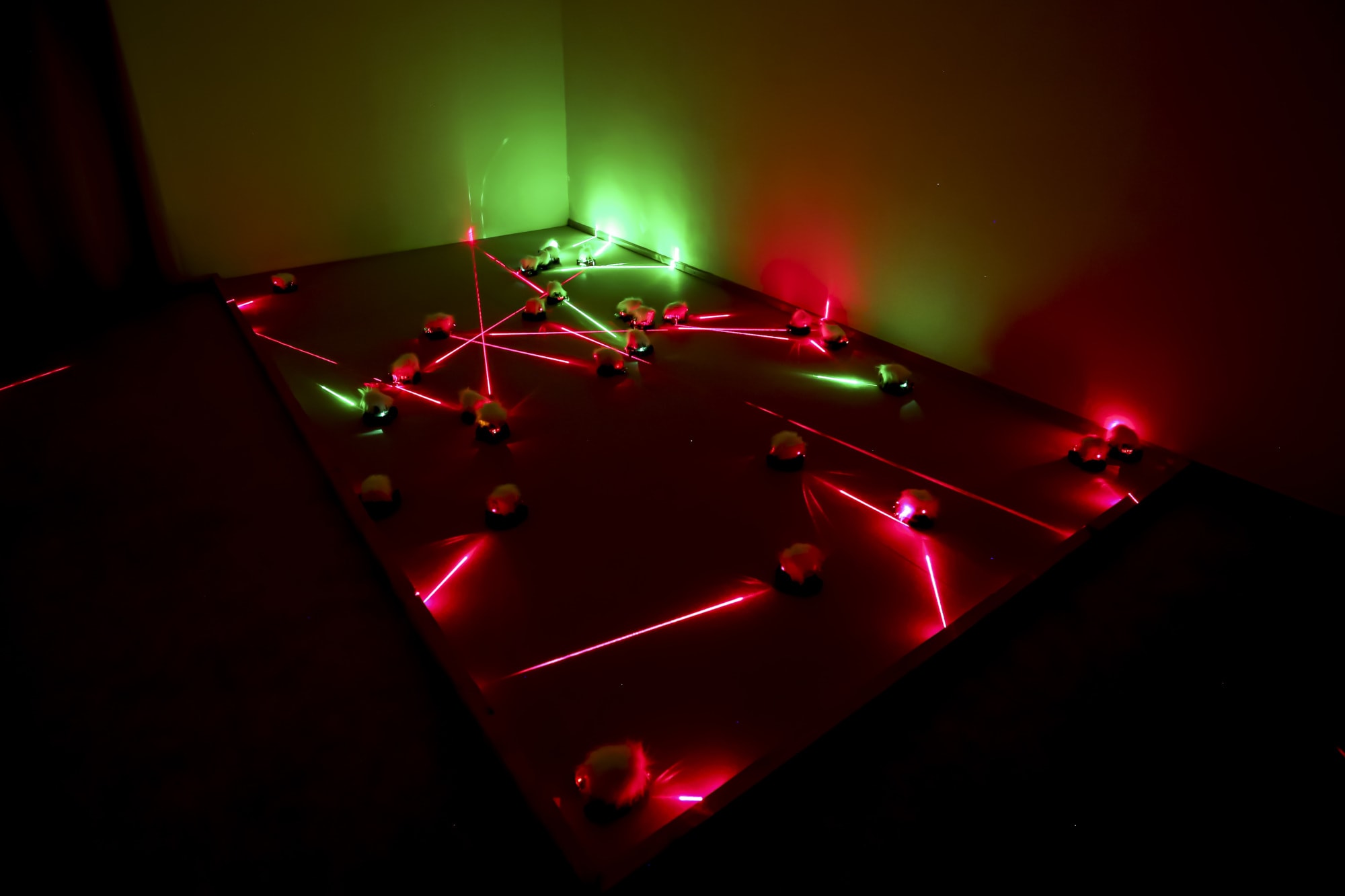 So Kanno verbindet Design Informatik mit digitaler Kunst und hat sich in den letzten Jahren intensiv mit Robotersystemen und Schwarmrobotik auseinander gesetzt. Lasermice ist eine Schwarmroboteranlage, die aus 30 kleinen Robotern besteht, die durch das synchrone Verhalten von Insekten wie Glühwürmchen inspiriert wurde. Normalerweise ist das Netzwerk des Schwarms unsichtbar, aber in diesem Fall erstellen diese Roboter ein sichtbares Netzwerk mittels Laser-Licht-Photodetektor-Kommunikation. Dadurch erzeugen sie einen Rhythmus, durch Elektronmagneten akustisch wahrnehmbar, der sich ständig ändert. Die aktualisierte Fassung Lasermice Dyad, geht ebenfalls der Idee, natürliche Phänomene künstlich sichtbar zu machen, und weist noch mehr Parameter auf.