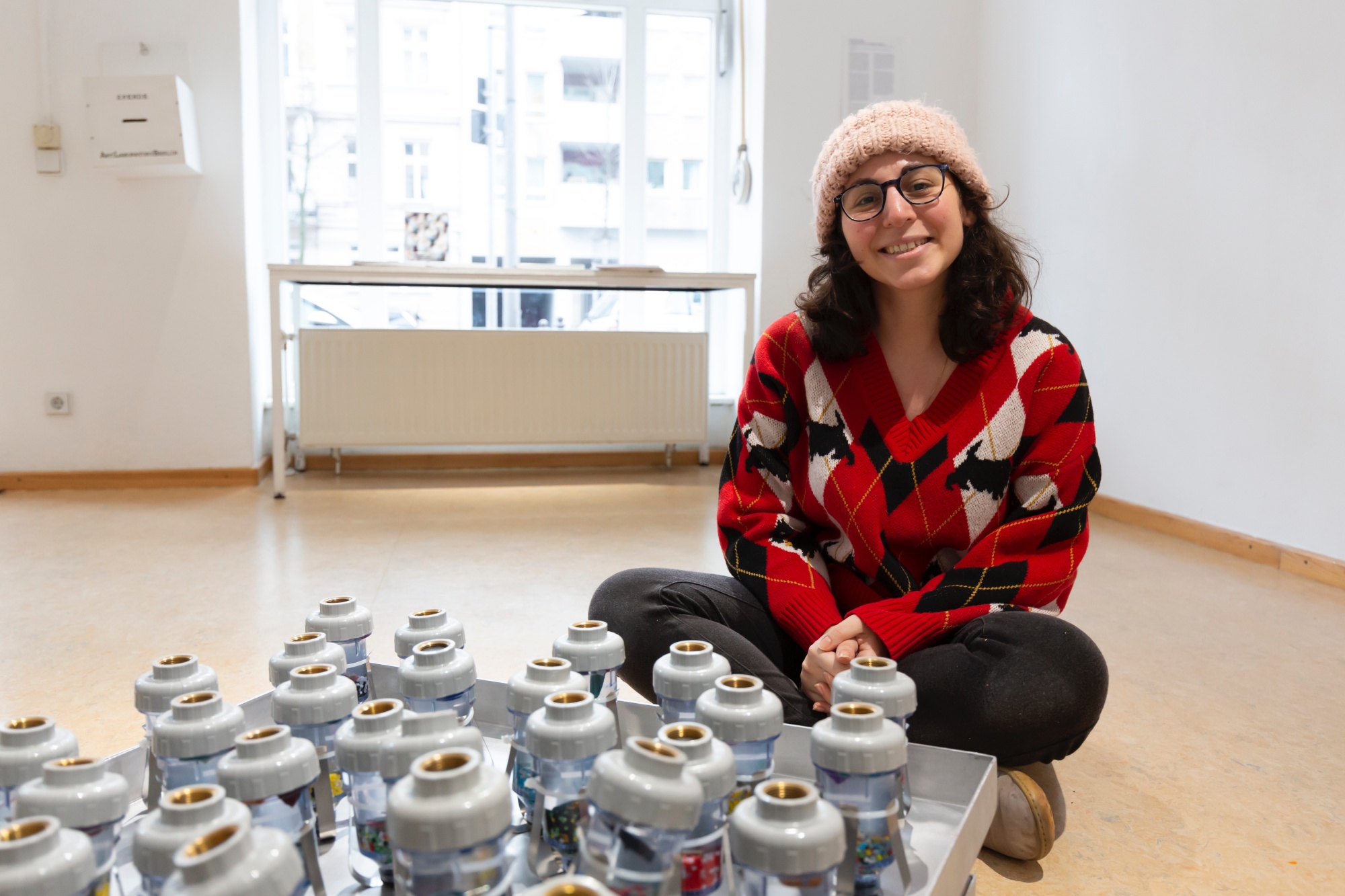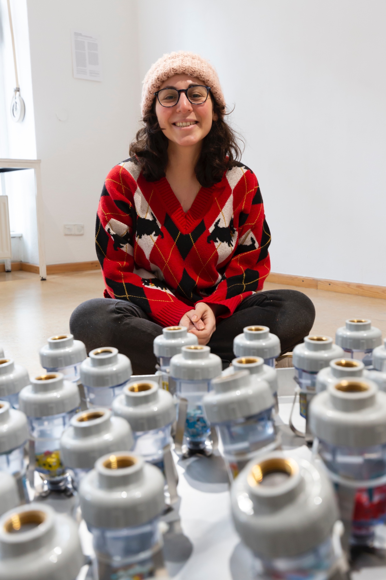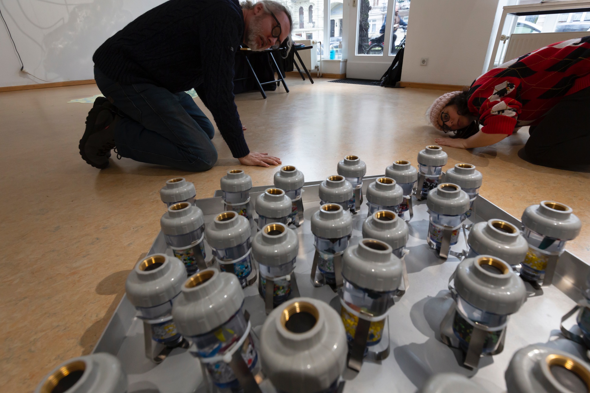 Gülşah Mursaloğlu: Devouring the Earth, in Perishable Quantities, 2020-ongoing, aluminium, washing machine filters, Arduino uno, motor, industrial and found microplastics, photo: Tim Deussen