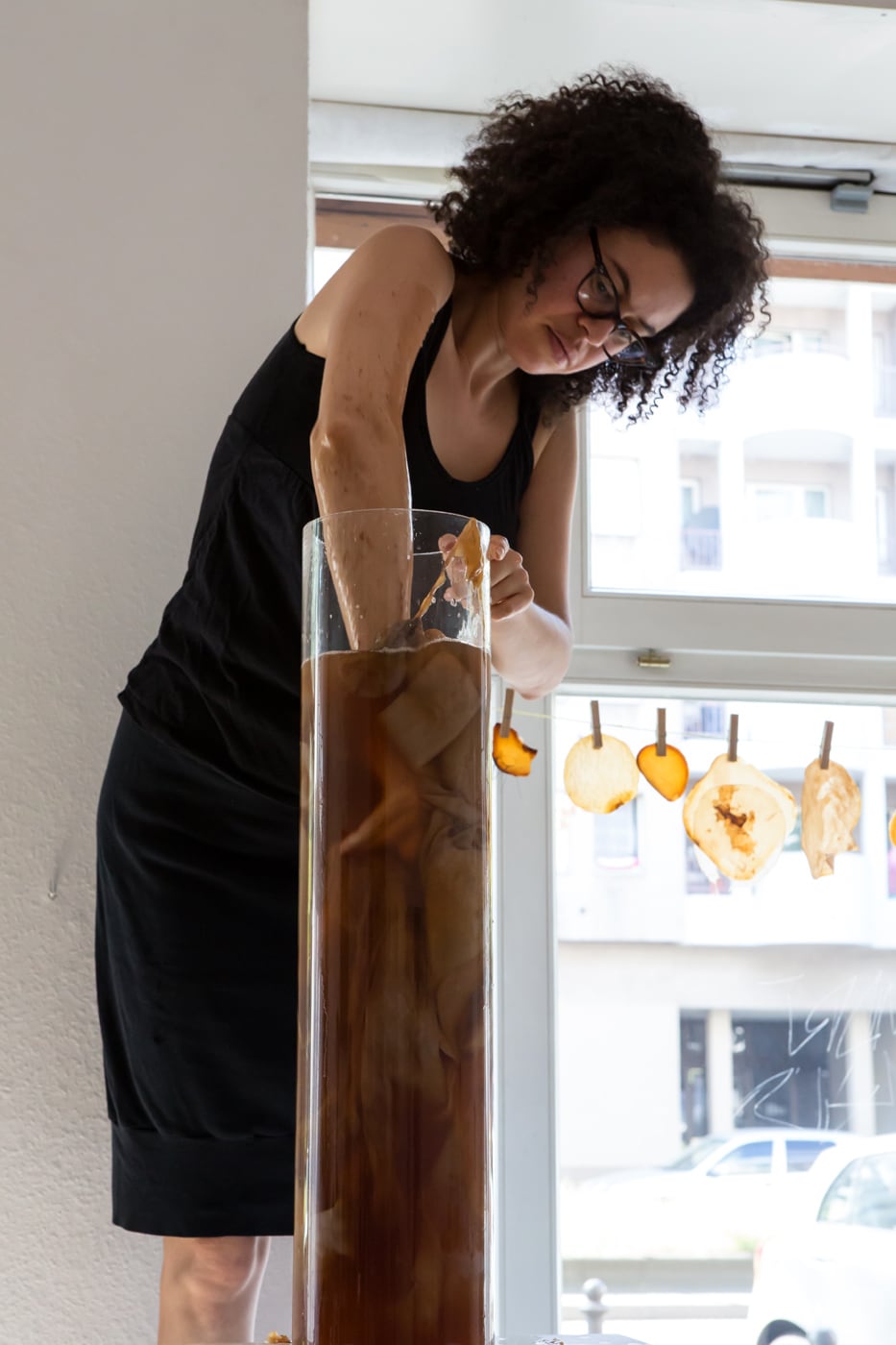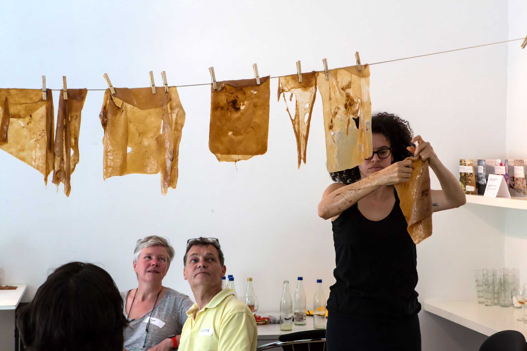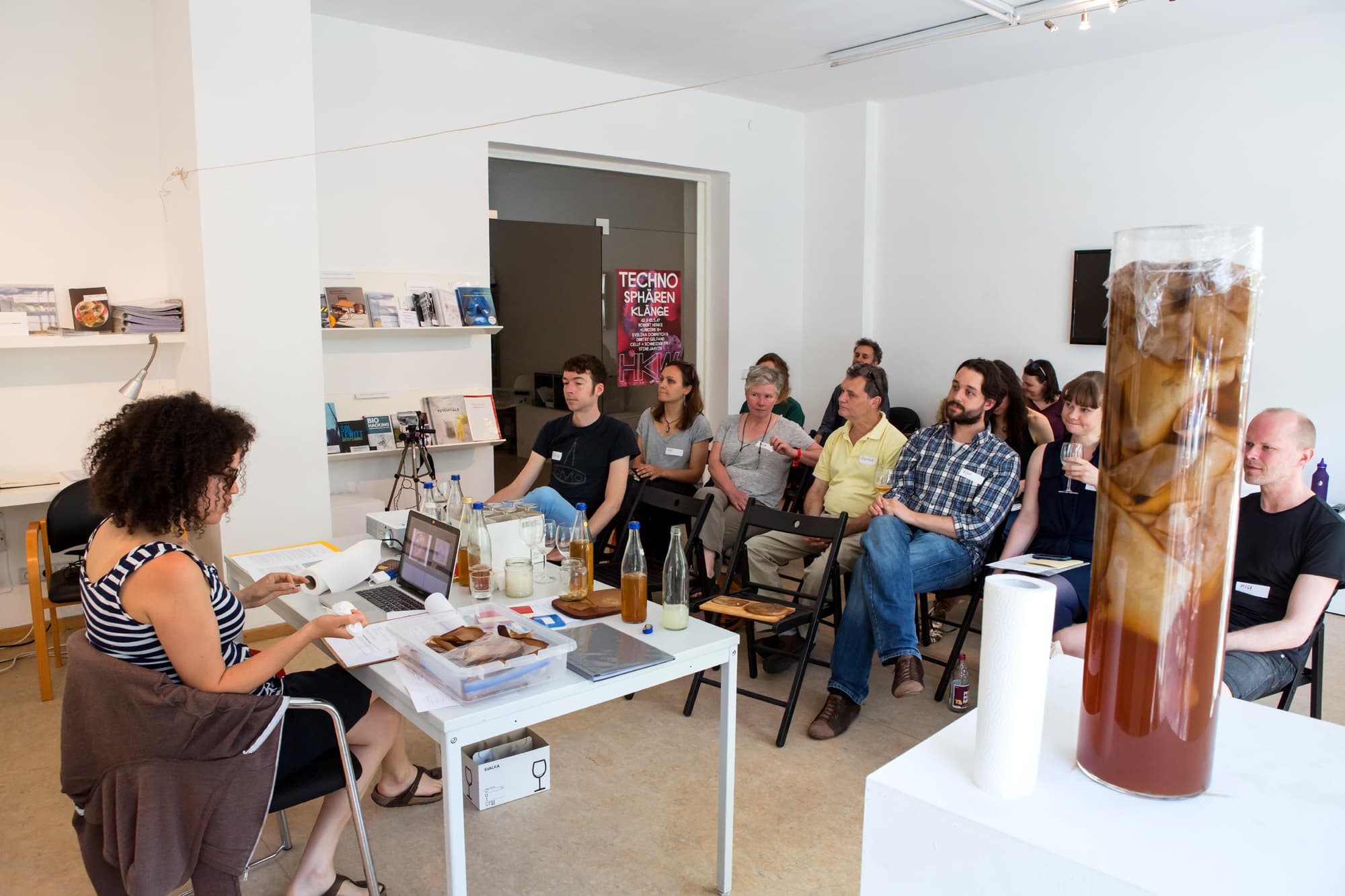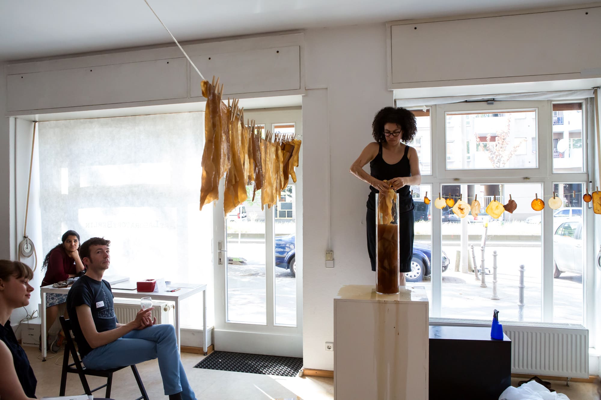 Die Künstlerin wird ihre Forschung in einer Mischform aus Performance, Vortrag und interaktivem Workshop präsentieren, was die Interdisziplinarität des Themas verdeutlicht. Sie wird theoretische Gesichtspunkte wie Subjektivität und Willensfreiheit erörtern, während sie den Teilnehmern den Kombucha-Drink serviert. Dadurch werden die Teilnehmer körperlich in das Werk eingebunden. Der Vortrag wird nicht nur Fakten und Ideen präsentieren, sondern sich einer starken affektiven Dimension bedienen. Wir werden die Ästhetik und die sensorischen Eigenschaften des Kombucha-Pilzes in einer Mitmach-Situation erforschen. Ein Schwerpunkt der Performance wird auf dem Geruch und der Substanz in Relation zu unseren Körpern – sowohl innerlich als auch äußerlich – liegen. Zum Schluss werden die Teilnehmer eine Probe zum Mitnehmen erhalten, die sie nutzen können, um die Substanz zuhause weiter zu züchten. Dadurch wird die Substanz buchstäblich ansteckend.