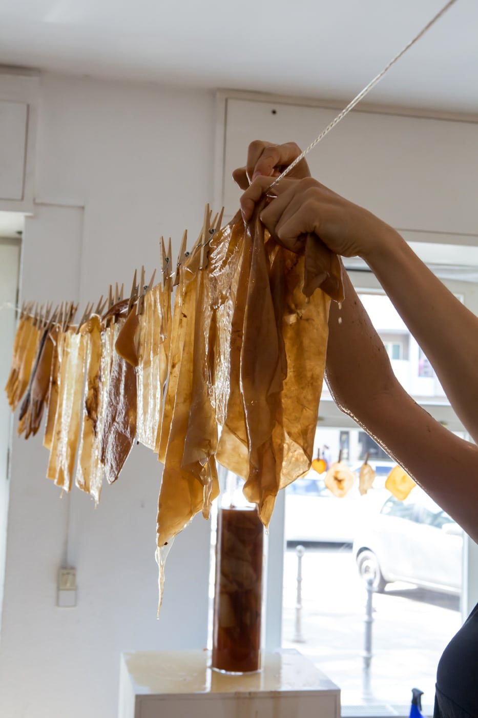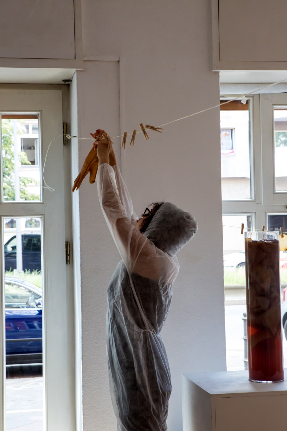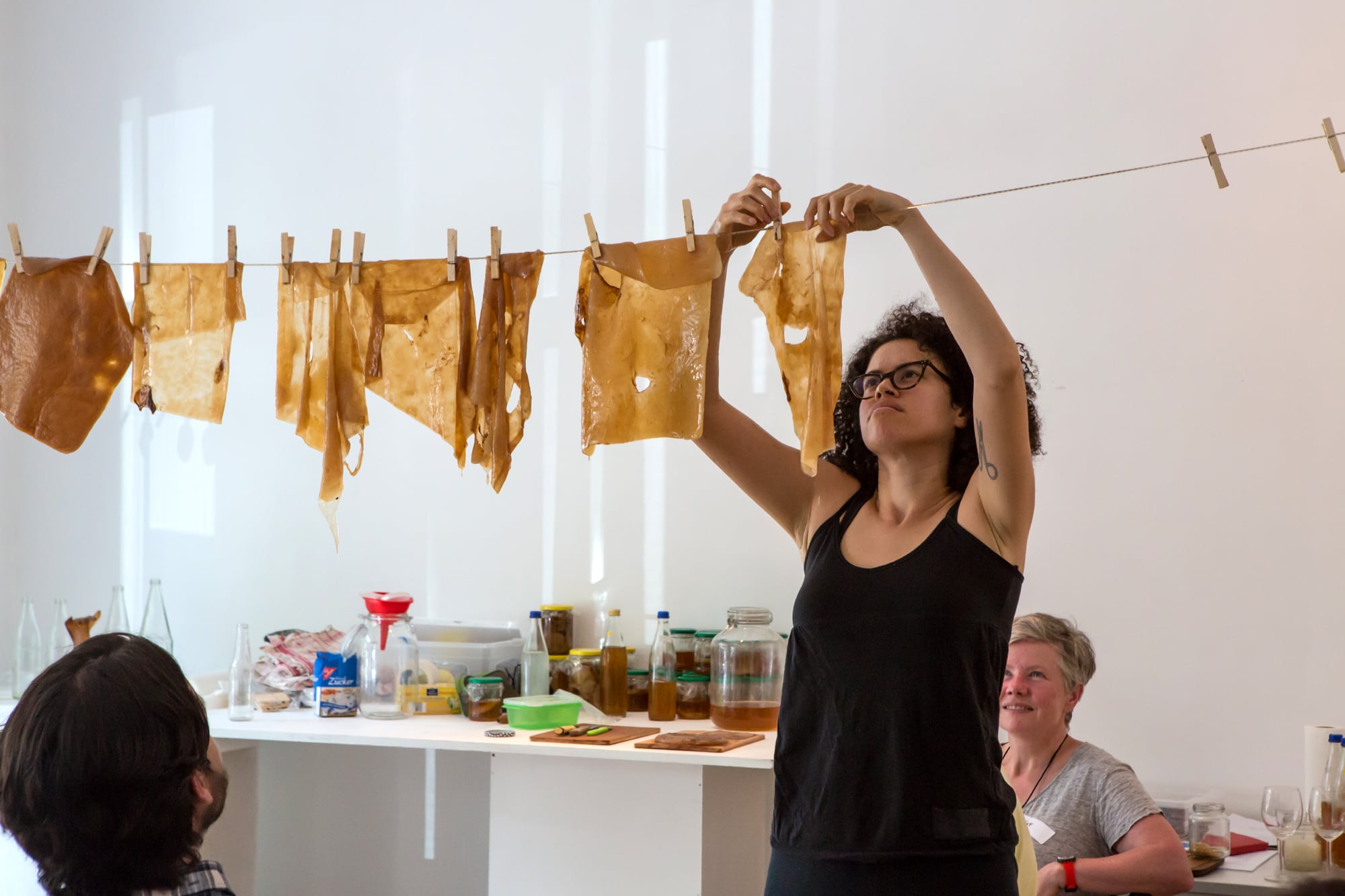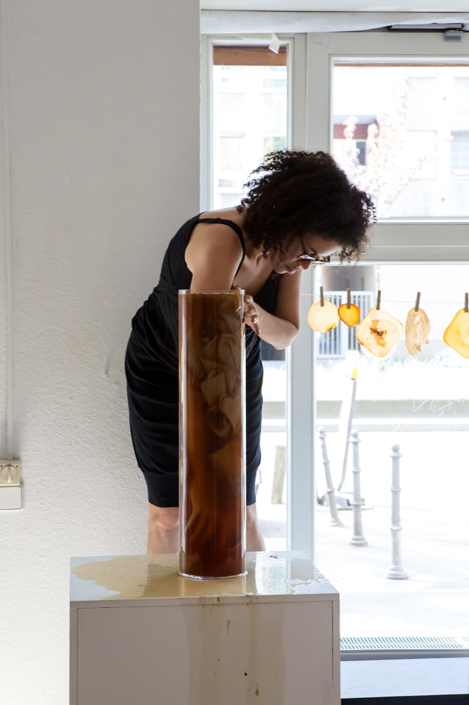 Die Künstlerin wird ihre Forschung in einer Mischform aus Performance, Vortrag und interaktivem Workshop präsentieren, was die Interdisziplinarität des Themas verdeutlicht. Sie wird theoretische Gesichtspunkte wie Subjektivität und Willensfreiheit erörtern, während sie den Teilnehmern den Kombucha-Drink serviert. Dadurch werden die Teilnehmer körperlich in das Werk eingebunden. Der Vortrag wird nicht nur Fakten und Ideen präsentieren, sondern sich einer starken affektiven Dimension bedienen. Wir werden die Ästhetik und die sensorischen Eigenschaften des Kombucha-Pilzes in einer Mitmach-Situation erforschen. Ein Schwerpunkt der Performance wird auf dem Geruch und der Substanz in Relation zu unseren Körpern – sowohl innerlich als auch äußerlich – liegen. Zum Schluss werden die Teilnehmer eine Probe zum Mitnehmen erhalten, die sie nutzen können, um die Substanz zuhause weiter zu züchten. Dadurch wird die Substanz buchstäblich ansteckend.