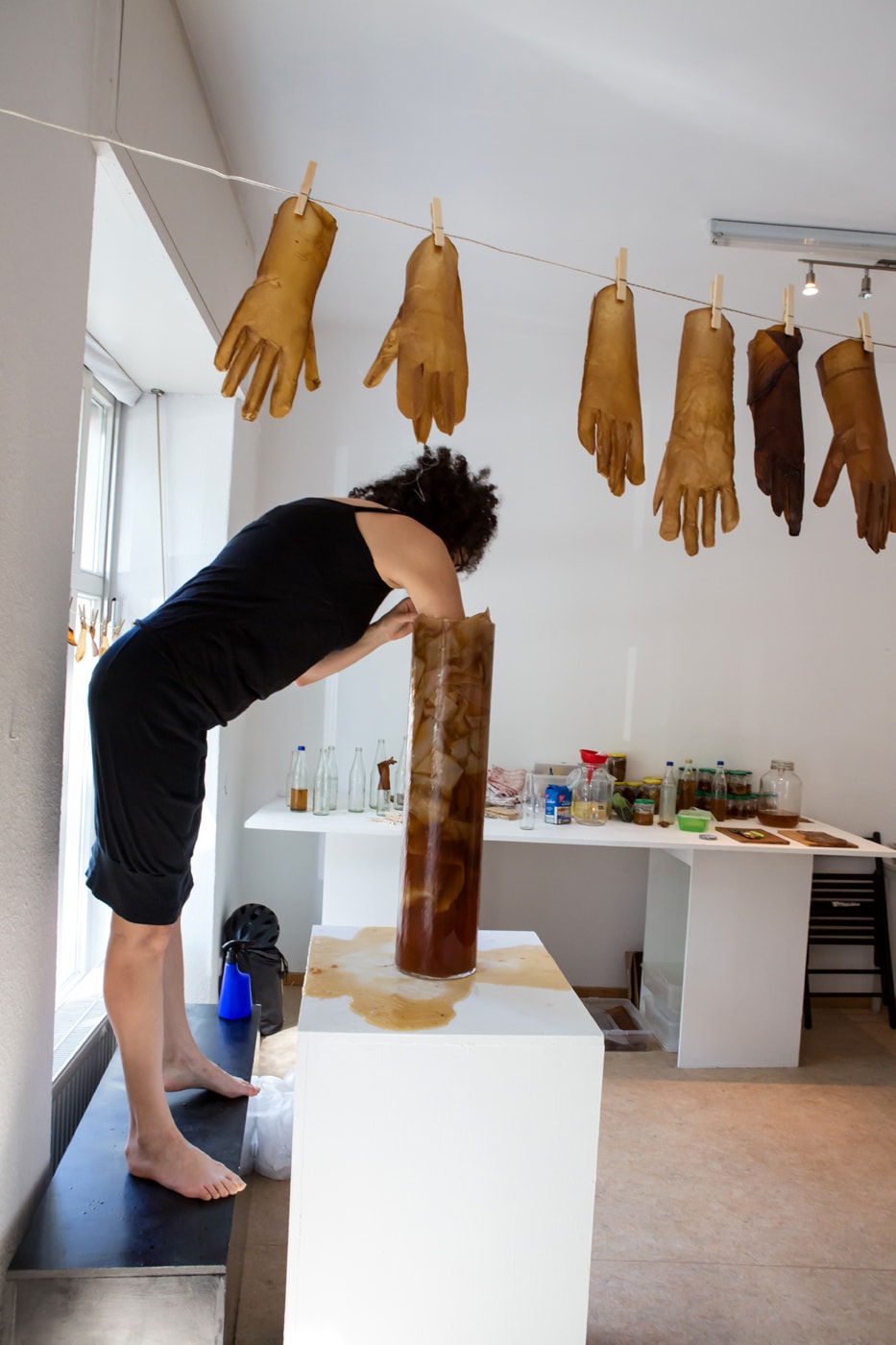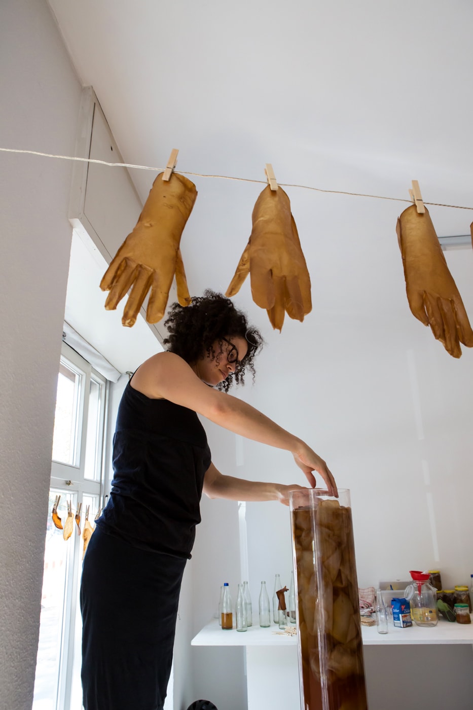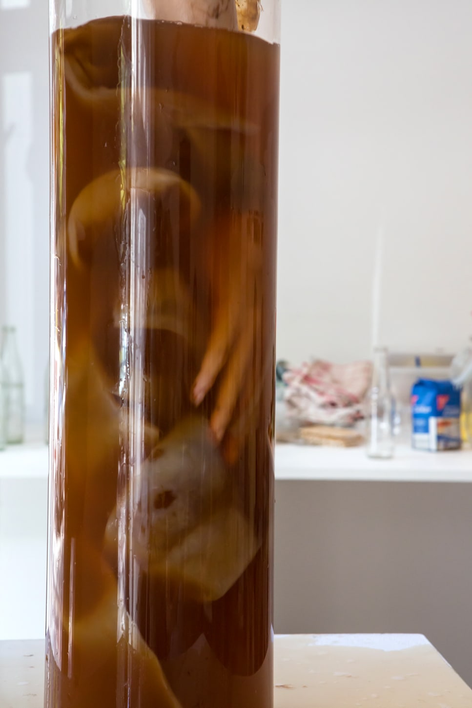Im Rahmen ihrer aktuellen Forschung hat Alanna Lynch Mikroorganismen gezüchtet, die Kombucha-Tee erzeugen. Während des Fermentierungsprozesses produziert diese symbiotische Kolonie von Bakterien und Hefe (Hefepilz, auf englisch SCOBY, symbiotic colony of bacteria and yeasts) Zellulose, ein Material, das schleimig ist, in nassem Zustand stark riecht und getrocknet als Textil verwendet werden kann. Lynchs Interesse, mit dieser Lebensform zu arbeiten, geht jedoch über deren Materialeigenschaften hinaus. Während ihrer Forschung konsumiert sie aktiv die Mikroorganismen ihres Forschungsgegenstands, indem sie den Tee trinkt. Lynch reflektiert folgende Phänomene: Die Hälfte der Zellen im menschlichen Körper sind bakterielle Zellen. Laut der Mikrobiom-Darm-Hirn-Achse beeinflussen Bakterien im Darm nachweislich die Psyche und damit menschliches Denken, Fühlen und sogar Handeln. Bakterien verfügen über ein tiefgreifendes Potential, Kategorien wie Subjekt/Objekt, Geist/Körper und menschlich/nichtmenschlich zu hinterfragen.