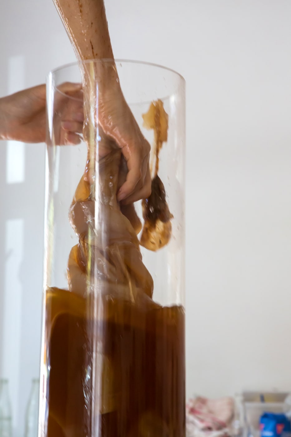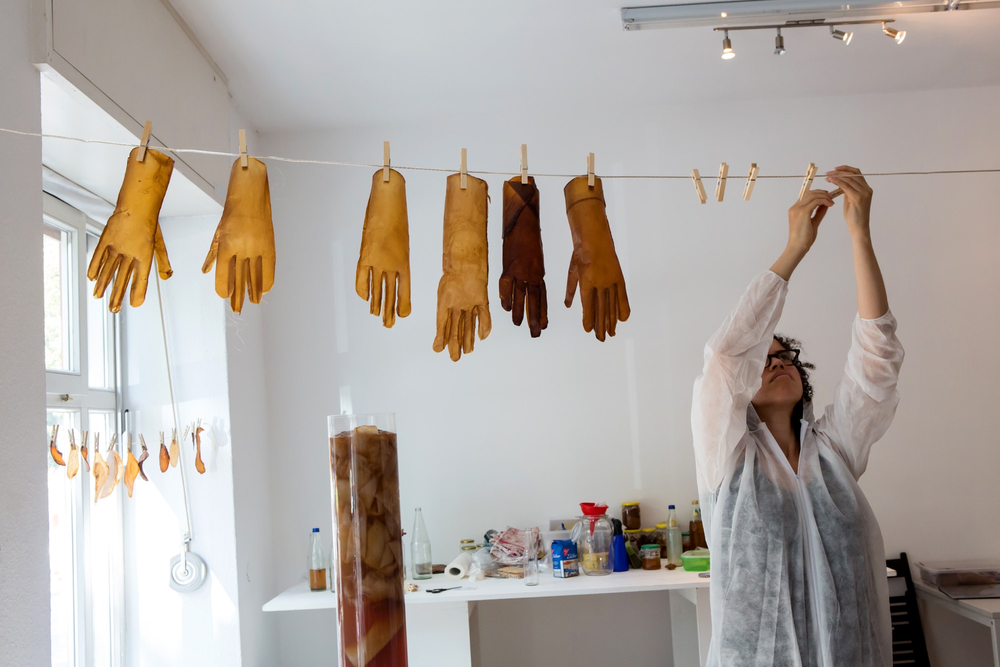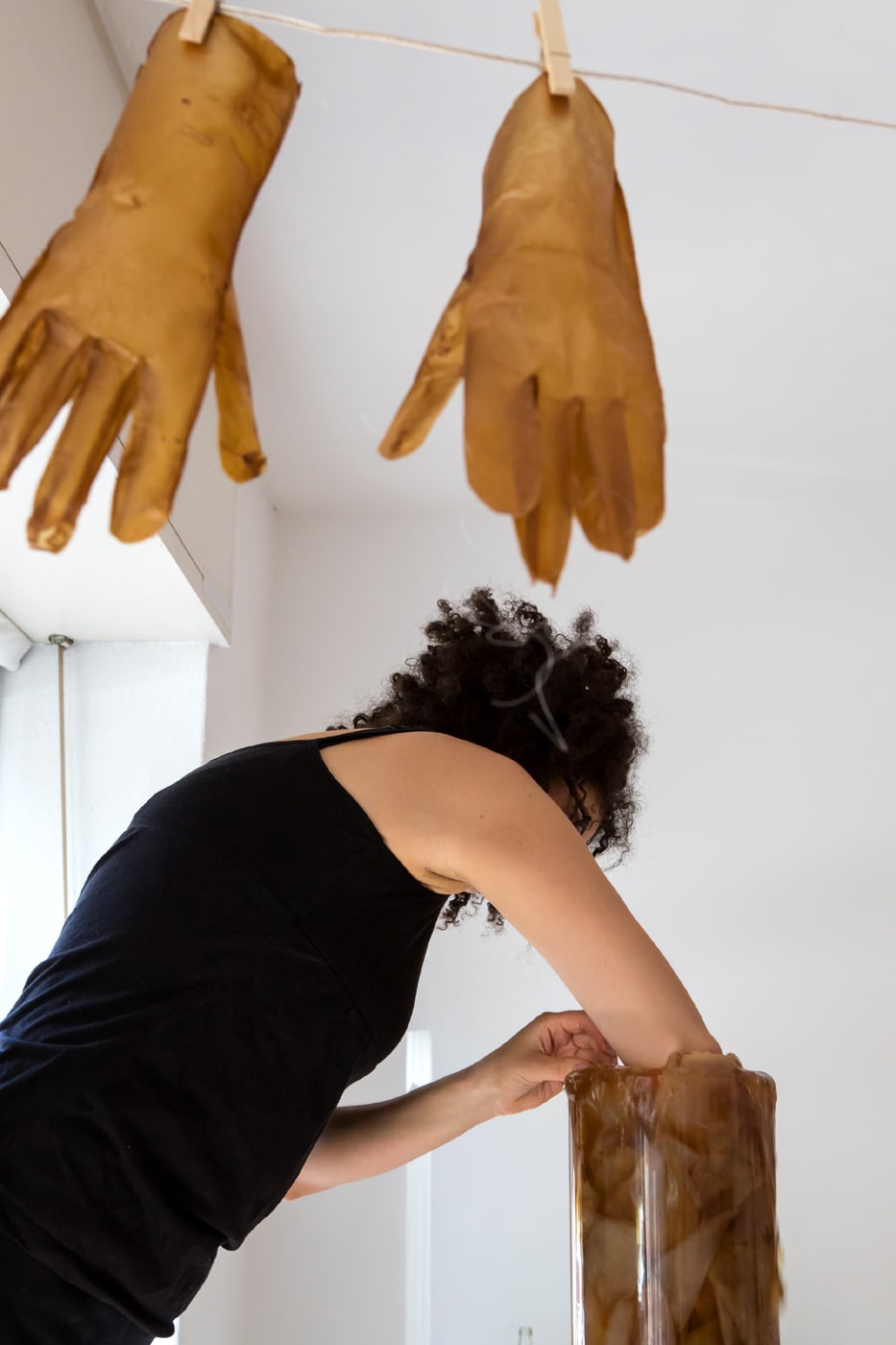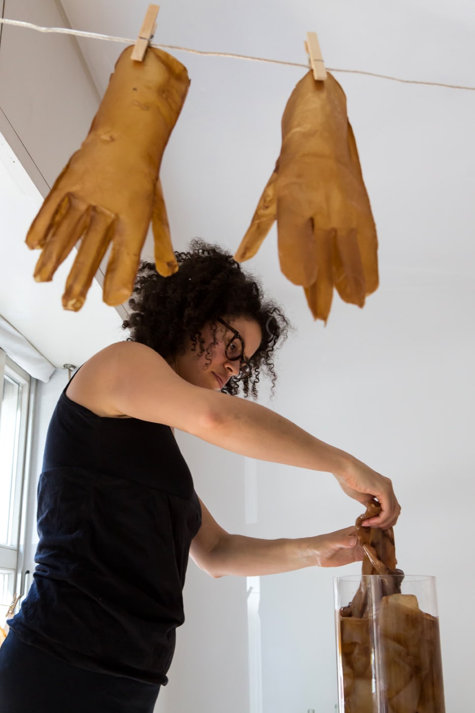 Im Rahmen ihrer aktuellen Forschung hat Alanna Lynch Mikroorganismen gezüchtet, die Kombucha-Tee erzeugen. Während des Fermentierungsprozesses produziert diese symbiotische Kolonie von Bakterien und Hefe (Hefepilz, auf englisch SCOBY, symbiotic colony of bacteria and yeasts) Zellulose, ein Material, das schleimig ist, in nassem Zustand stark riecht und getrocknet als Textil verwendet werden kann. Lynchs Interesse, mit dieser Lebensform zu arbeiten, geht jedoch über deren Materialeigenschaften hinaus. Während ihrer Forschung konsumiert sie aktiv die Mikroorganismen ihres Forschungsgegenstands, indem sie den Tee trinkt. Lynch reflektiert folgende Phänomene: Die Hälfte der Zellen im menschlichen Körper sind bakterielle Zellen. Laut der Mikrobiom-Darm-Hirn-Achse beeinflussen Bakterien im Darm nachweislich die Psyche und damit menschliches Denken, Fühlen und sogar Handeln. Bakterien verfügen über ein tiefgreifendes Potential, Kategorien wie Subjekt/Objekt, Geist/Körper und menschlich/nichtmenschlich zu hinterfragen.