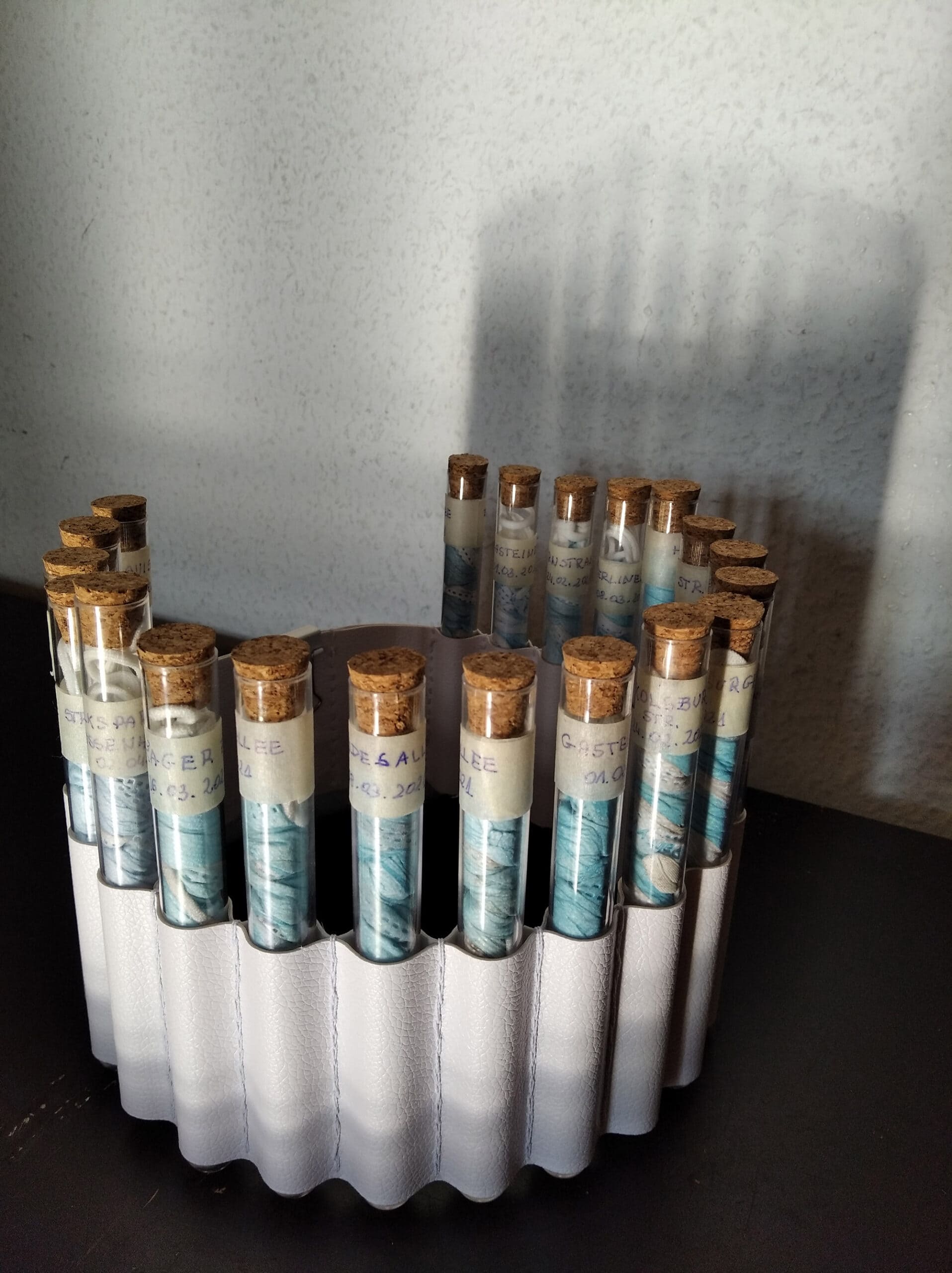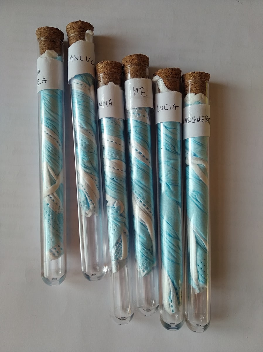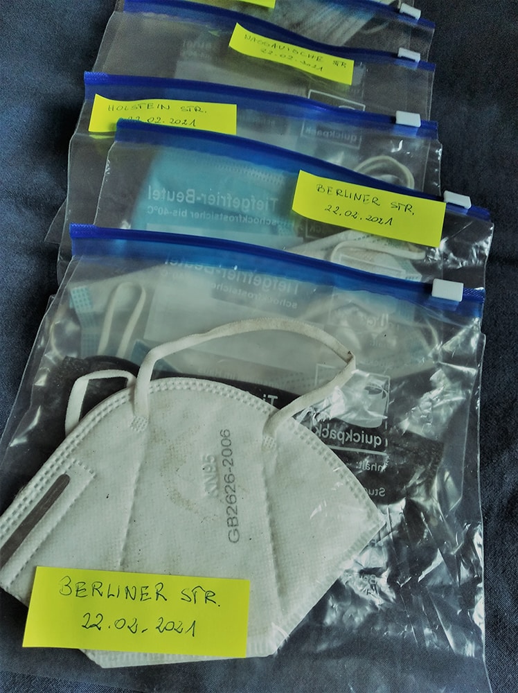 Im Frühjahr 2021 beschloss ich, Masken auf den Straßen Berlins zu sammeln, um sie in Zukunft als Laborproben zu verwenden. Es handelte sich um eine spezifische Aktivität im Umgang mit Masken, die als Abjekt und möglicher Ort des Virusstandortes verstanden wurden. Ich habe die gesammelten Masken in Laborröhrchen gelegt.