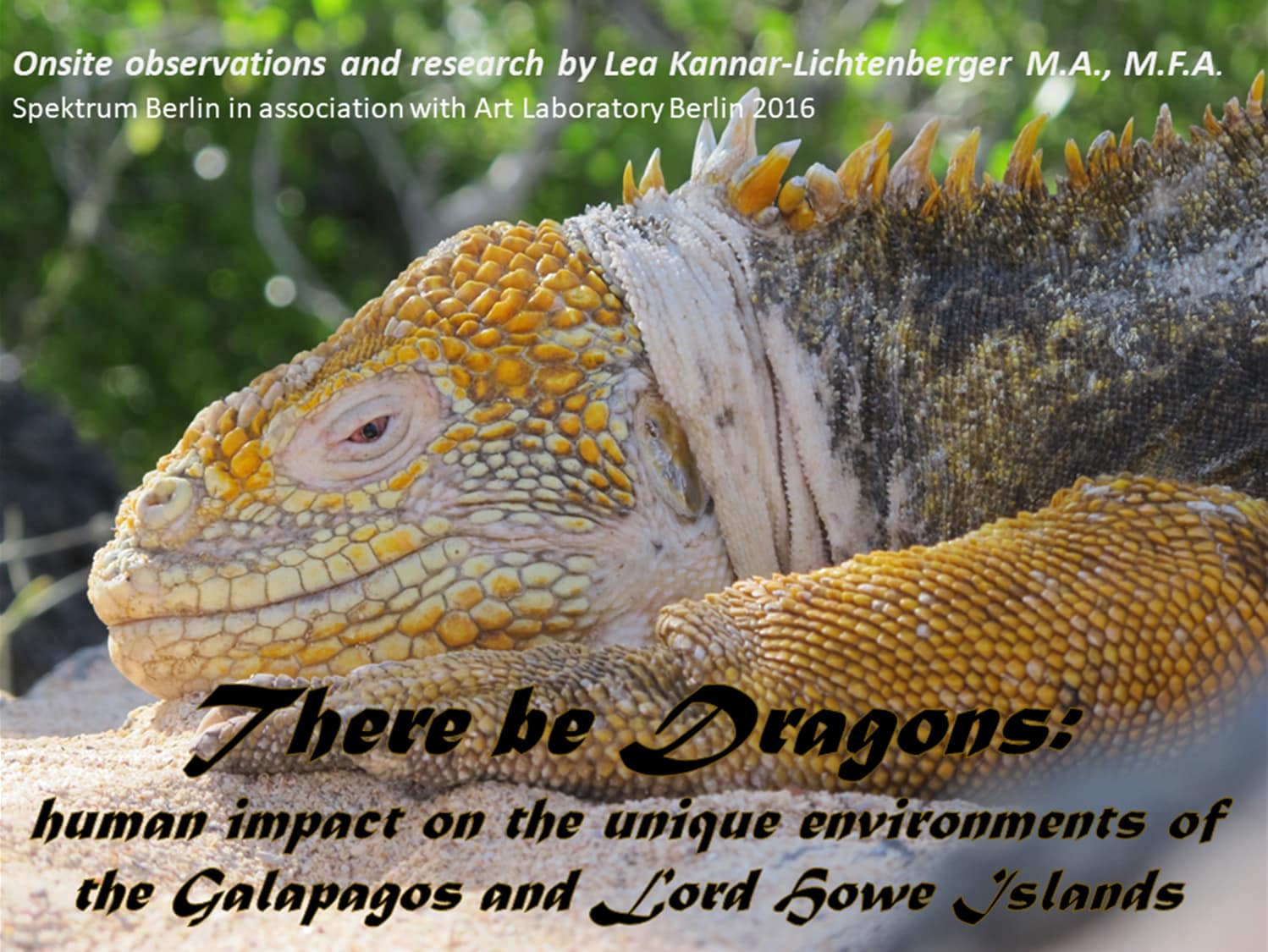 „Im Zeitalter des Anthropozäns wird dieser Vortrag erforschen, wie der Mensch unsere Welt sowohl durch seine Anwesenheit als auch indirekt durch seinen Lebensstil beeinflusst. Es handelt sich um eine wissenschaftlich-künstlerische Untersuchung des Tourismus und seiner Auswirkungen auf geschlossene Ökosysteme, insbesondere auf die Galapagos- und Lord Howe-Inseln (beide als Weltnaturerbe gelistet). Durch meine künstlerischen Untersuchungen arbeite ich daran, das Bewusstsein der Öffentlichkeit zu schärfen, um ein relevanteres Verständnis für die Problematik des menschlichen Einflusses auf die Umwelt und ihre langfristigen Auswirkungen zu schaffen.