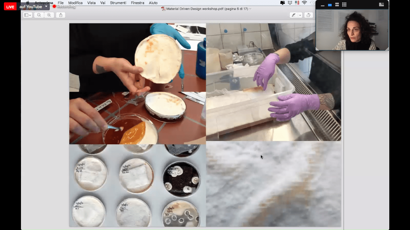 Fara Peluso, a Berlin based artist-designer, graduated in industrial design and graphic design at University of Spienza, Deptm. for Architecture, Rome. Through speculative research her work connects the human being with nature, living organisms and biological processes to form a deeper relationship. Together with biologists, she has pursued deep research into algae, taking constantly inspiration from them, experimenting and understanding how to work with them inside the fields of Art and Design. In collaboration with BioArt Laboratories in Eindhoven, she developed the prototyping of a speculative wearable accessory, WeaReactor, which connects the algae’s photosynthesis process with the breath of the wearer (exhibited at DDW17 in Eindhoven in 2017; at Art Laboratory Berlin in 2019). Peluso has extended this knowledge over the last 15 months by working with researchers at the TU Berlin Institute of Biotechnology on mycelium-based materials as an artist-designer-in-residence in the project Mind the Fungi.