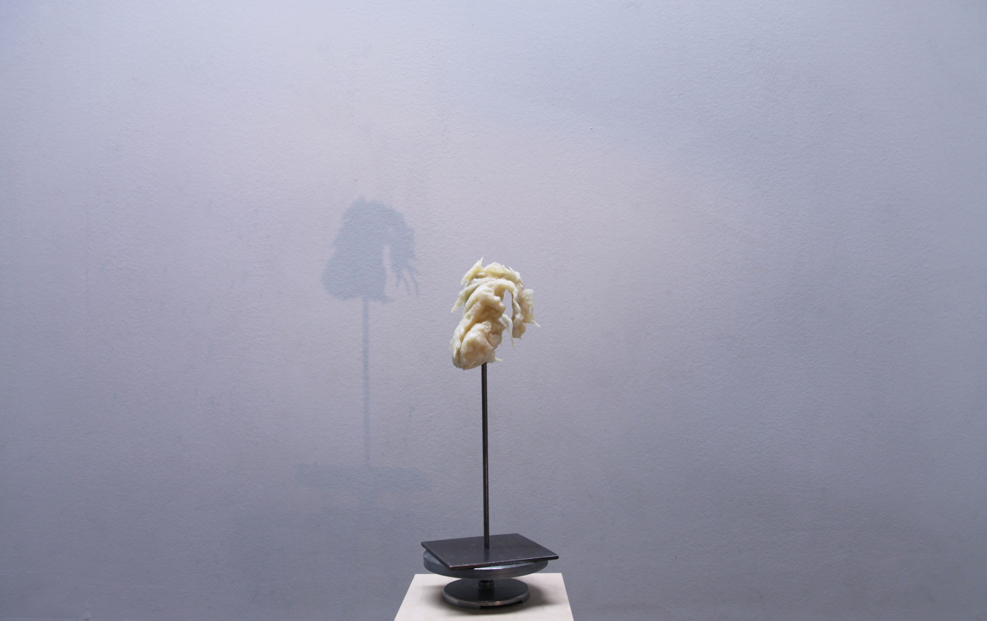I am an Artefact explores what the soul is and traces the location of the soul in the human body through scientific and speculative perspectives. The ancient Egyptians believed that the soul was in the heart and the Babylonians believed that the soul was in the liver. Modern humans understand that there is no soul or that it is an emotion caused by a chemical reaction of the brain. The human body and soul are Park’s main concerns in this project, related to the technological age. The process of the artwork I am an Artefact started with full body MRI scans of himself. The artist created a series of objects with different materials, such as a 1:1 size of Park’s heart sculpted with beeswax, a head scan, that is used for a 3D cut glass sculpture, and forefinger prints sculpted with aerogel – a material which is renowned as the lightest solid. Through this set of works, Park has given a speculative, physical agency to the soul and distributed the meaning of the soul and its materiality to ‘natural and artificial materials.’