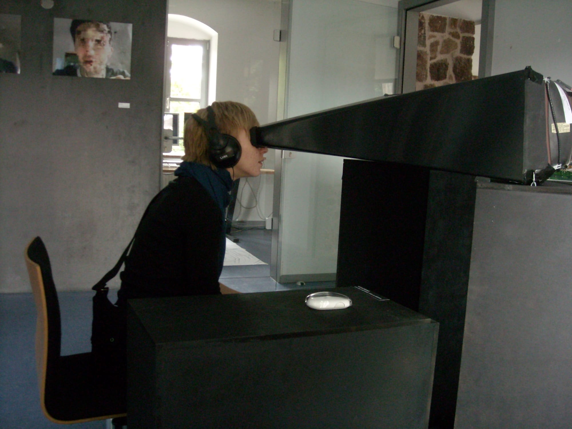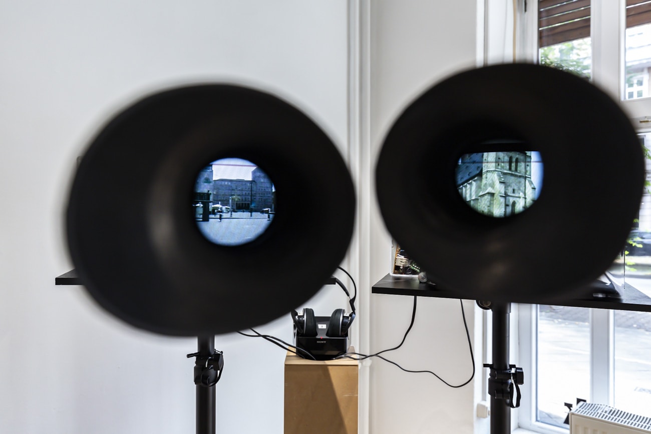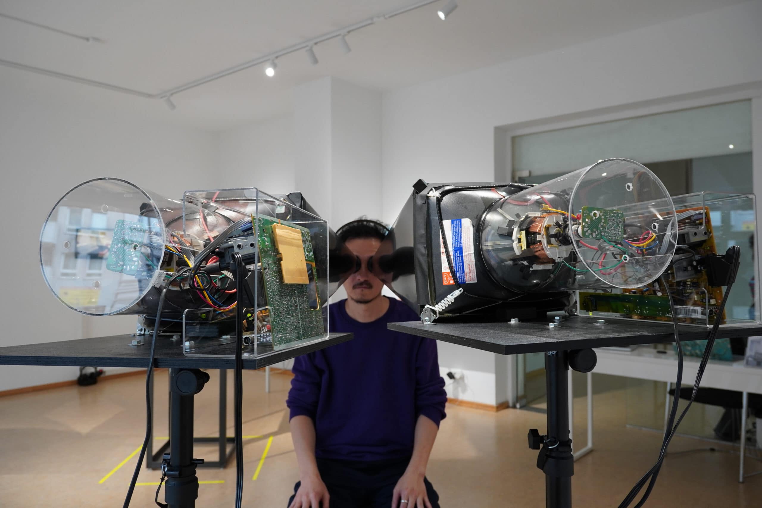 Utopia is an interface that allows the audience to explore visual senses from a nonhuman perspective. This interface aims to create a connection between humans and machines. Analog monitors symbolise the anatomical eyes of humans. A funnel is installed in front of the monitor, so the audience can only see each monitor with one of their eyes independently. Human vision, unlike spiders or insects, cannot see both objects at the same time. However, by looking at the two monitors with this separation, the audience gains a new visual and cognitive experience, exploring the expandability of their human senses.