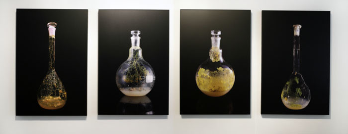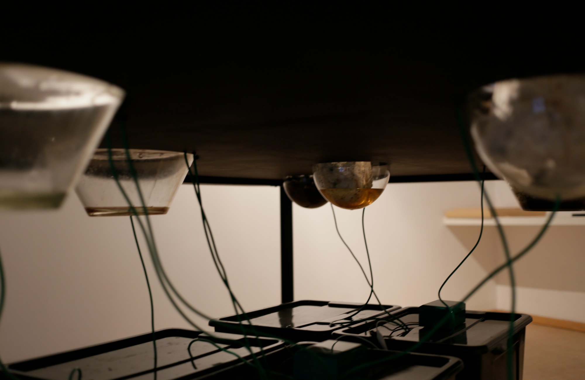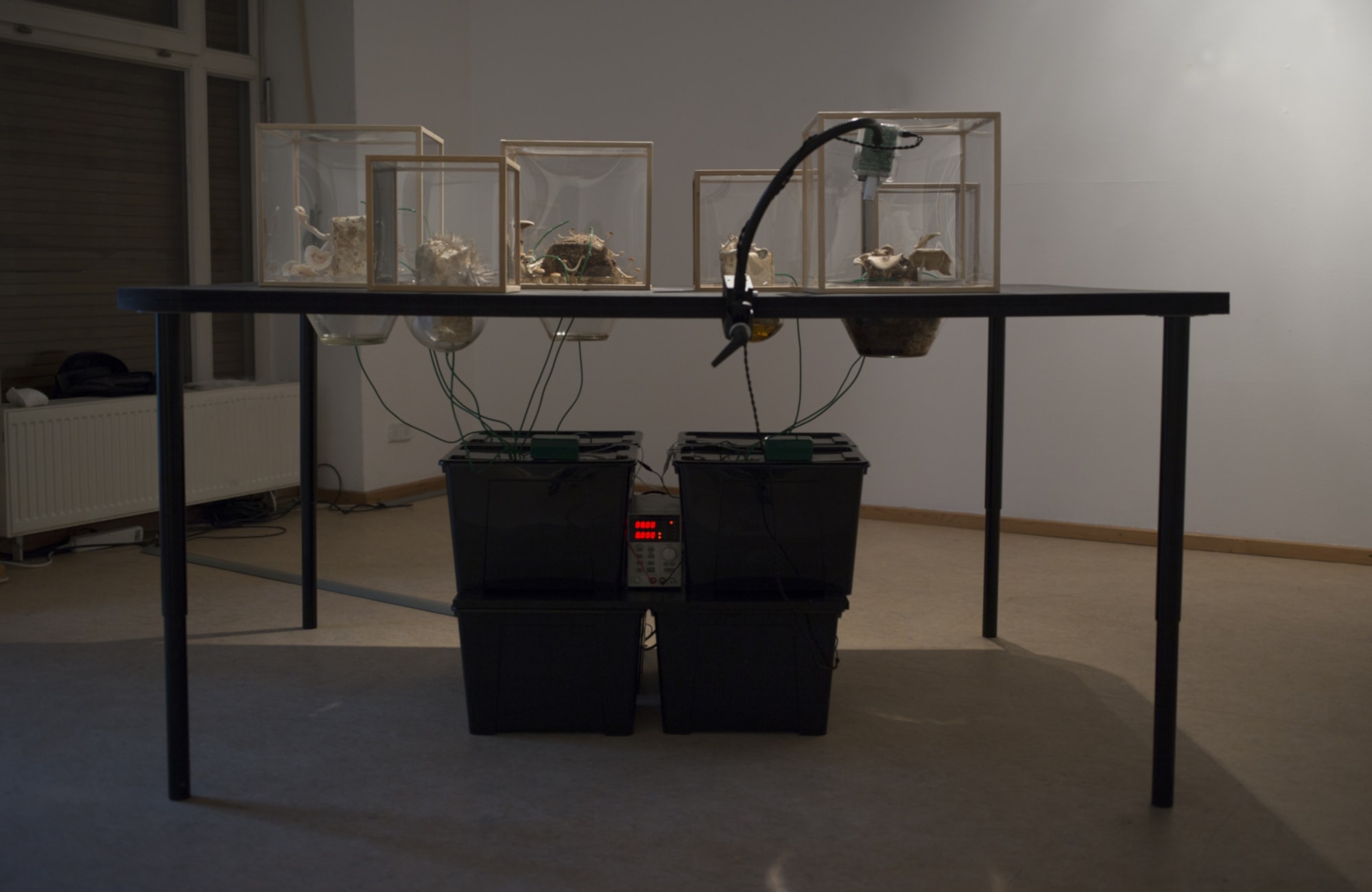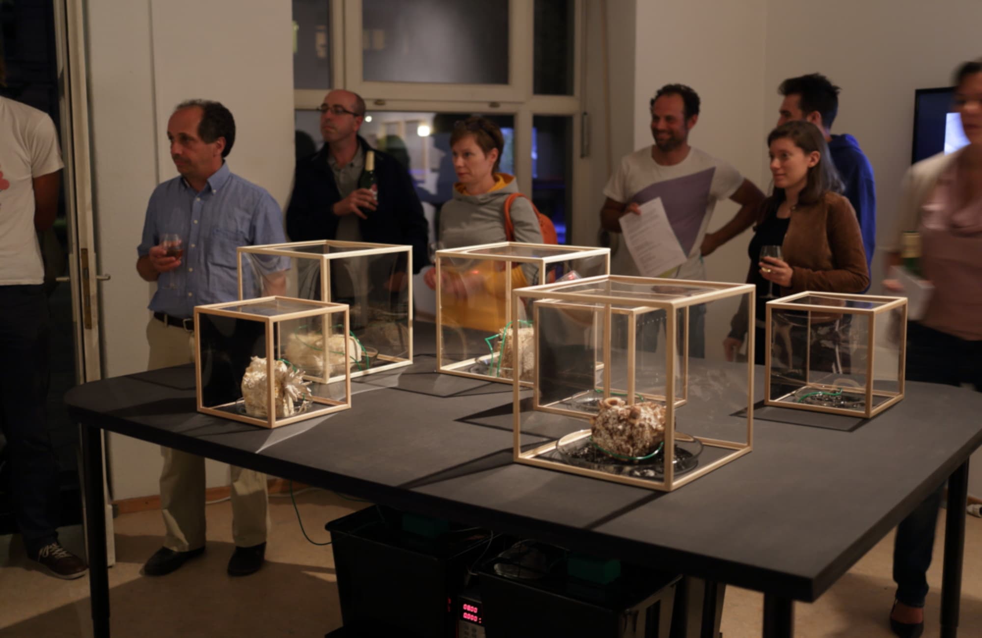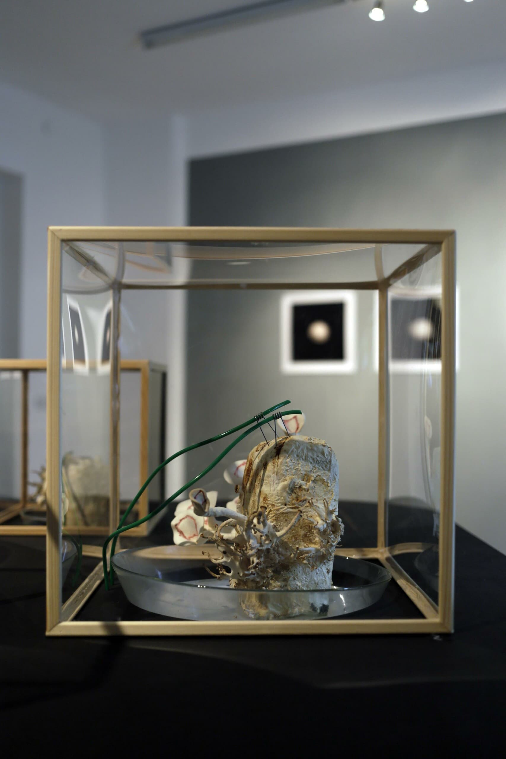 The exhibited works have been developed as part of her PhD research at the Bauhaus University Weimar. In the words of Theresa Schubert: “The works want to challenge common understandings of creativity and emphasize a posthuman view on the world and its creatures. Common ground is the intervention on membranes. A membrane appears in both the exterior and interior of living beings; in the case of a cell membrane it is part of the smallest building block of life, but it also separates two different states. Further, it is an investigation into the aesthetics and mechanisms of natural growths processes.”