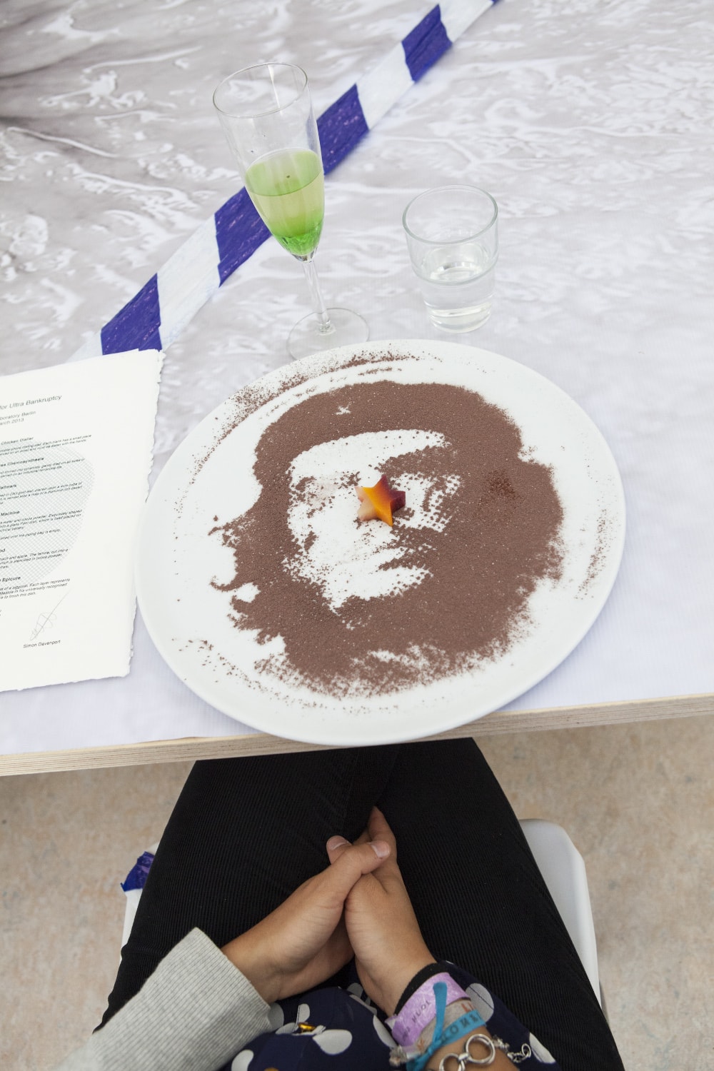 A Banquet for Ultra Bankruptcy is made up of five performances for six guests. Each guest receives a hand printed menu. During a six-course menu selected foods are combined with images, sounds and scents. The entire room – the table and chairs, the chandelier as well as the choreographed presentation – will be staged by the artists. Each course is designed as an aesthetic experience, allowing the audience to participate in simultaneous sensations. While Carl Rowe is responsible for the cooking, Simon Davenport will complement the culinary delights with the presentation of conflicting external stimuli such as poetry, released gases or rich gestural movements.