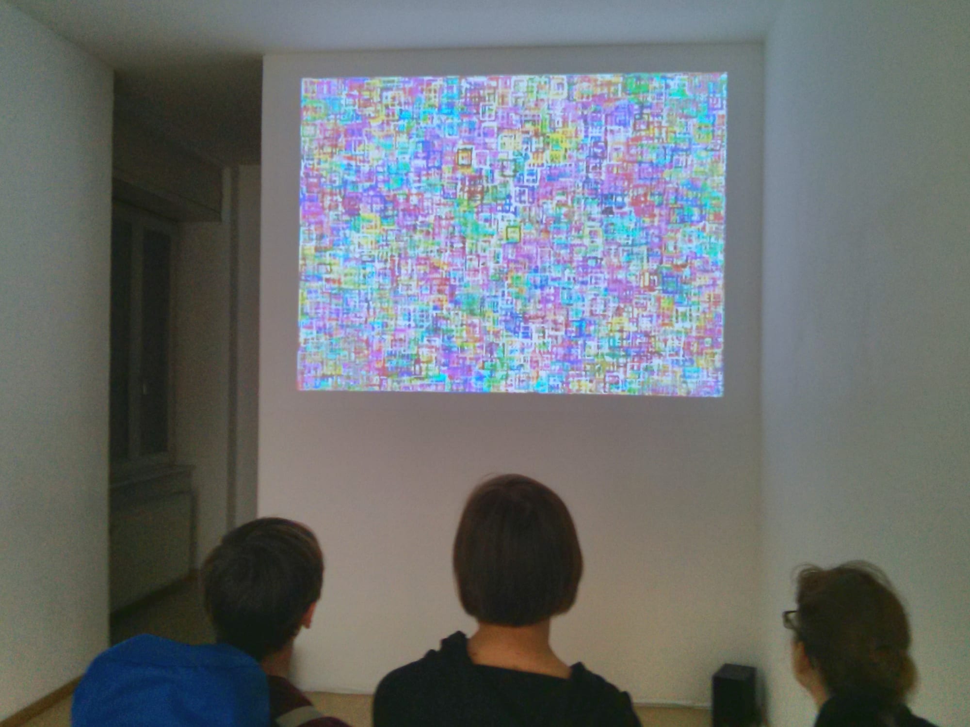 The work Circus 8 (1986/2008) consists of eight pieces and is based on Grossi’s HomeArt programs, which automatically generated sound. Maltagliati has expanded Grossi’s principle with software programs and added visual graphic variations. Circus#1, for example, is a polyphony of images and sounds. The polyphonic textures match a chromatic system. This could be interpreted as a digital musical palimpsest. The visual data generated by the computer approximates the graphic score for a sound composition (cf. John Cage).