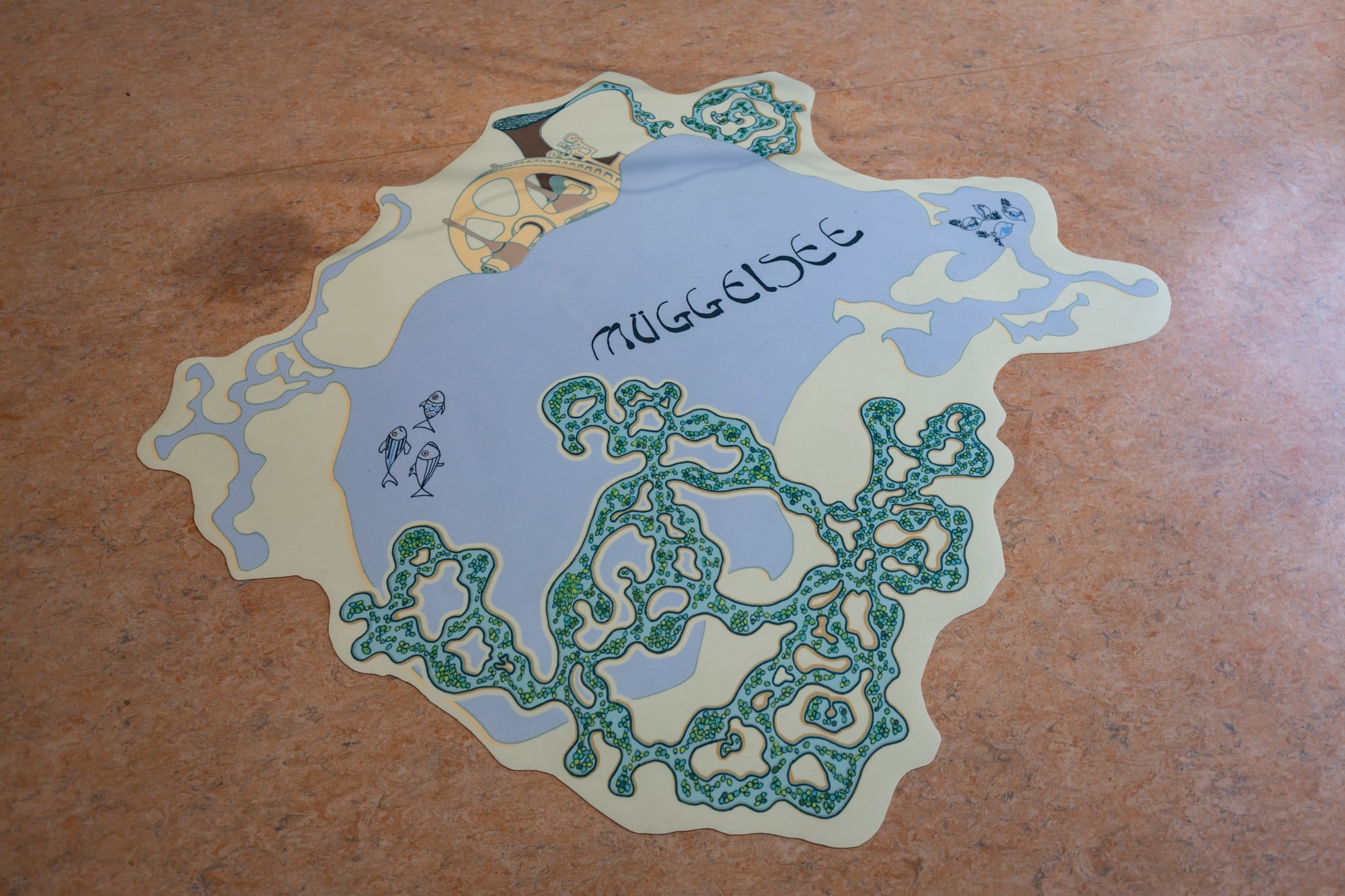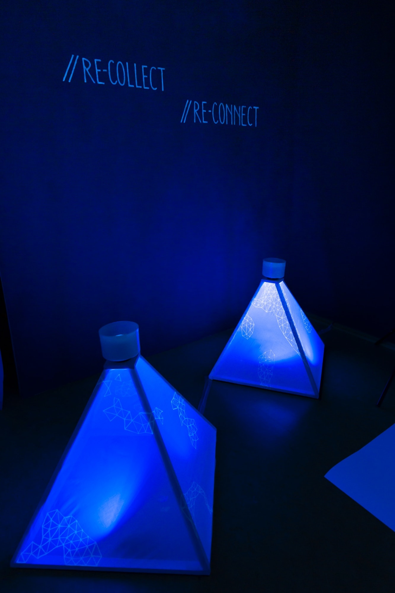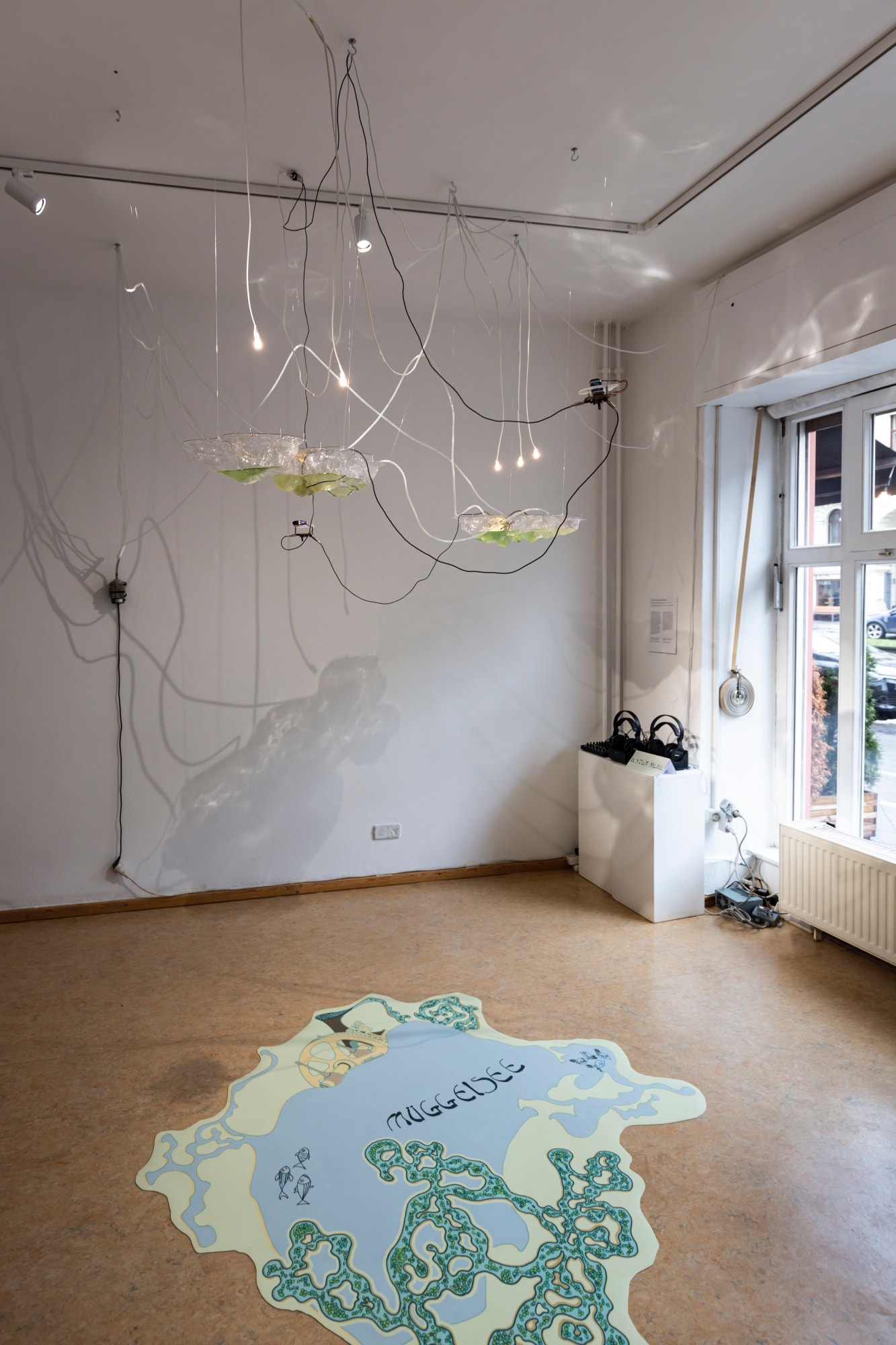 Cammack Lindsey: Wem gehört die Welt?, 2023, sound installation, PCB, hydrophone, Microcystis aeruginosa, water samples from Müggelsee, epoxy/ thermoplastic containers, vinyl map, photo: Tim Deussen