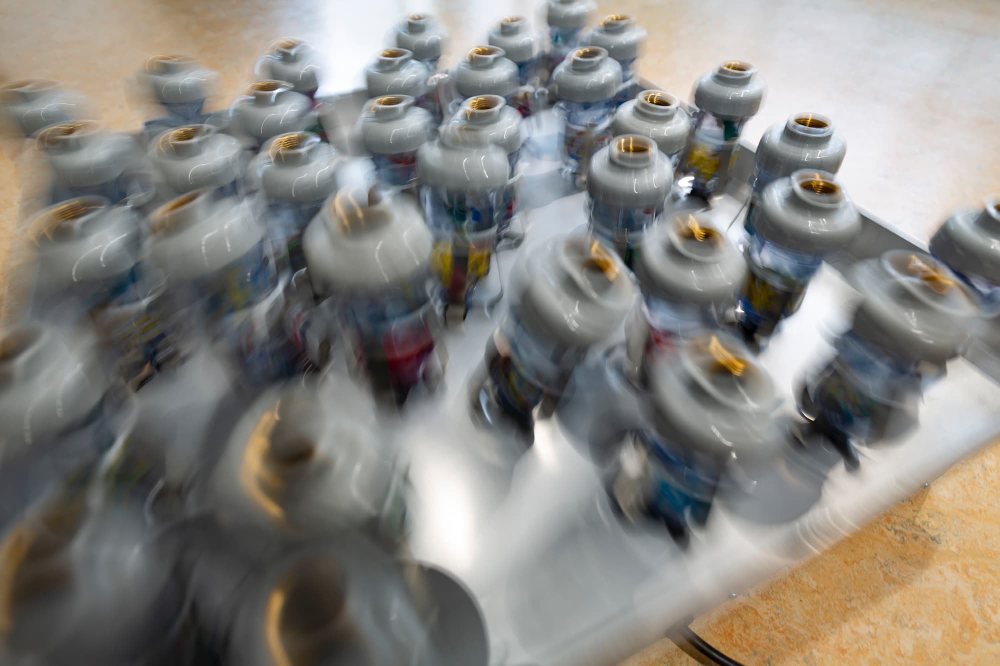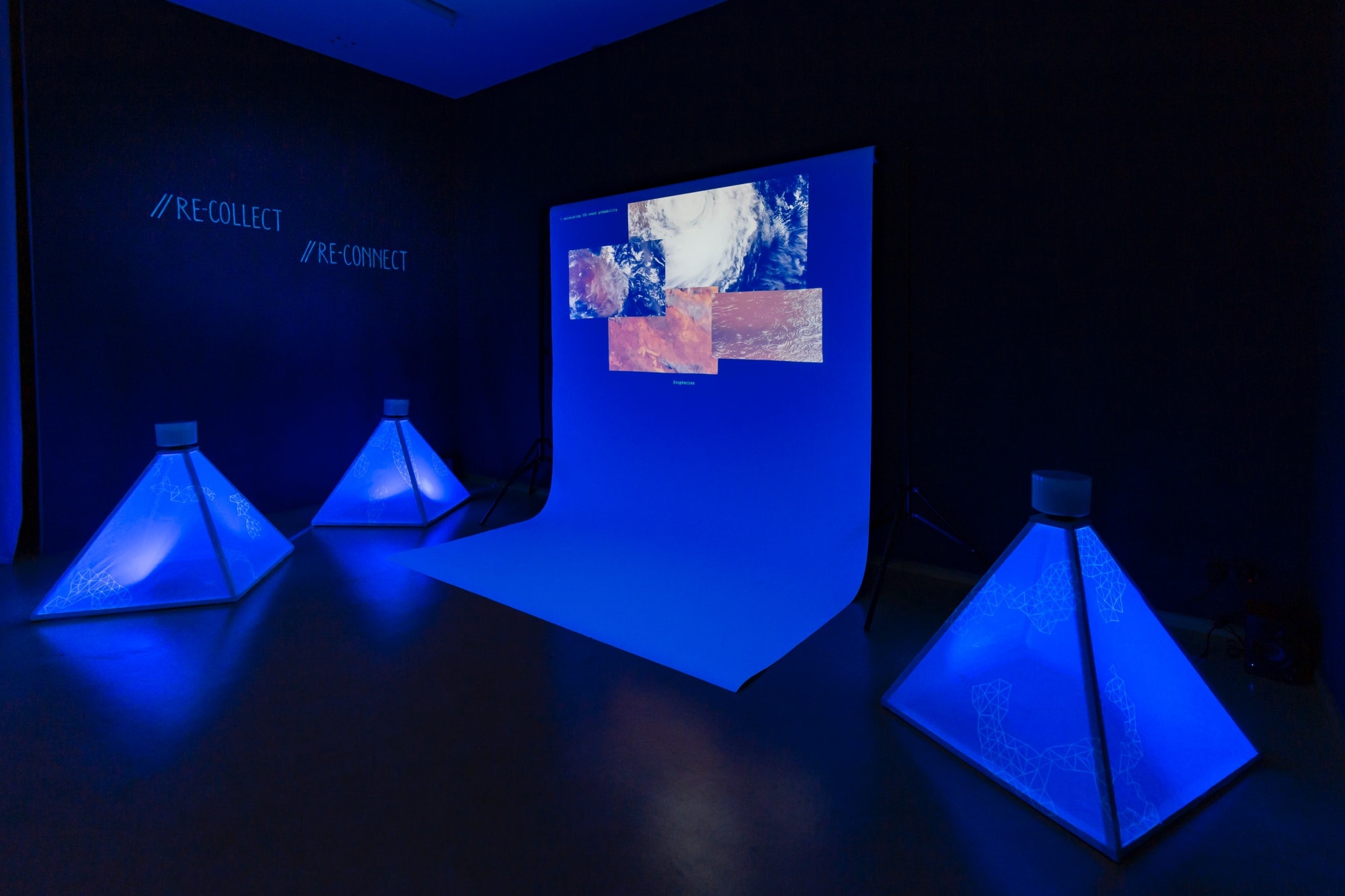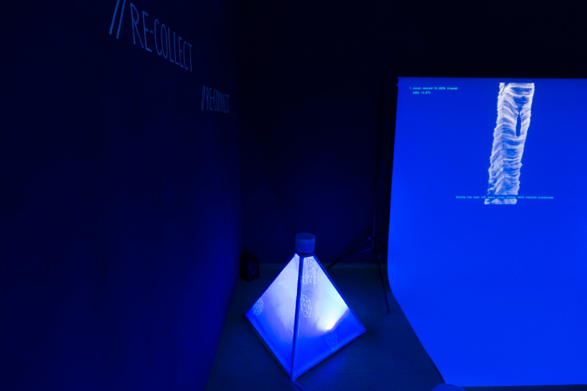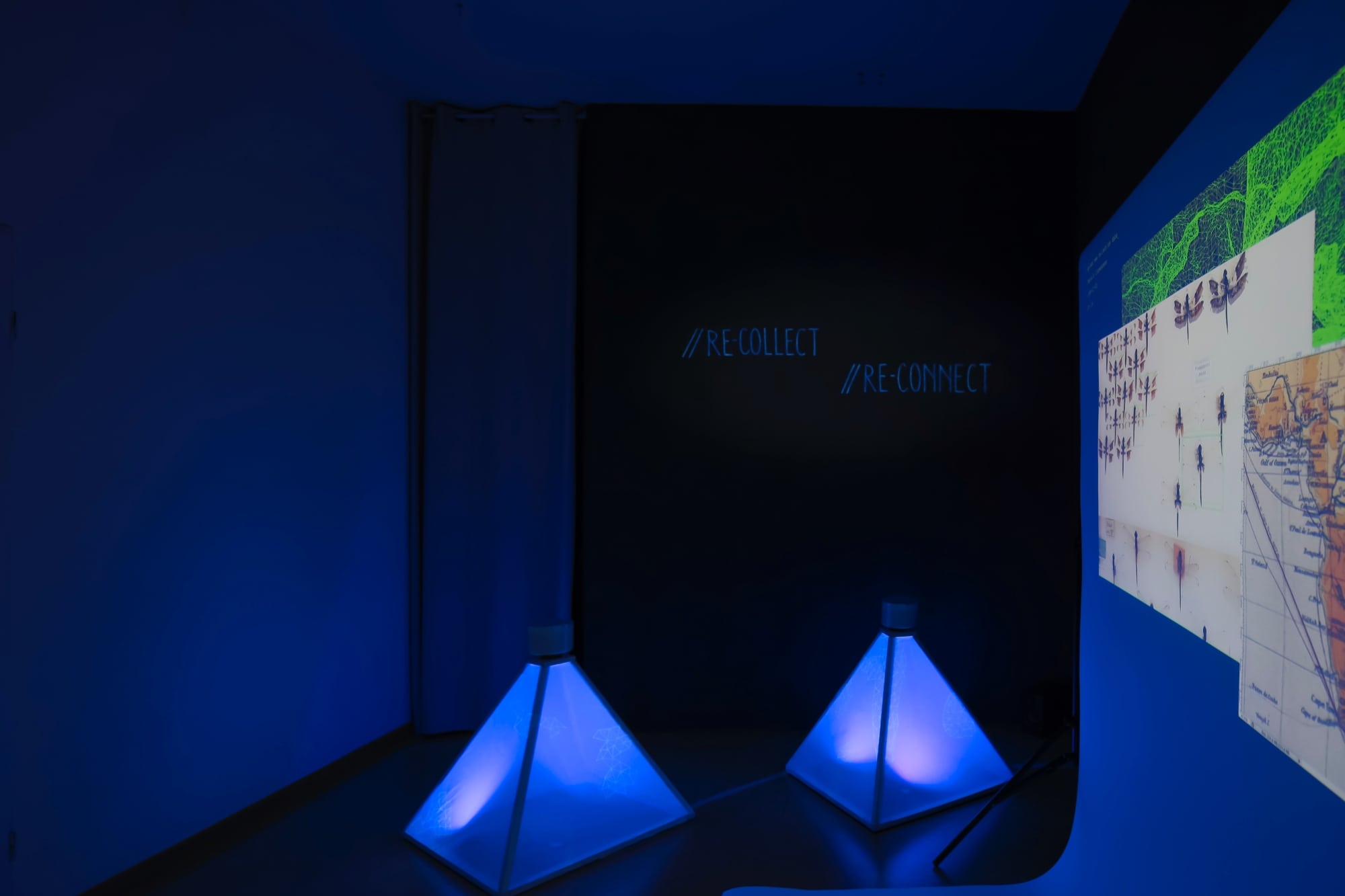 Cammack Lindsey: Wem gehört die Welt?, 2023, sound installation, PCB, hydrophone, Microcystis aeruginosa, water samples from Müggelsee, epoxy/ thermoplastic containers, vinyl map, photo: Tim Deussen
