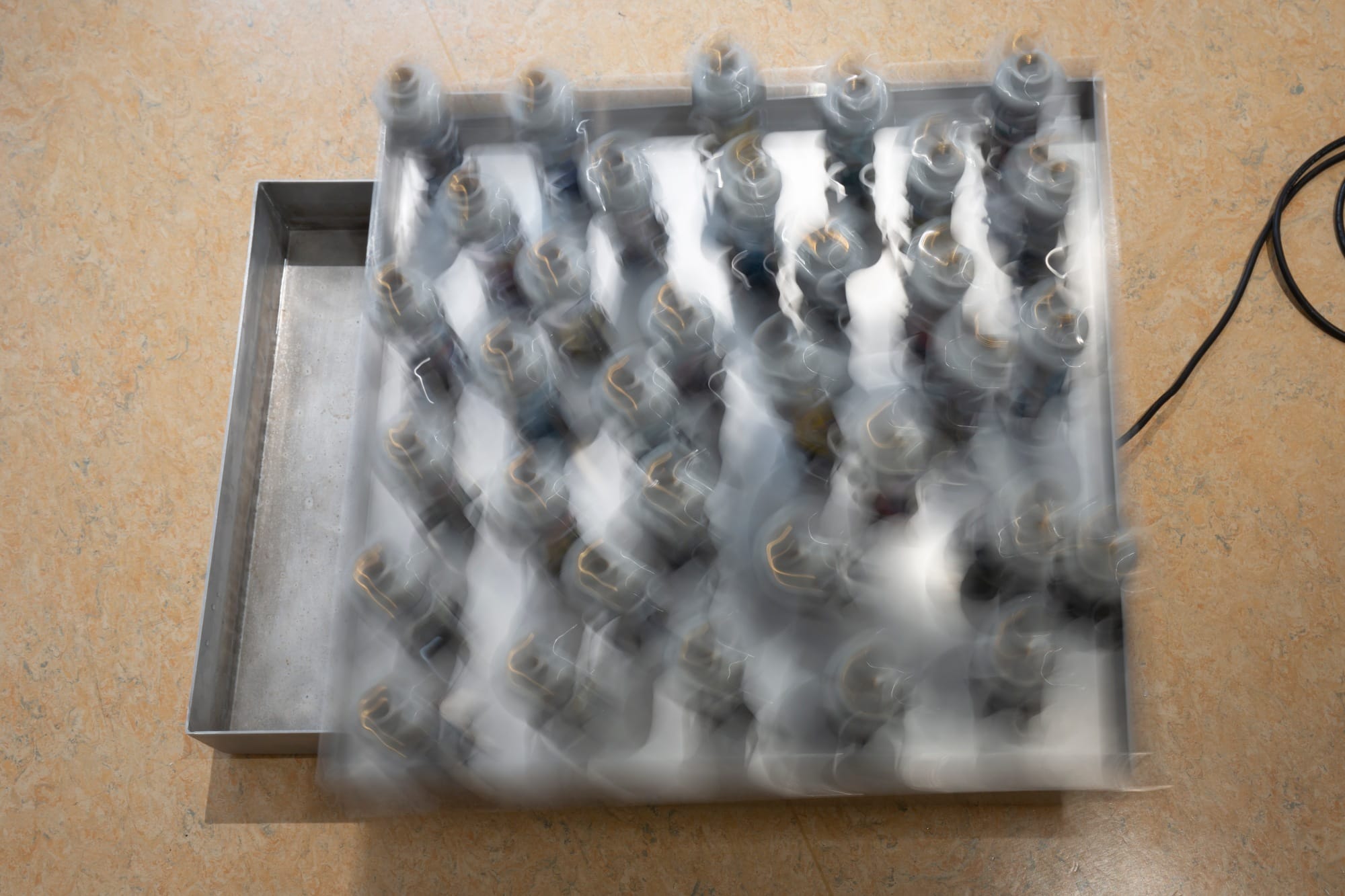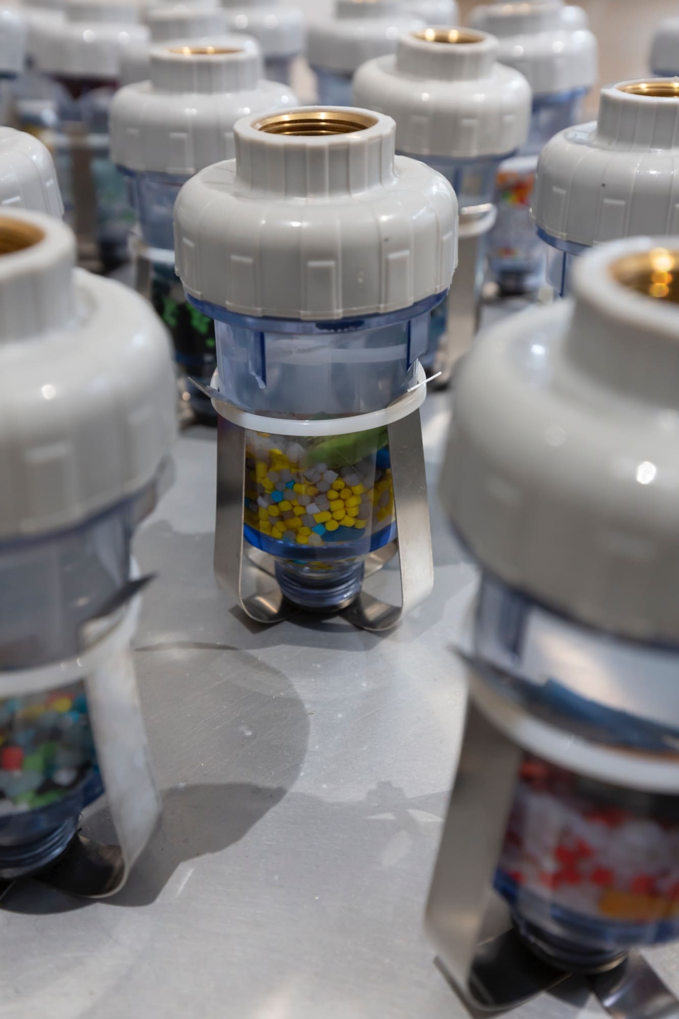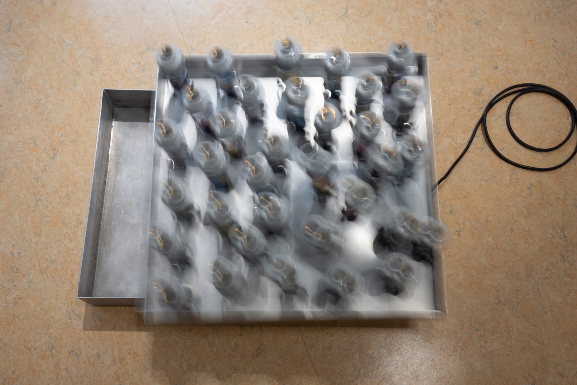 Gülşah Mursaloğlu: Devouring the Earth, in Perishable Quantities, 2020-ongoing, aluminium, washing machine filters, Arduino uno, motor, industrial and found microplastics, photo: Tim Deussen