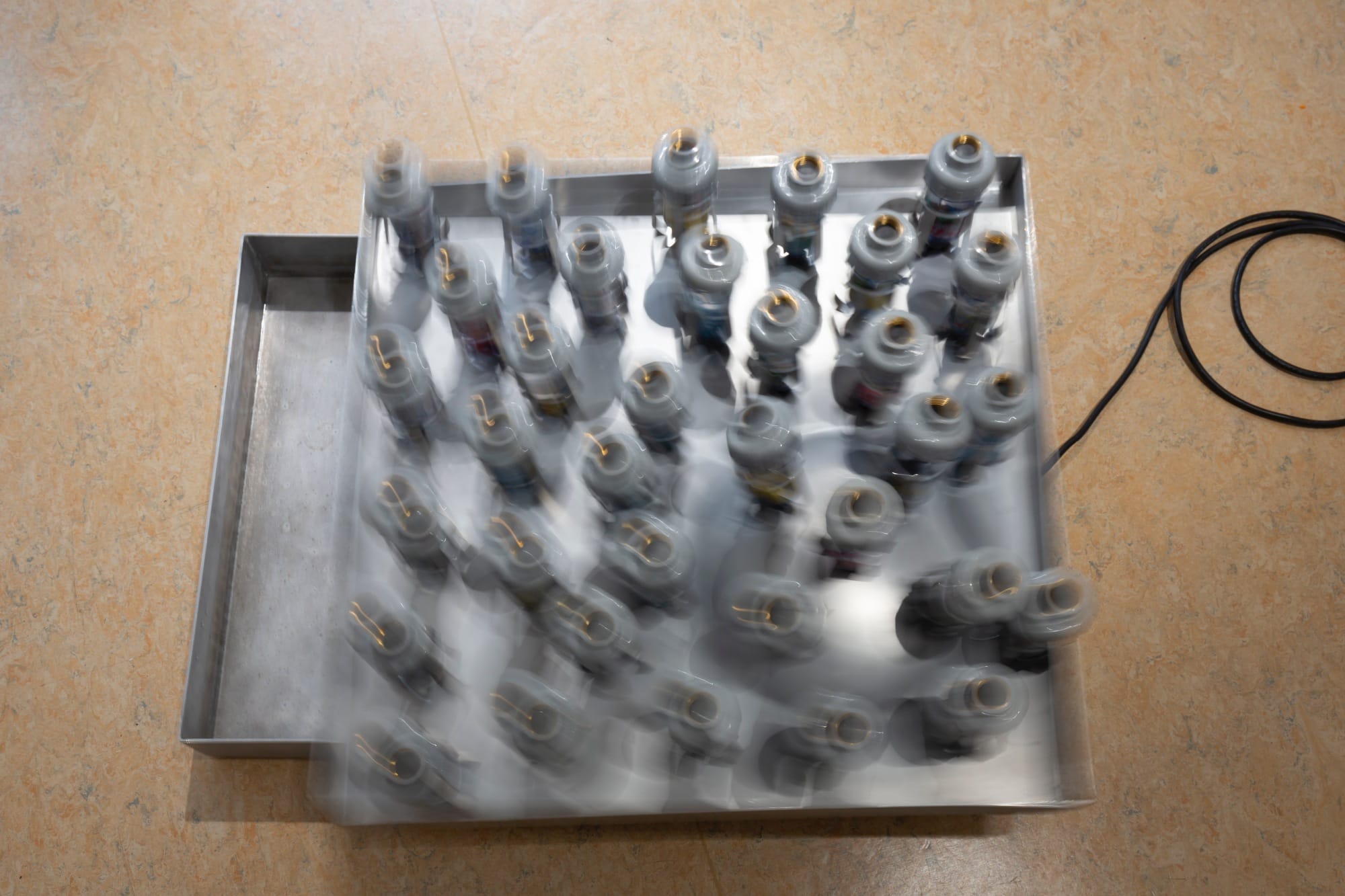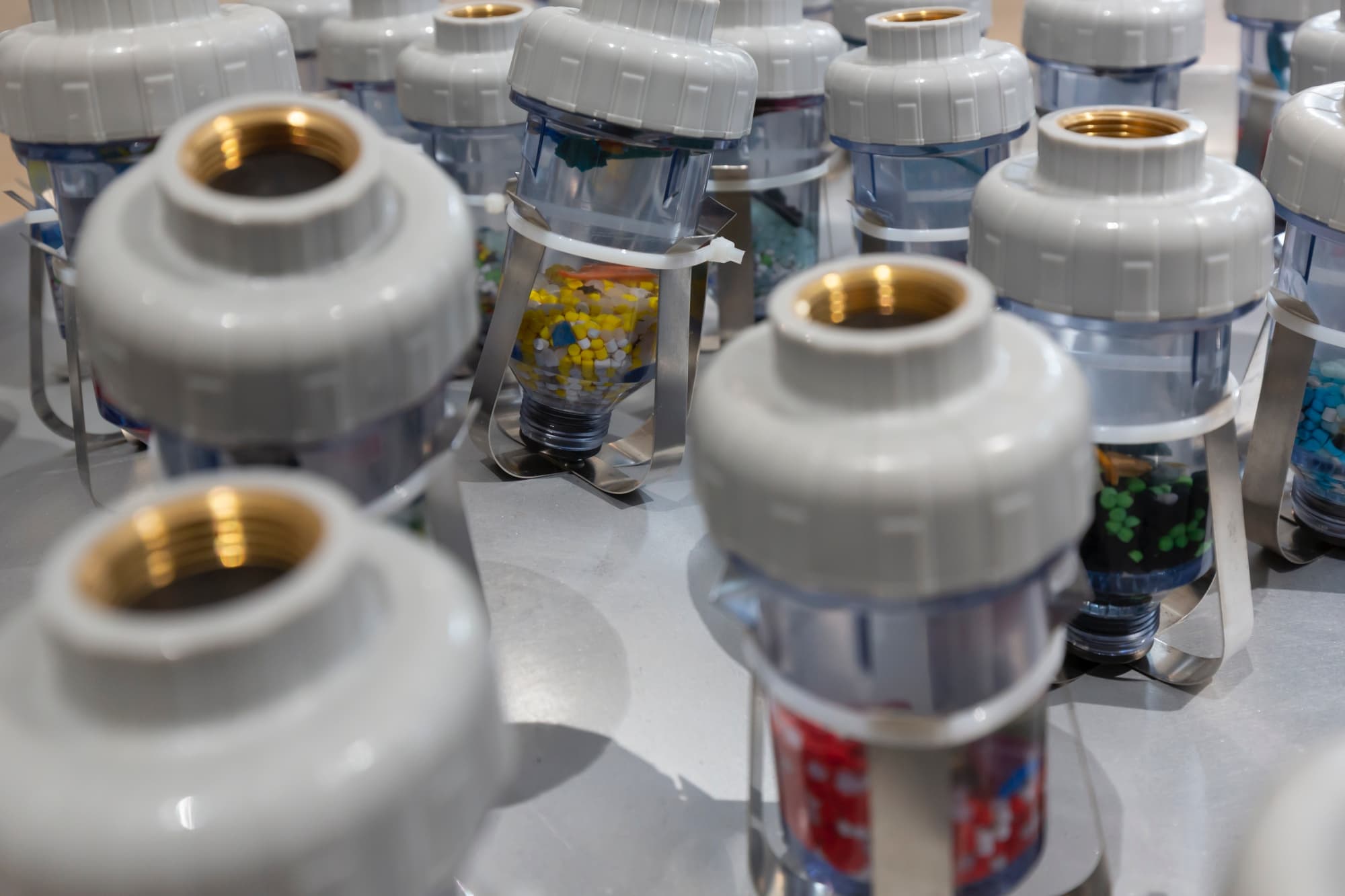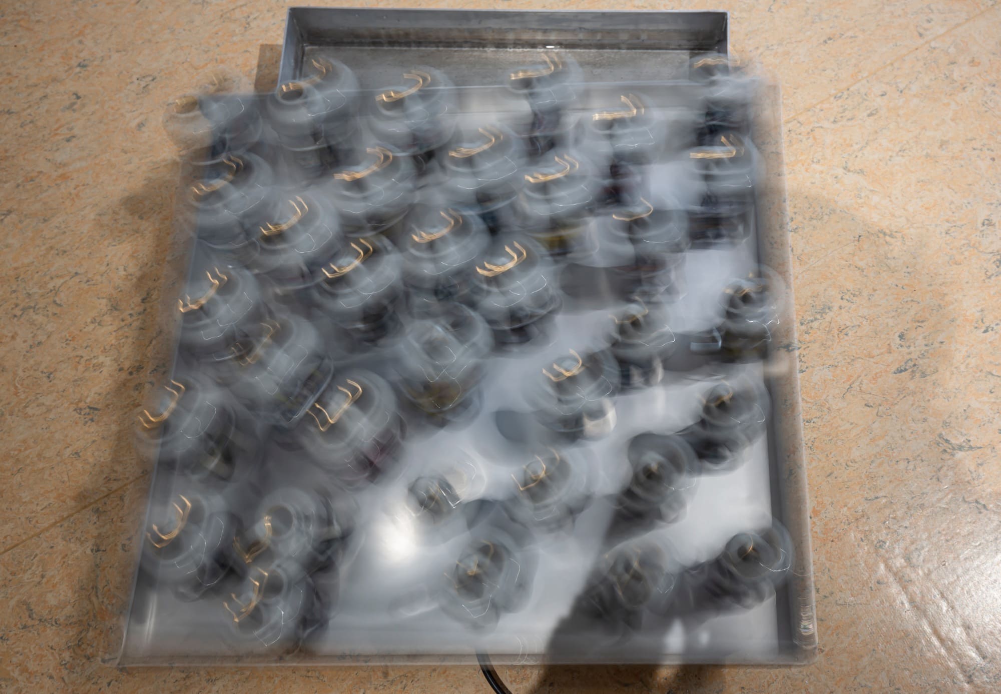 Gülşah Mursaloğlu: Devouring the Earth, in Perishable Quantities, 2020-ongoing, aluminium, washing machine filters, Arduino uno, motor, industrial and found microplastics, photo: Tim Deussen
