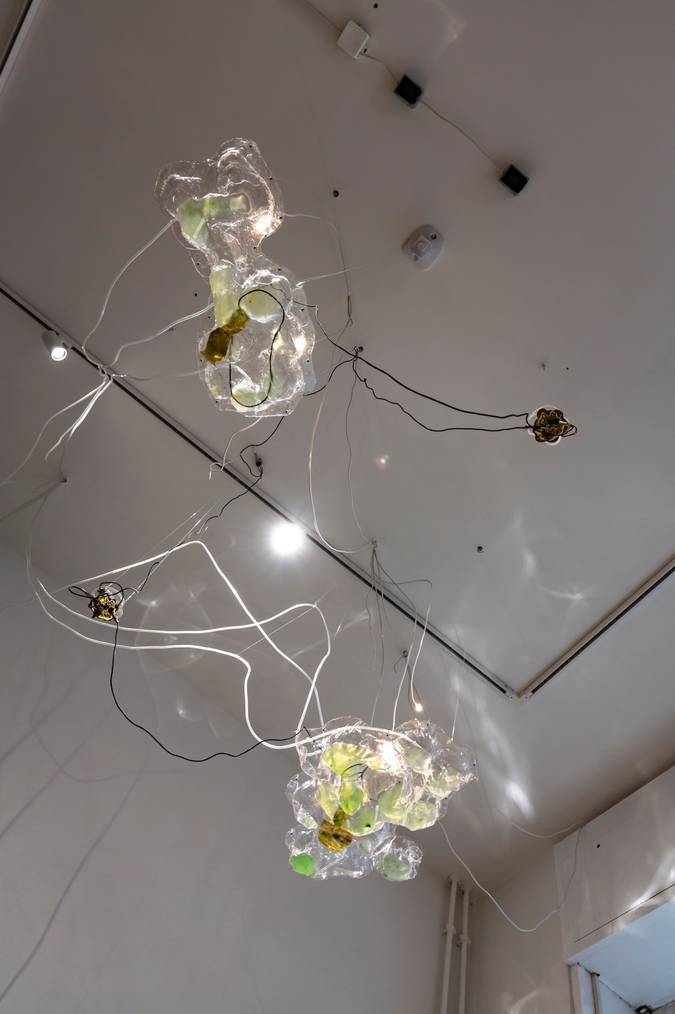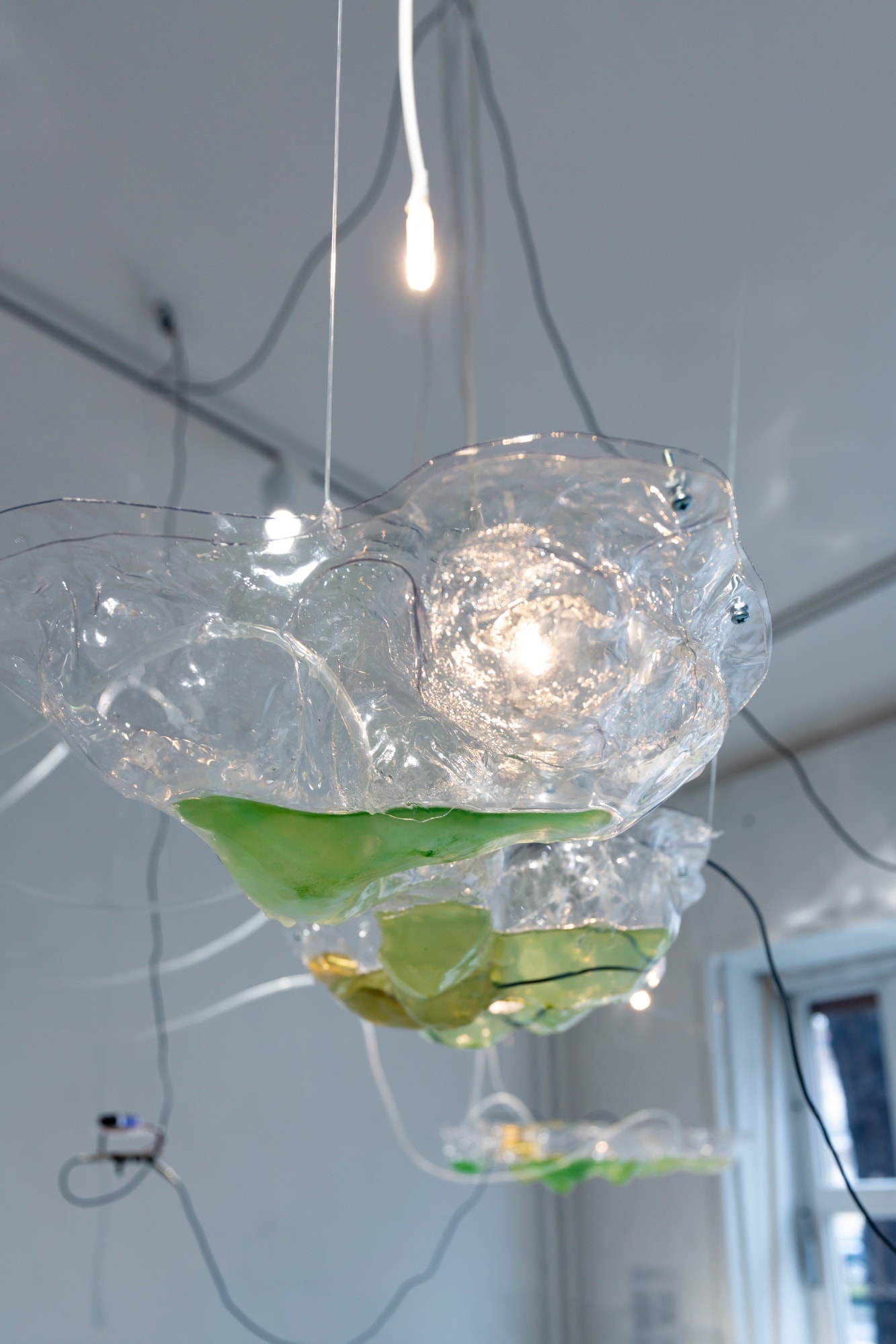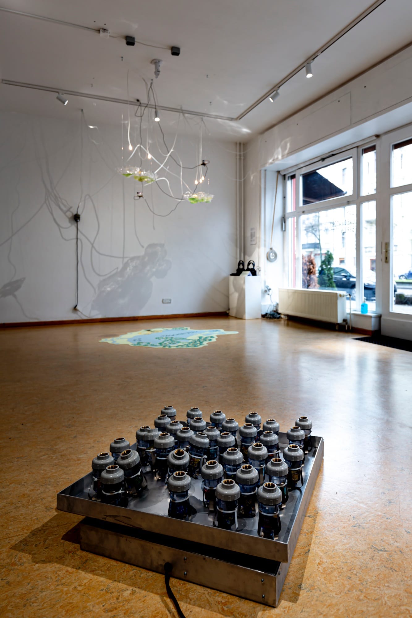 Cammack Lindsey’s Wem gehört die Welt? is a site-specific sound installation based on the artist’s ongoing research on Müggelsee Berlin that features Microcystis aeruginosa and Müggelsee water samples in amorph containers in a network in-