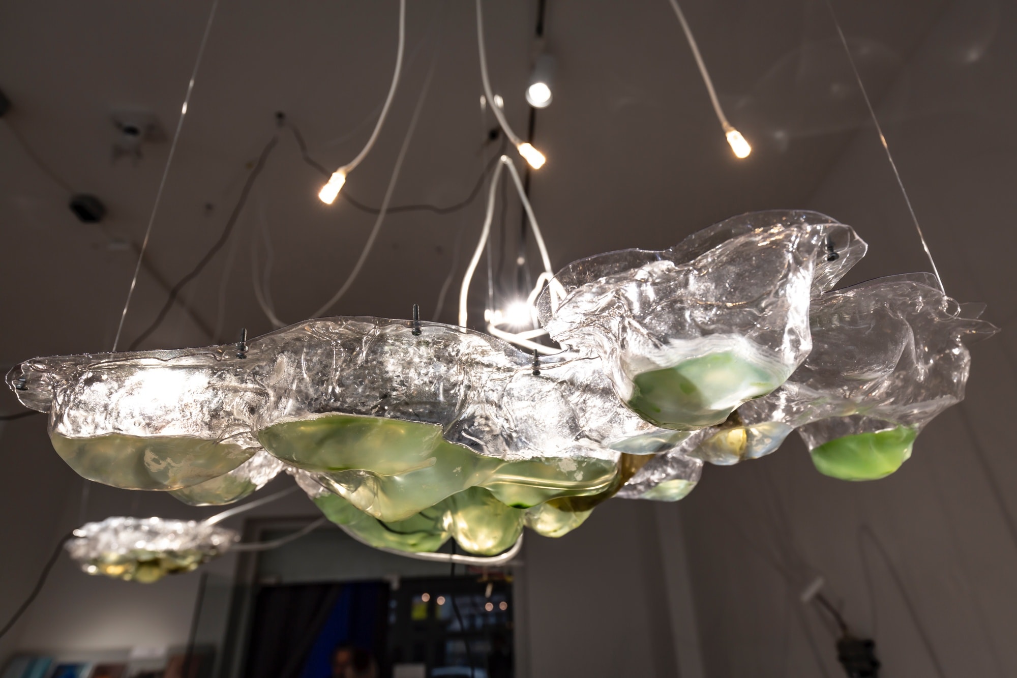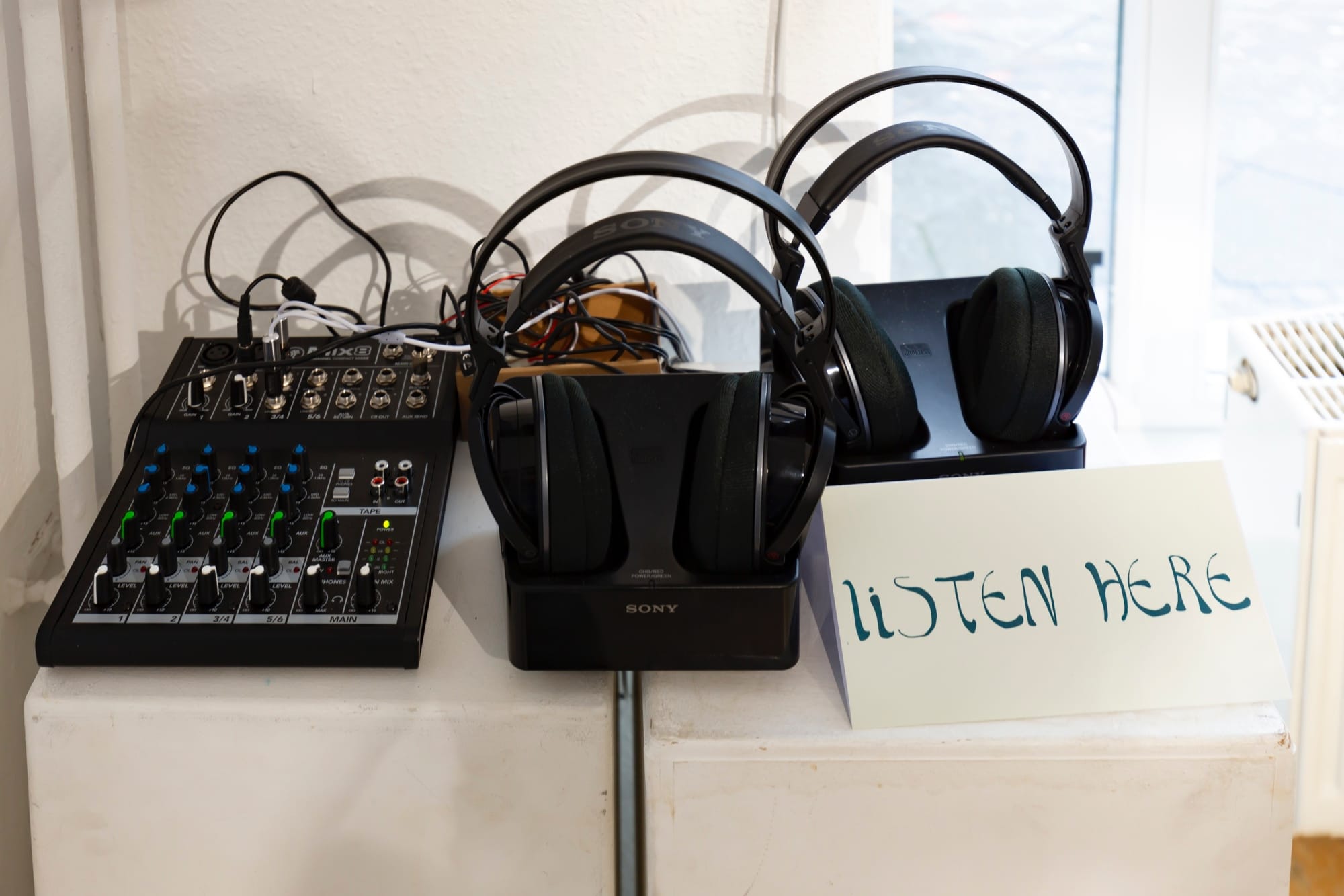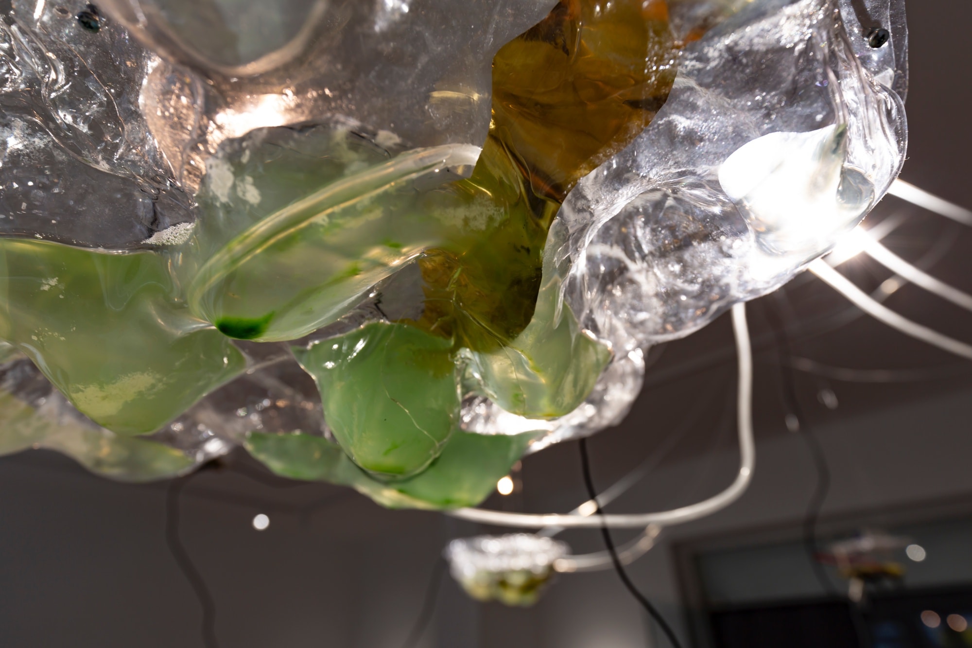Cammack Lindsey’s Wem gehört die Welt? is a site-specific sound installation based on the artist’s ongoing research on Müggelsee Berlin that features Microcystis aeruginosa and Müggelsee water samples in amorph containers in a network in-